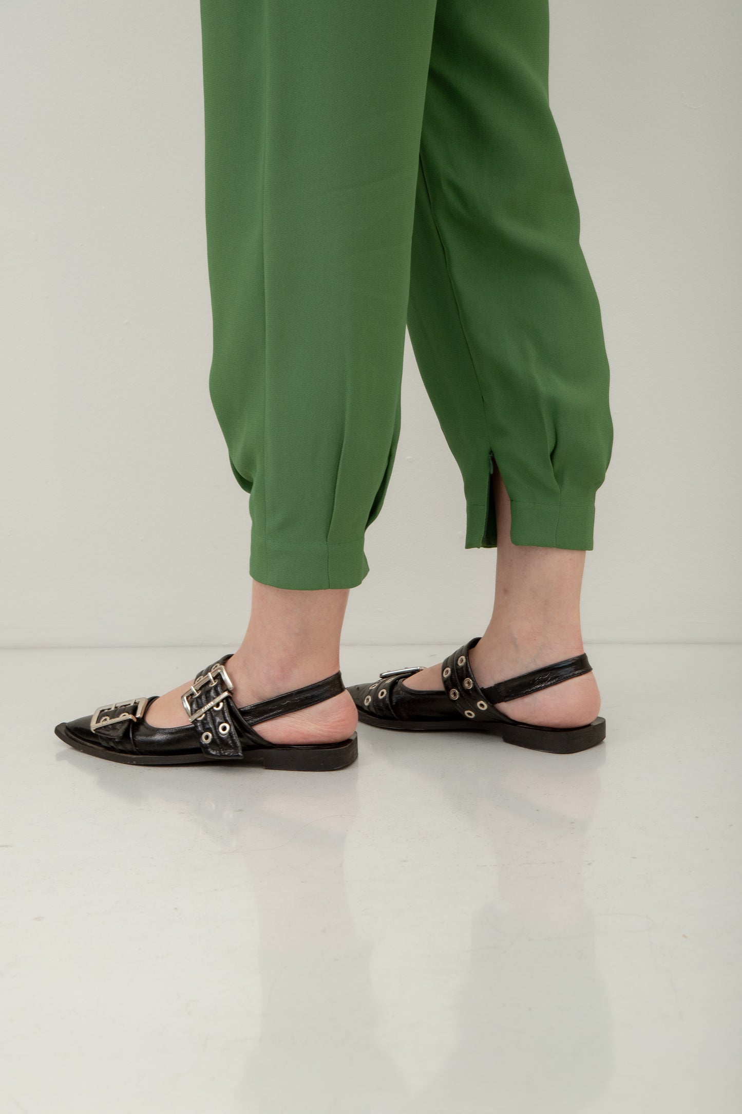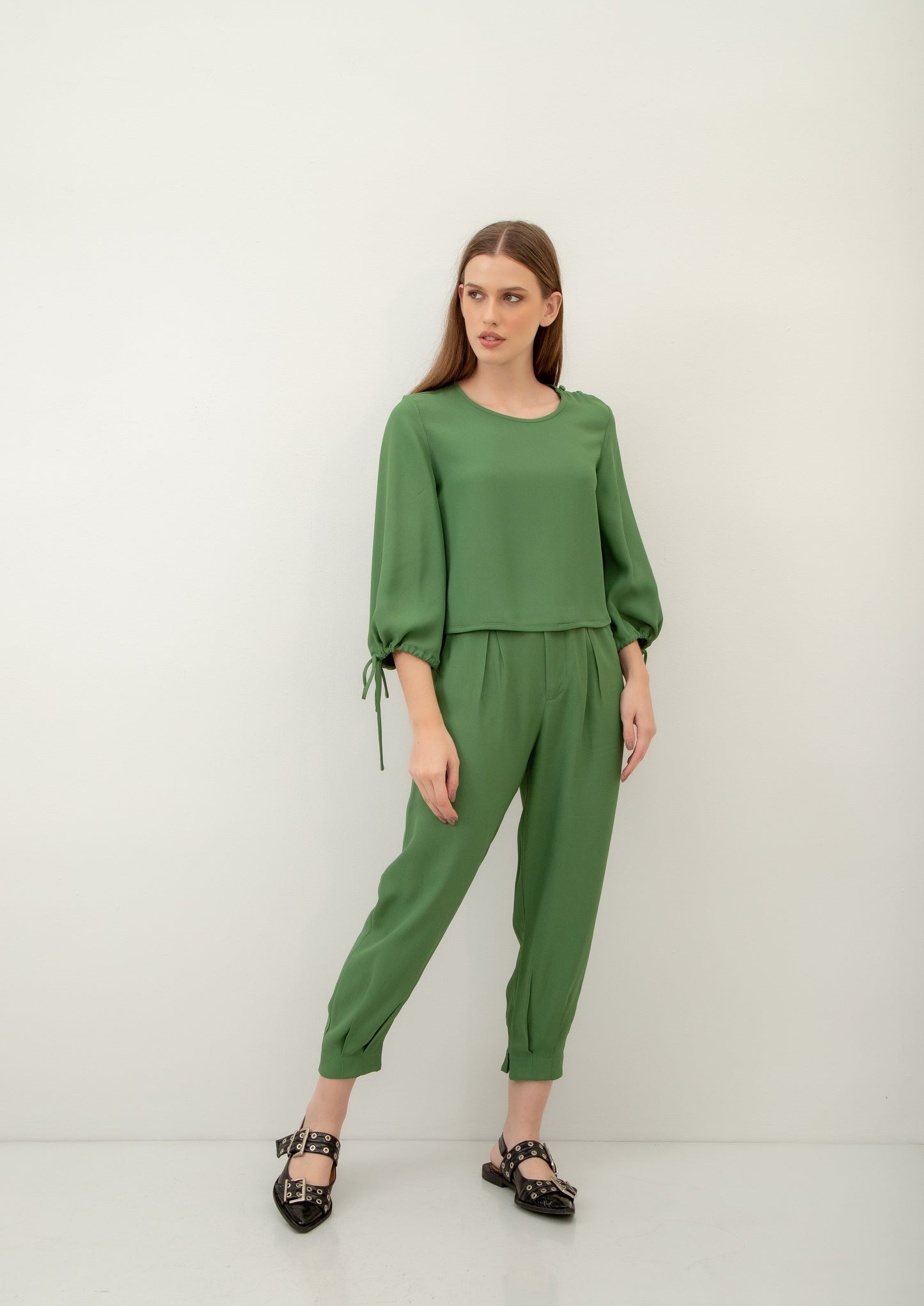 Preço regular R$ 449,00Calça confeccionada em crepe traz uma modelagem cenoura com cintura alta, possui pregas na barra e no cós, e também conta com um zíper invisível na lateral interna da perna.
