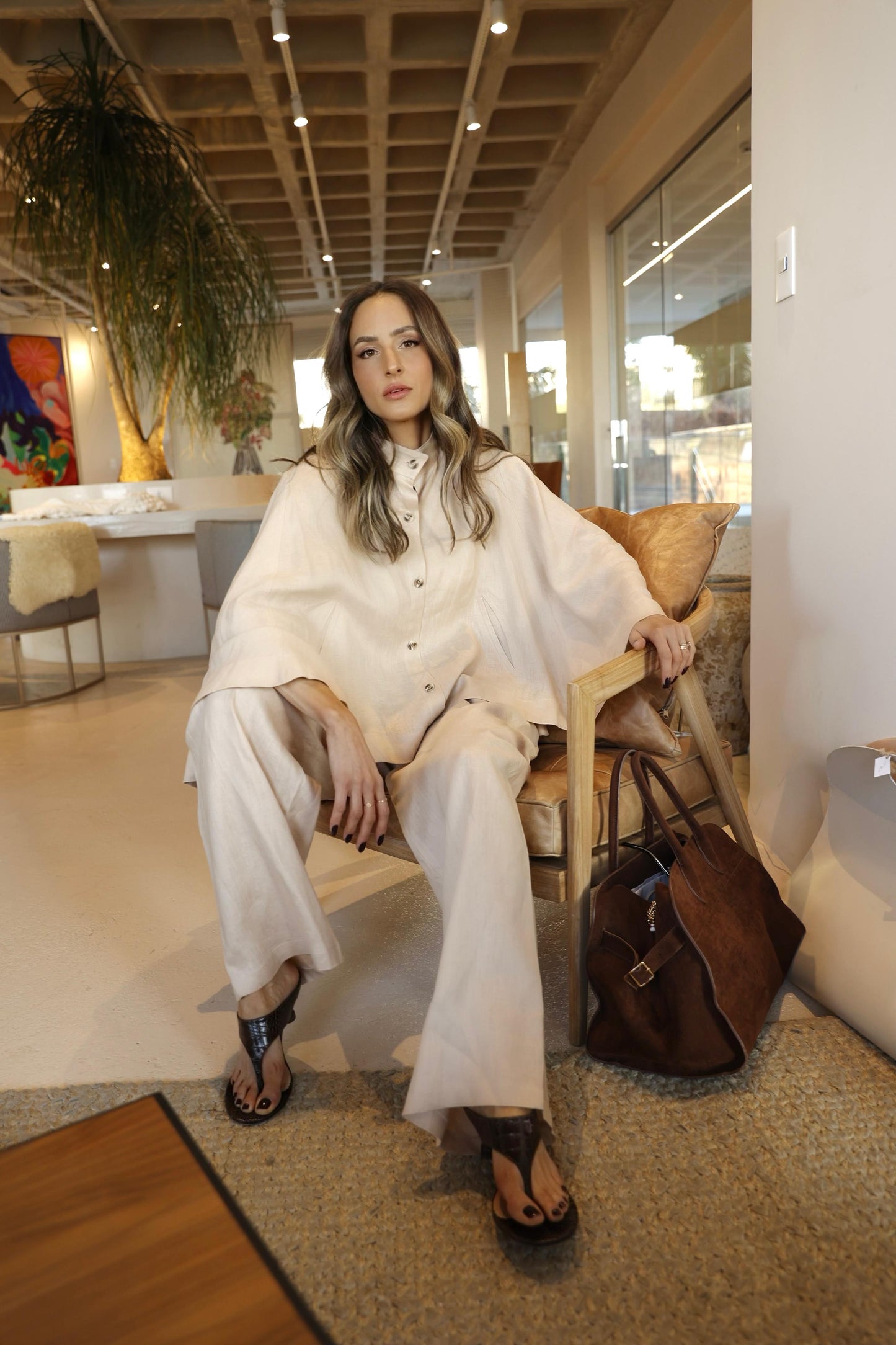 Na foto modelo está vestindo poncho tamanho único e calça P