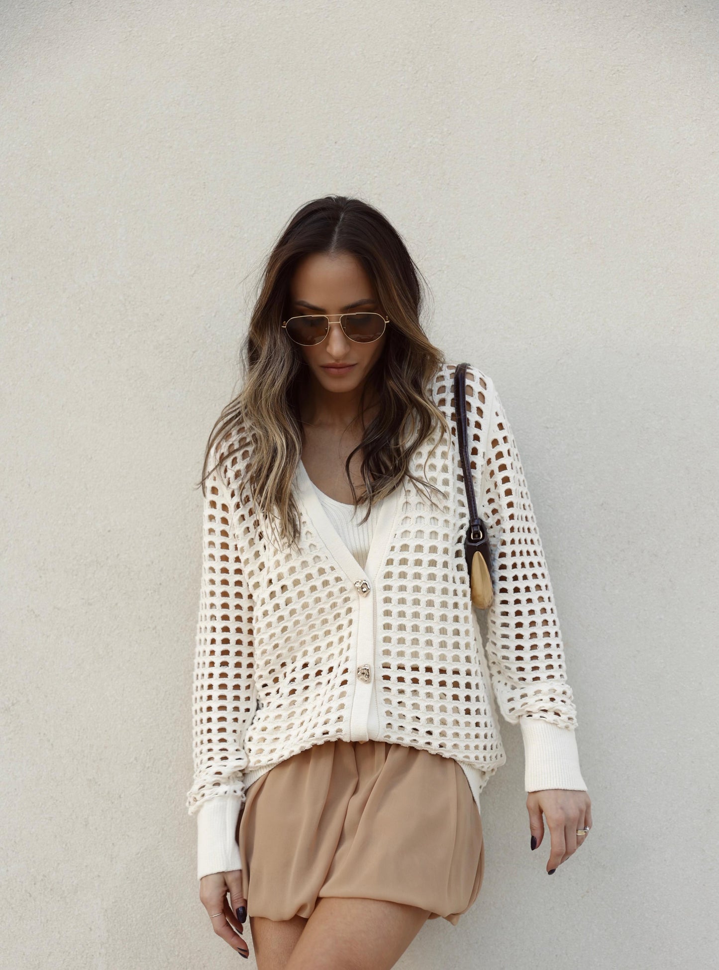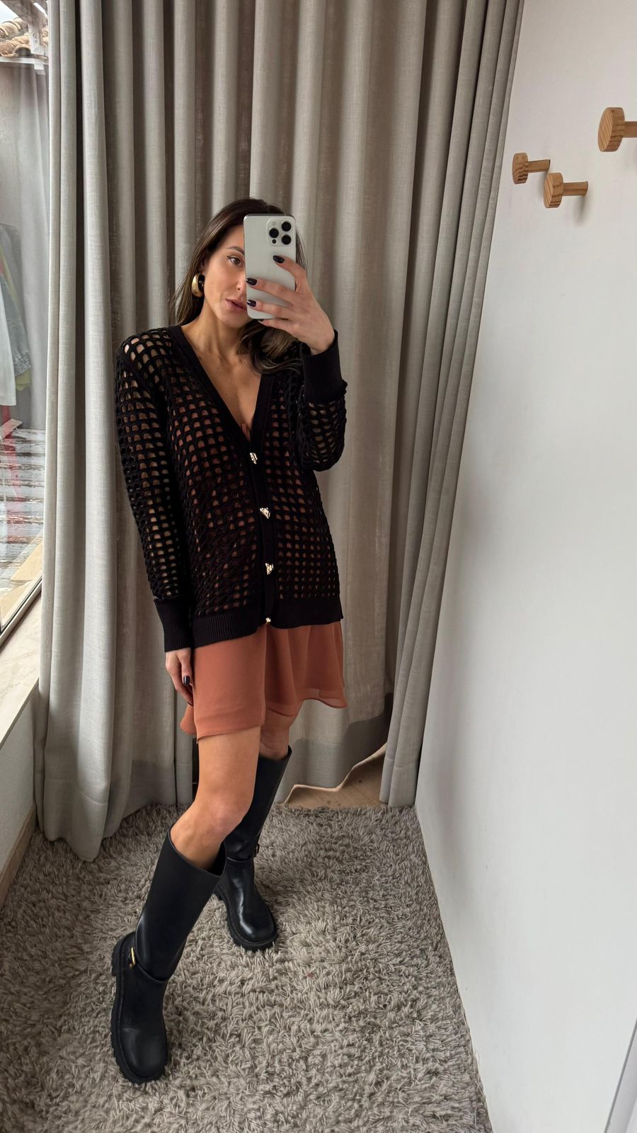Leveza e textura em harmonia perfeita. Este casaco de tricô de manga longa apresenta gola redonda e punhos delicados, com fechamento frontal por botões. Sua trama aberta, que lembra o artesanal macramê, confere um toque moderno e sofisticado, ideal para sobreposições elegantes com visual despojado e refinado.