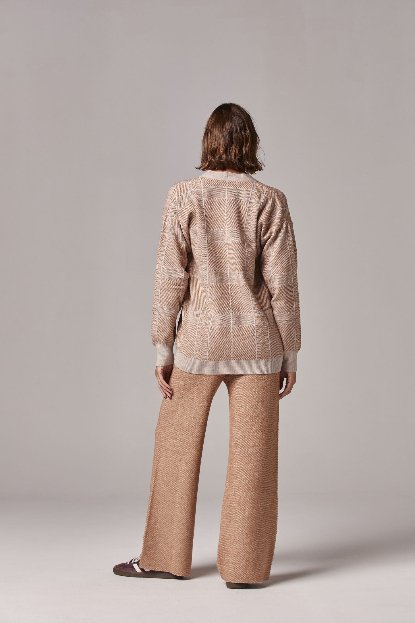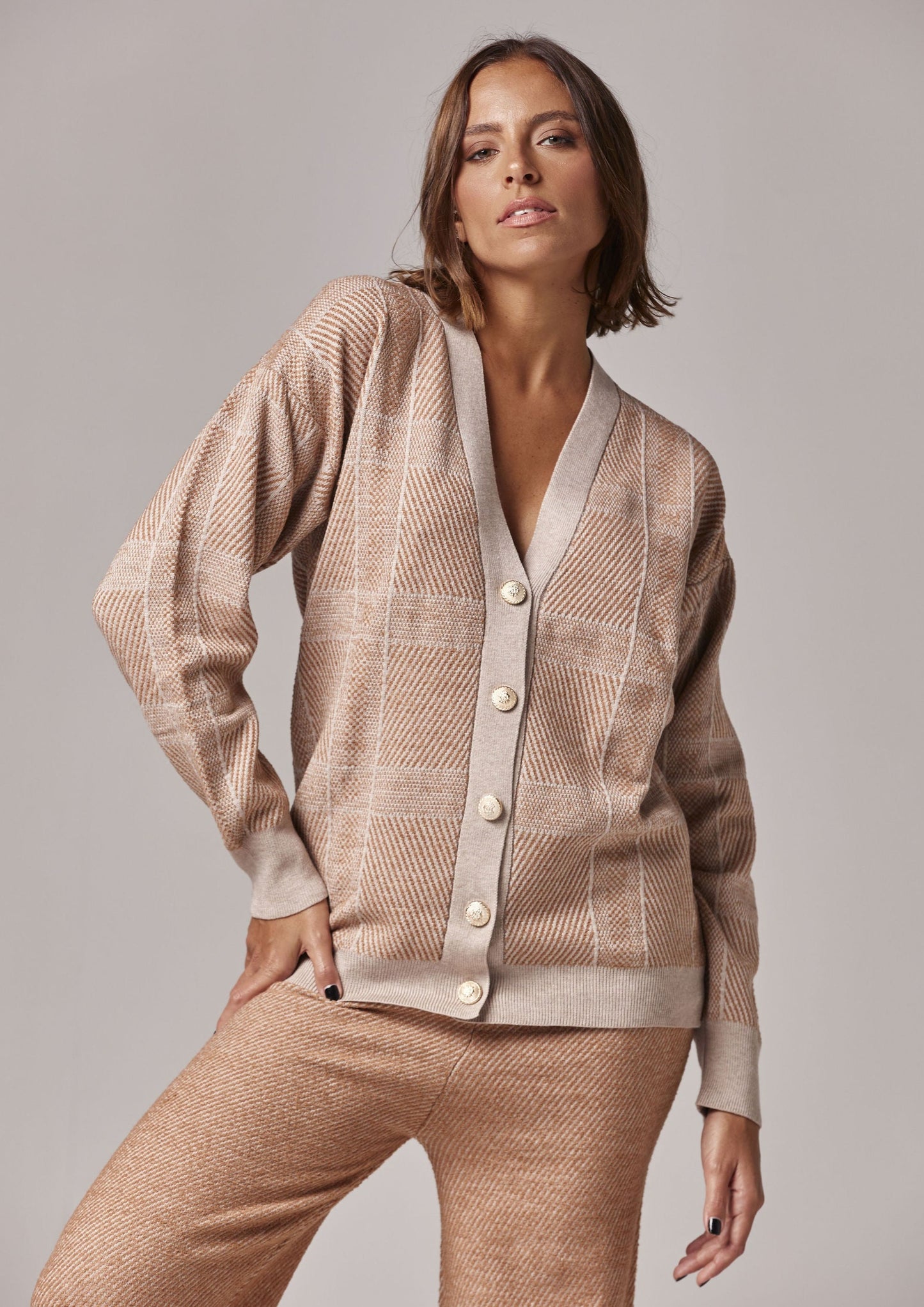 Preço regular R$ 324,50DESCRIÇÃO: Casaco em tricot xadrez, com fechamento de botões dourados.