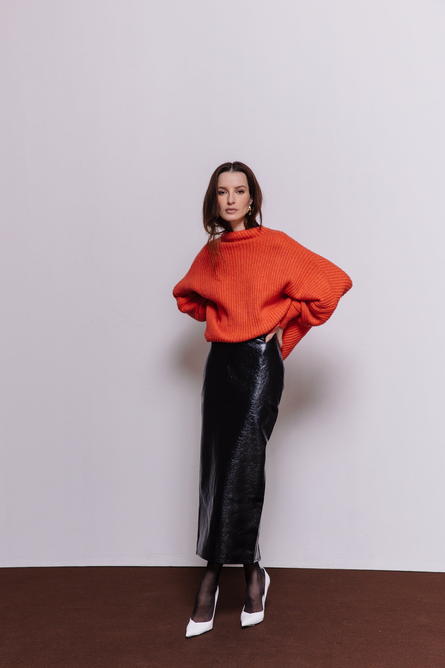 Dica de uso: Siga a proposta editorial e combine com uma saia midi de textura contrastante (como o brilho do couro ou vinil) e scarpins brancos para um look de alto impacto. Para uma versão casual, use com jeans skinny ou legging de couro para equilibrar os volumes.