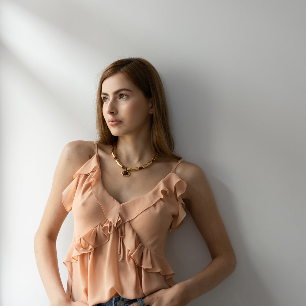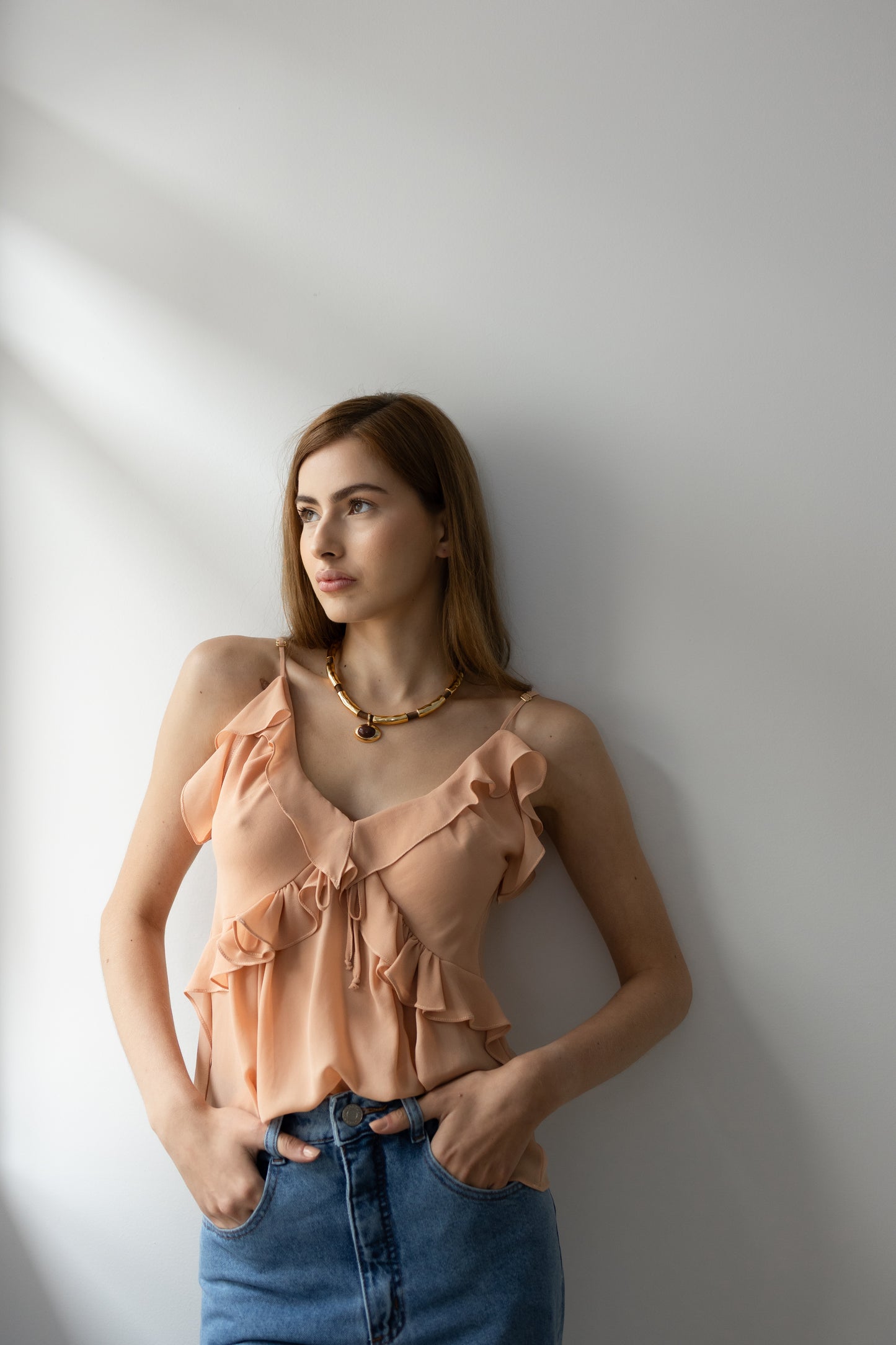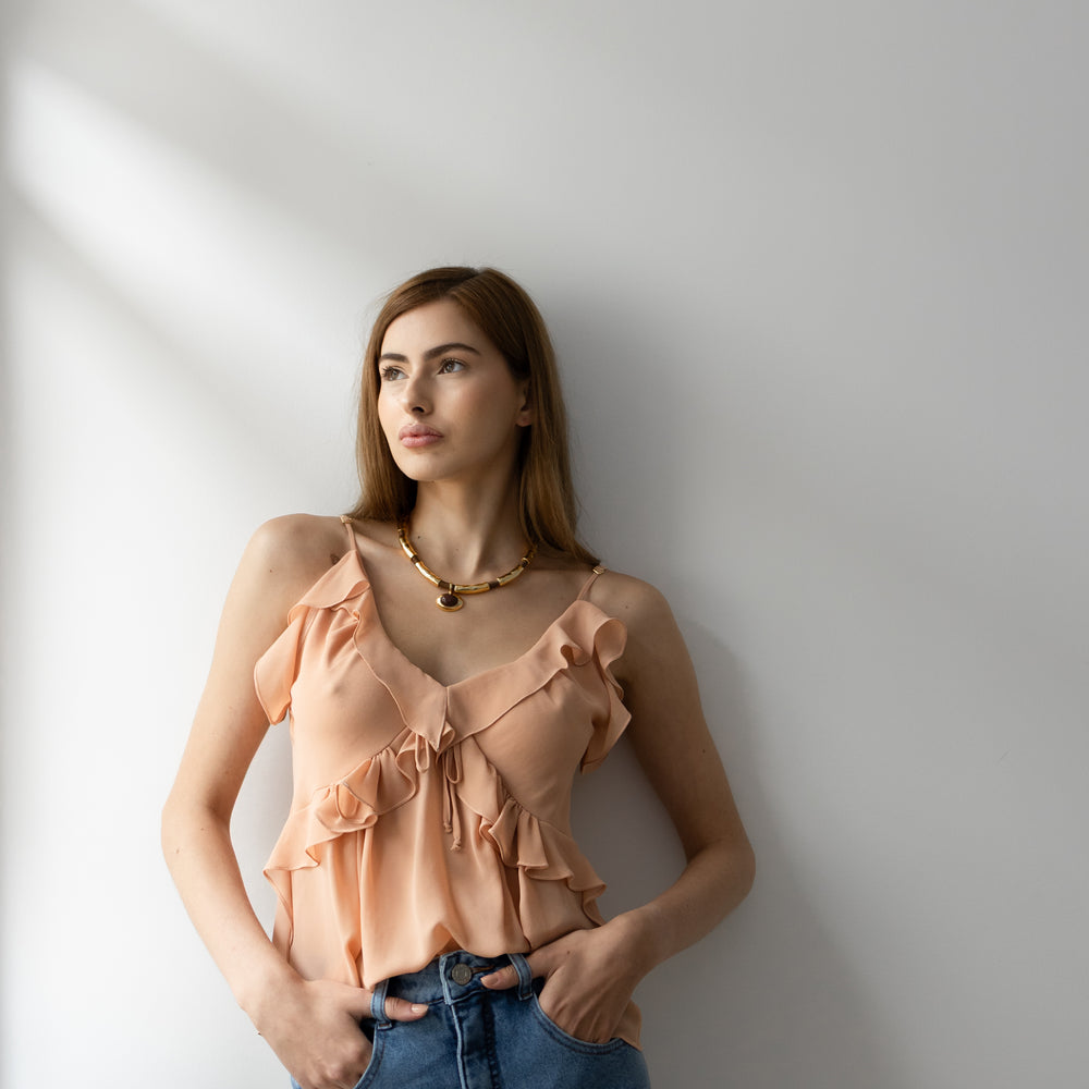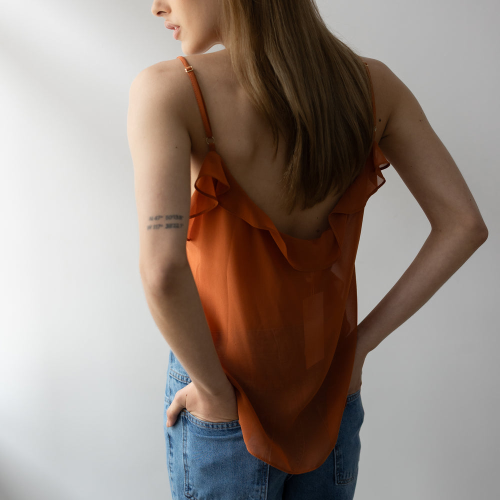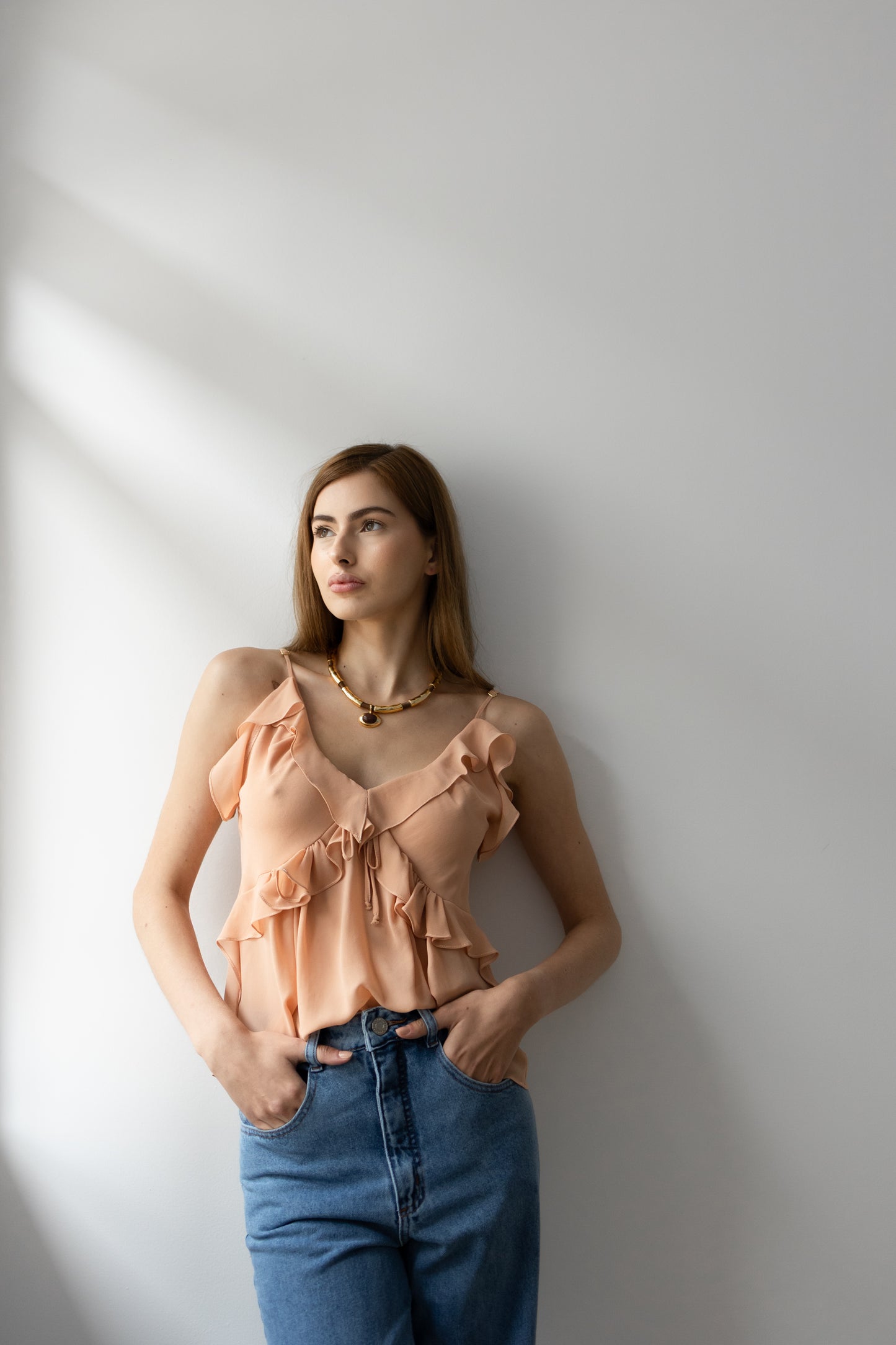 Romântica e leve, essa regata é perfeita para compor looks delicados com um toque de charme. Com alças finas e babado no decote, ela ganha ainda mais feminilidade com o detalhe franzido abaixo do busto e cordinha para amarração, que permite ajustar o caimento ao corpo. Ideal para dias quentes, combina perfeitamente com saias, calças de cintura alta ou shorts, criando produções frescas e cheias de estilo.