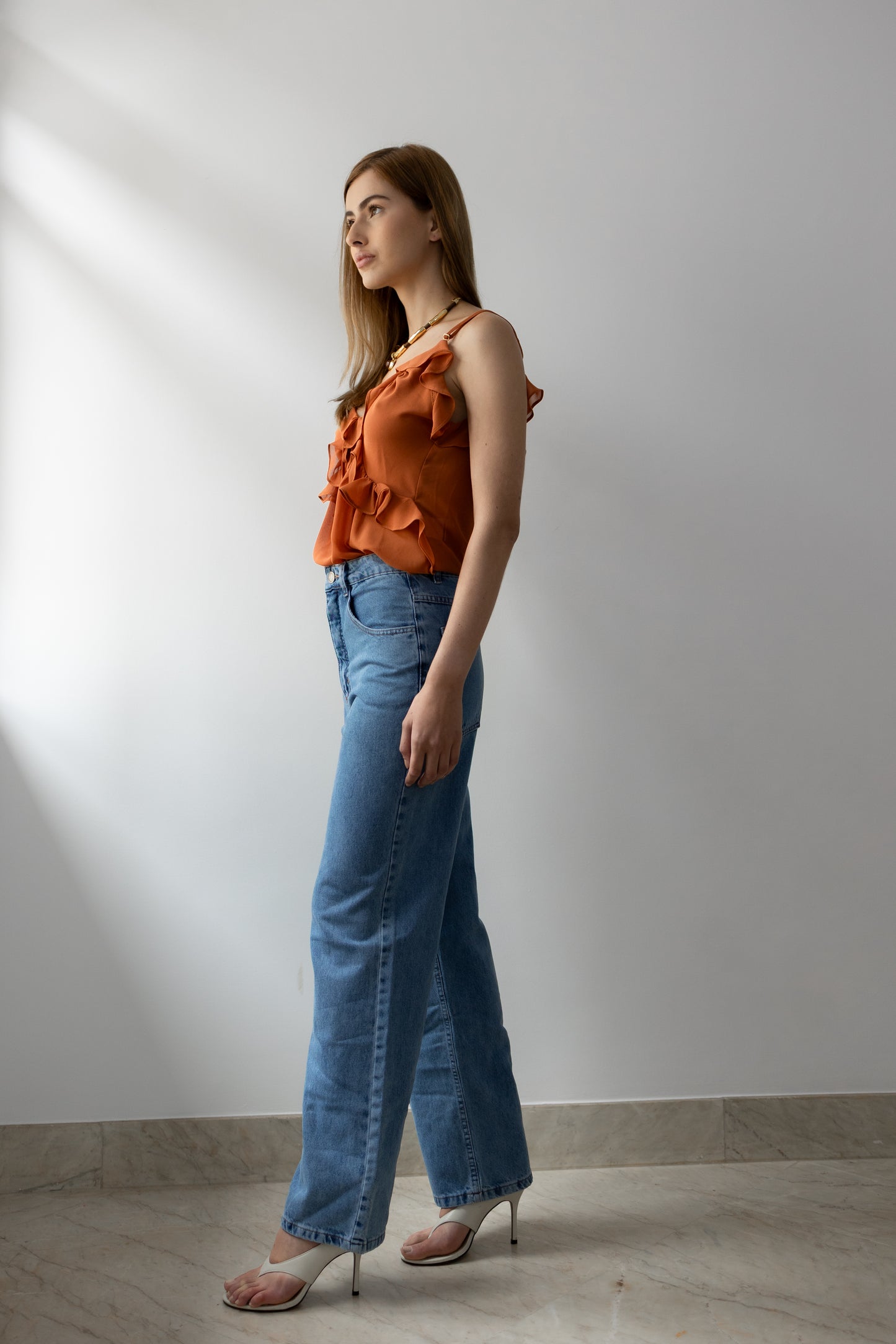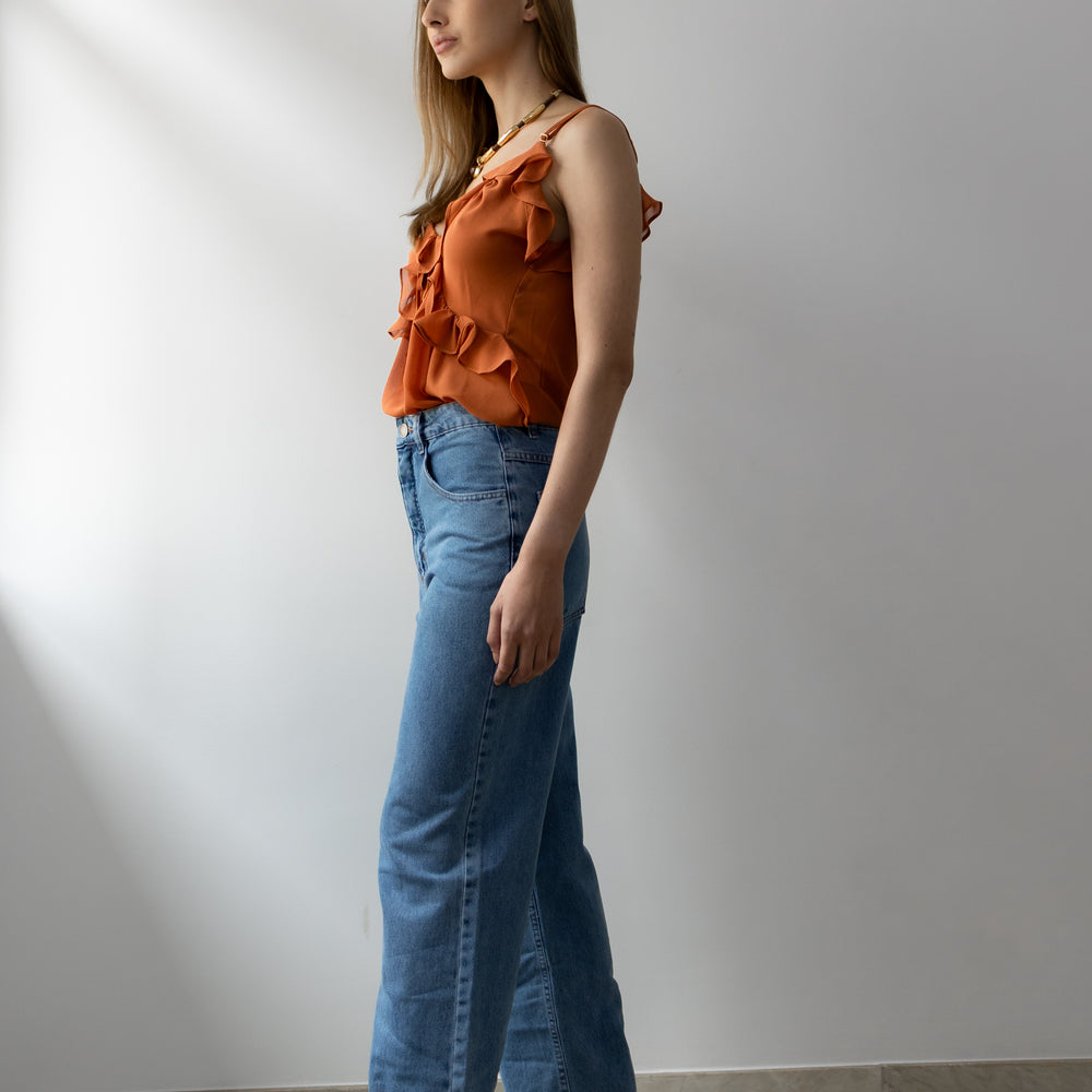 Com corte reto e cintura no lugar, a calça jeans revela a força do essencial. A silhueta clássica valoriza o corpo com naturalidade, enquanto o denim estruturado garante presença sem perder o conforto.