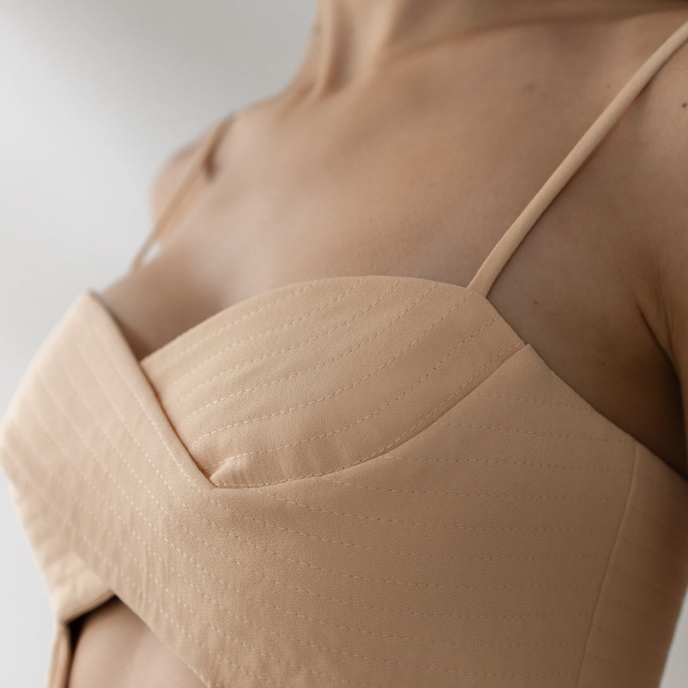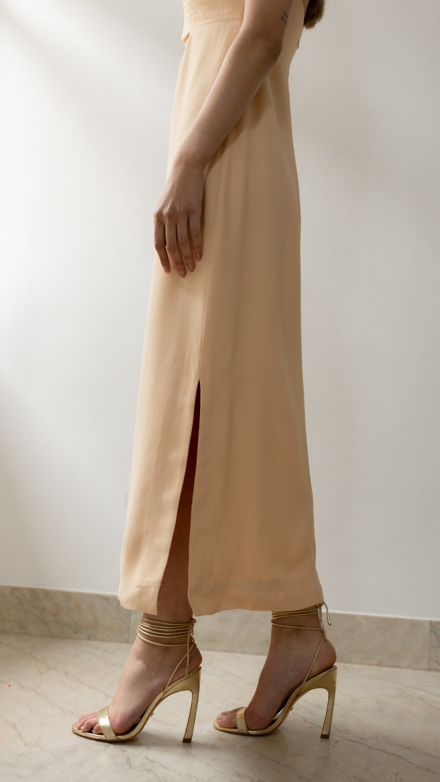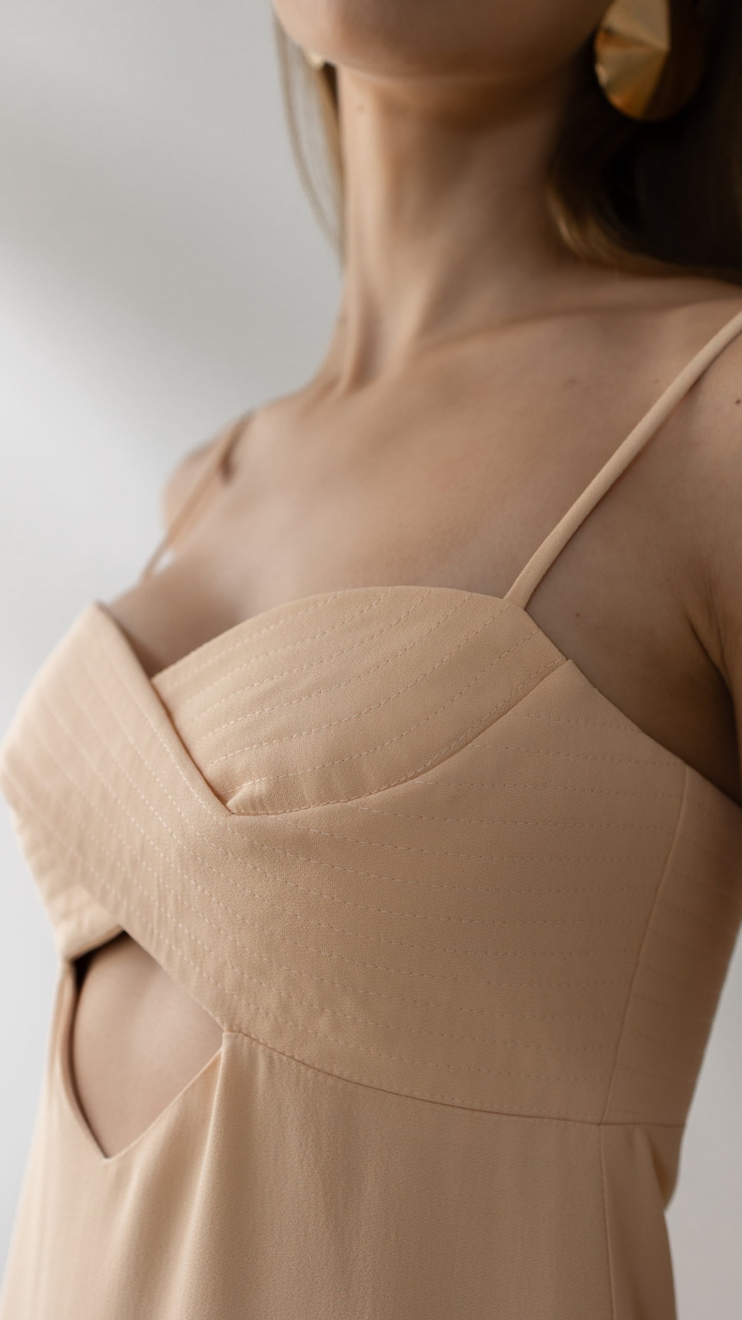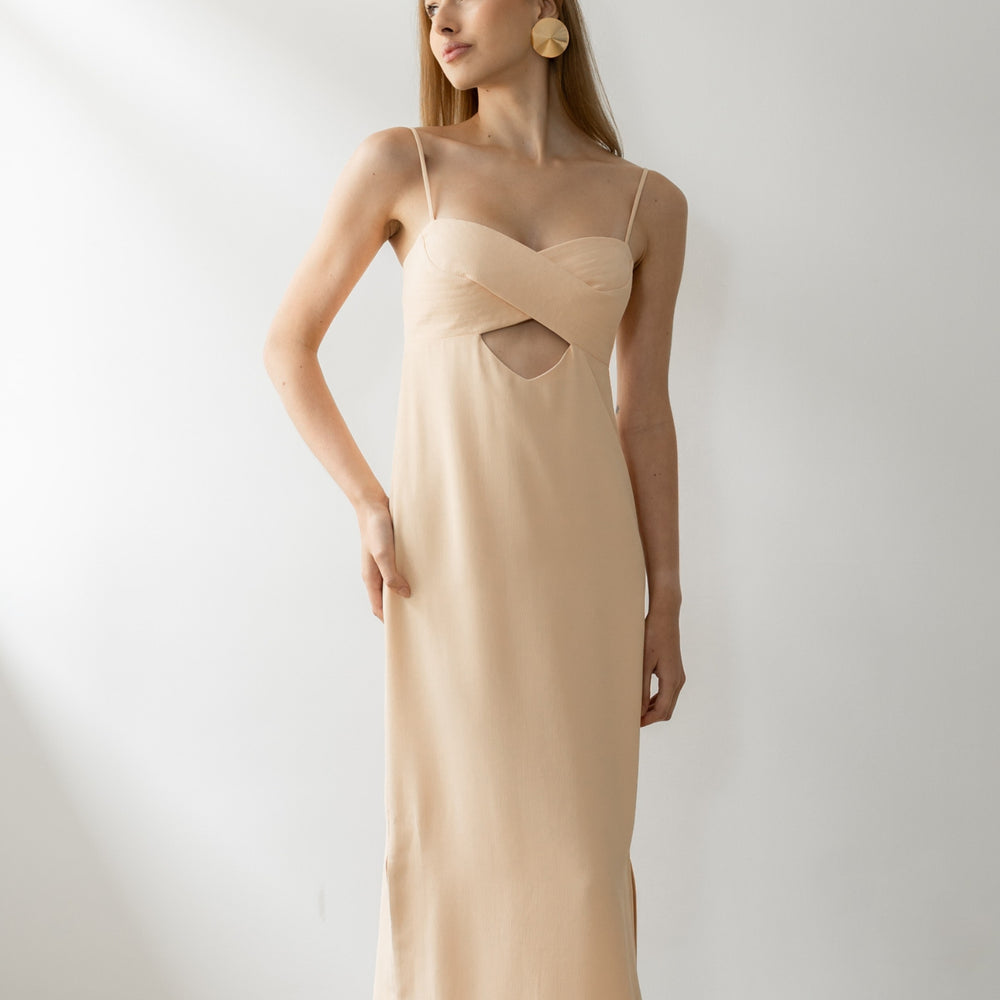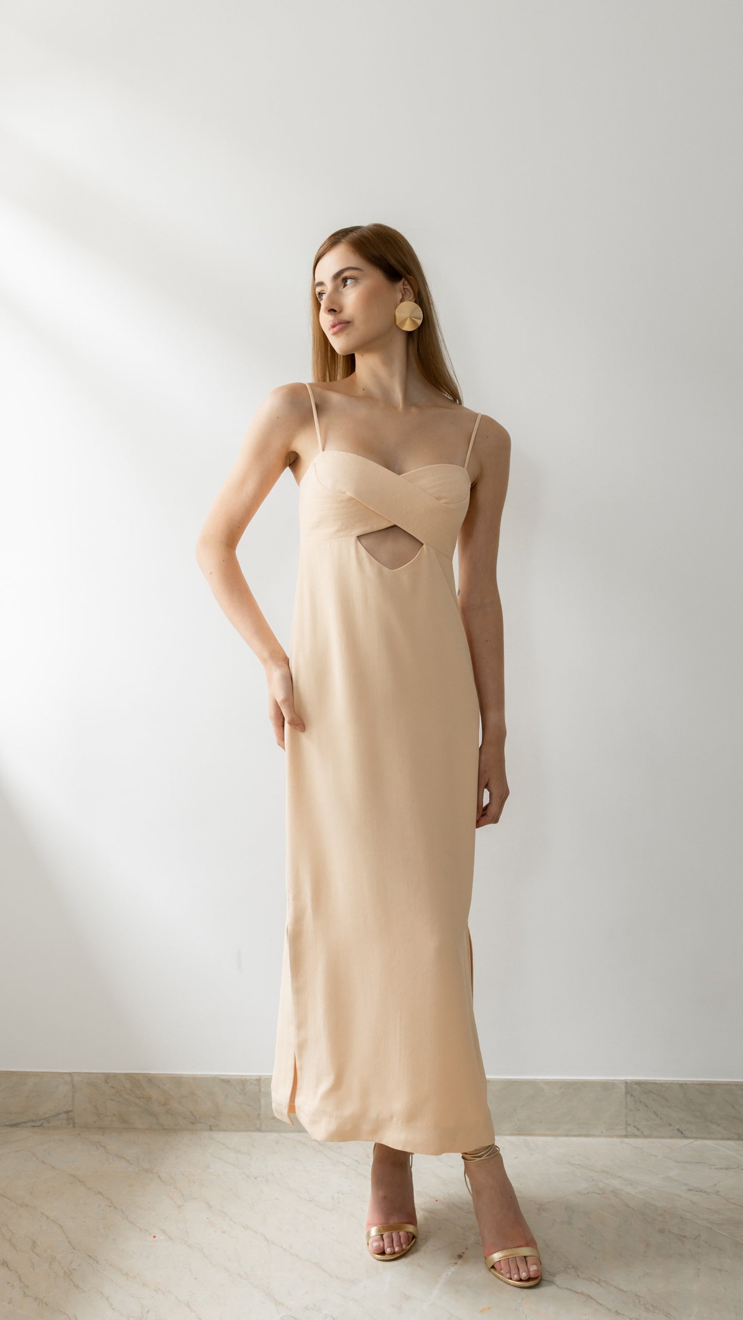 Vestido midi com caimento fluido que desliza delicadamente pelo corpo, evidenciando uma silhueta elegante e moderna. O destaque fica para o busto com design entrelaçado e recorte geométrico estratégico, que imprime um toque de ousadia sofisticada, enquanto as alças finas adicionam leveza e feminilidade. As fendas laterais complementam o visual, trazendo movimento e sensualidade sutil, perfeito para ocasiões especiais que pedem charme e presença marcante.