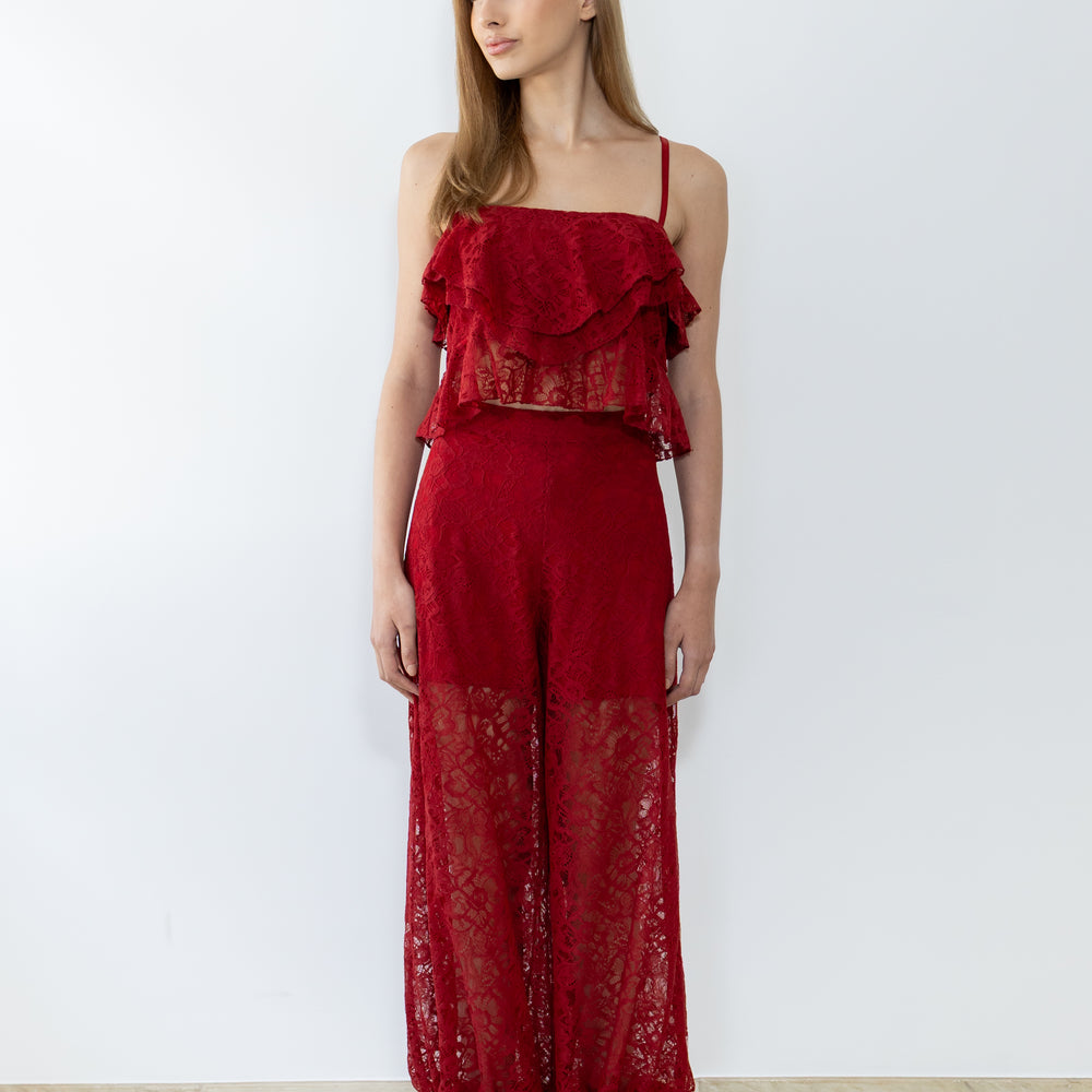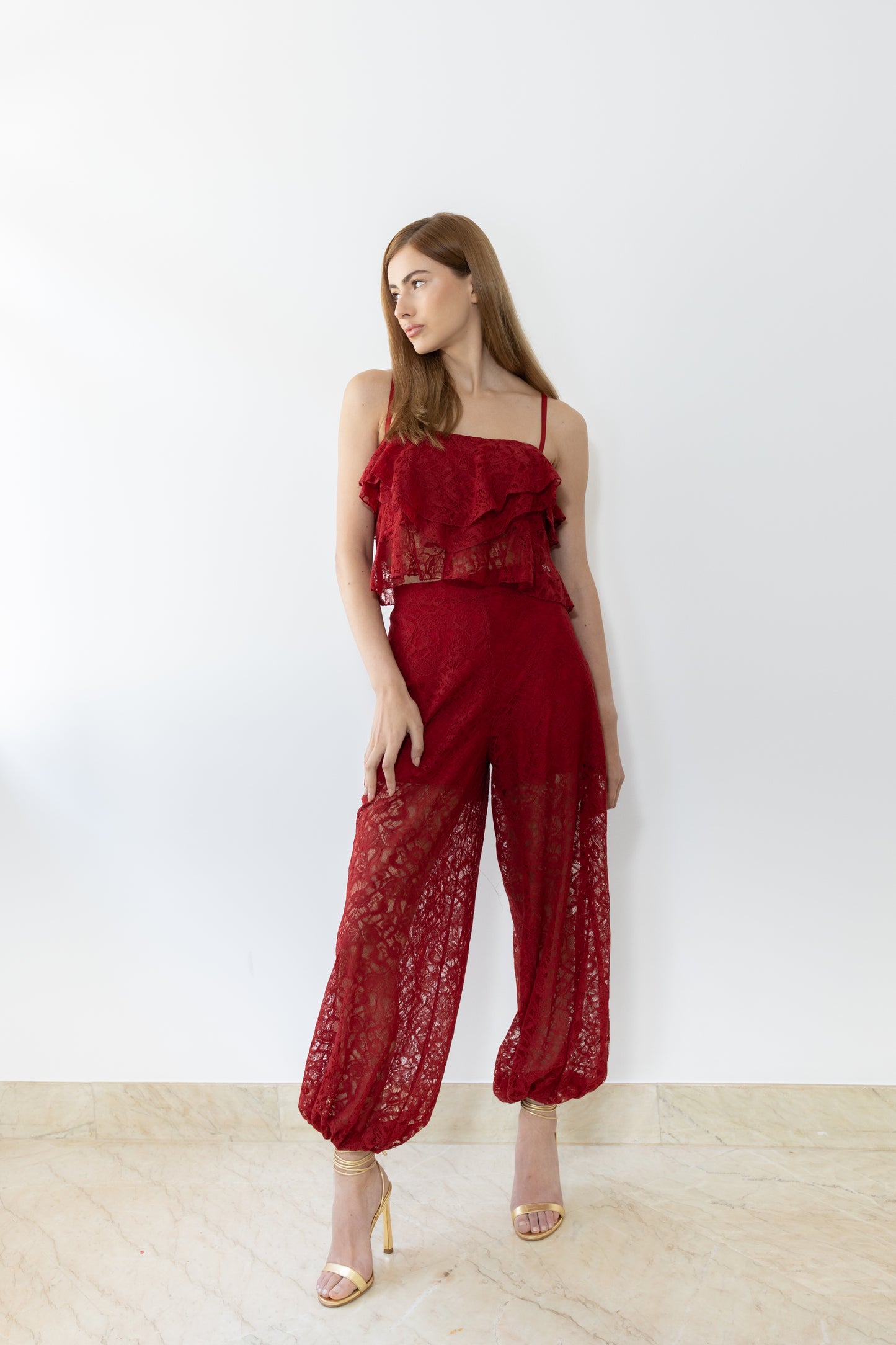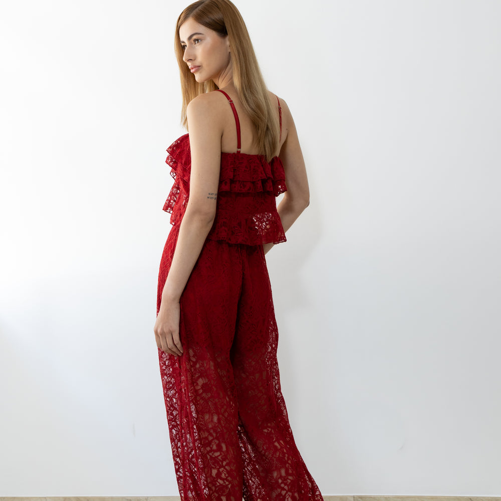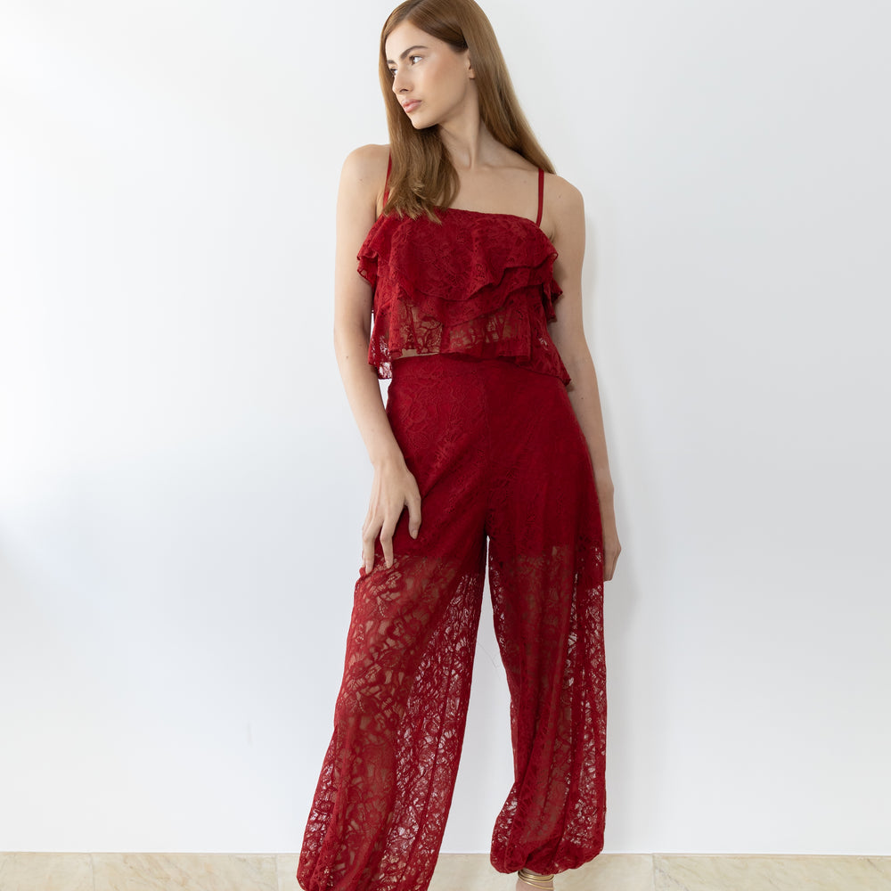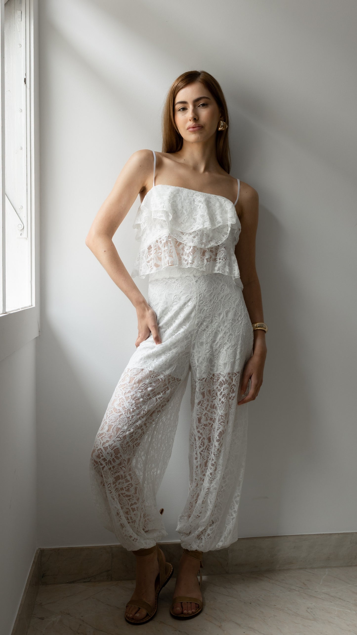 Exalando sofisticação e leveza, o Conjunto é a união perfeita entre delicadeza e personalidade. Confeccionado em renda estruturada de toque macio, o modelo apresenta top com alças finas e caimento fluido, adornado por babado frontal que traz movimento e charme à composição. O fechamento em zíper posterior garante ajuste impecável ao corpo. A calça estilo Aladim confere um ar contemporâneo e despojado à proposta, com cintura marcada, forro fixo até a altura das coxas — proporcionando conforto e segurança — e transparência sutil na barra, revelando a renda em sua forma mais pura. O fechamento lateral por zíper invisível mantém a estética refinada do conjunto. Perfeito para ocasiões onde o casual chic é palavra de ordem, este look transita com naturalidade entre o dia e a noite.