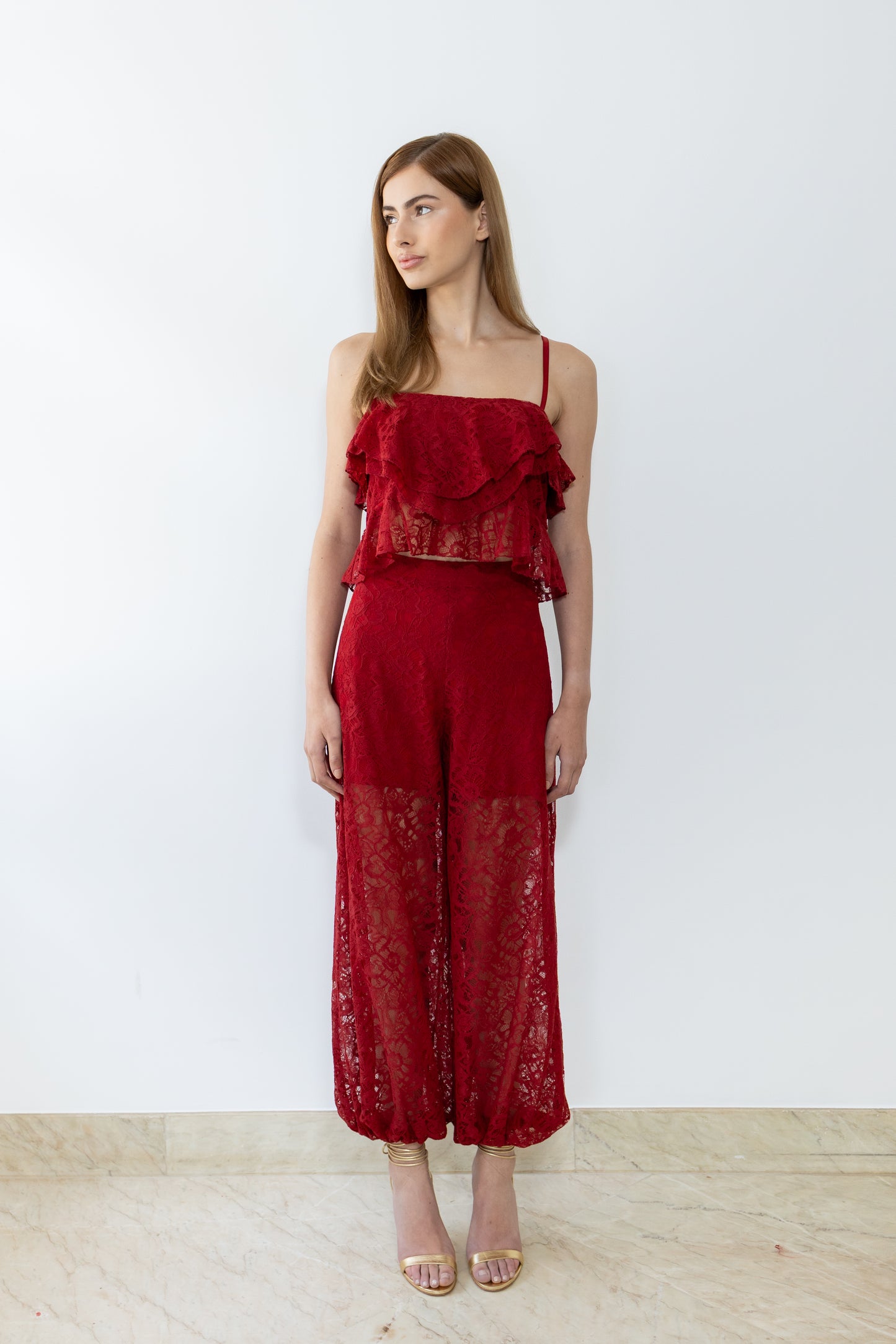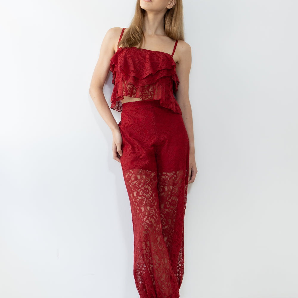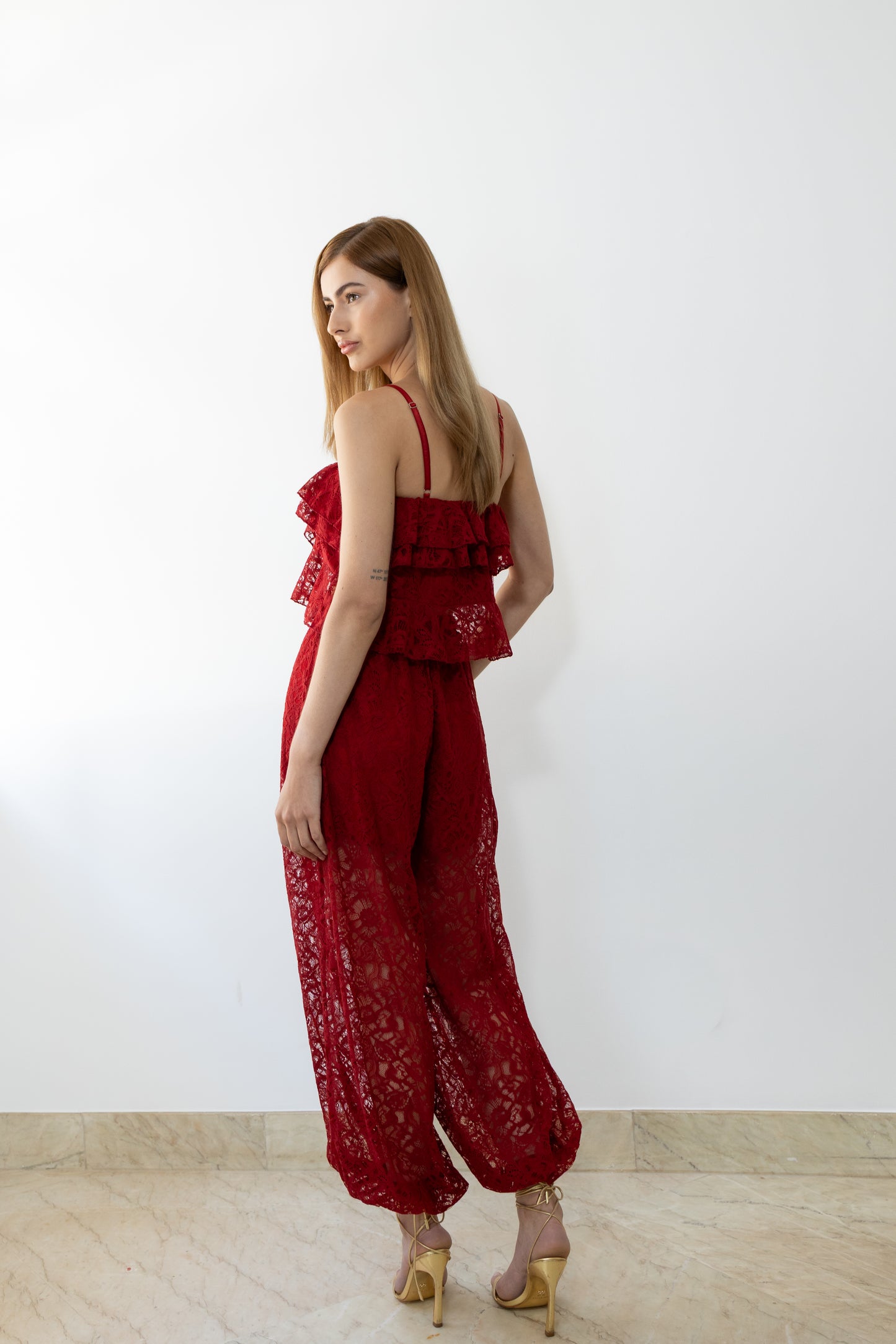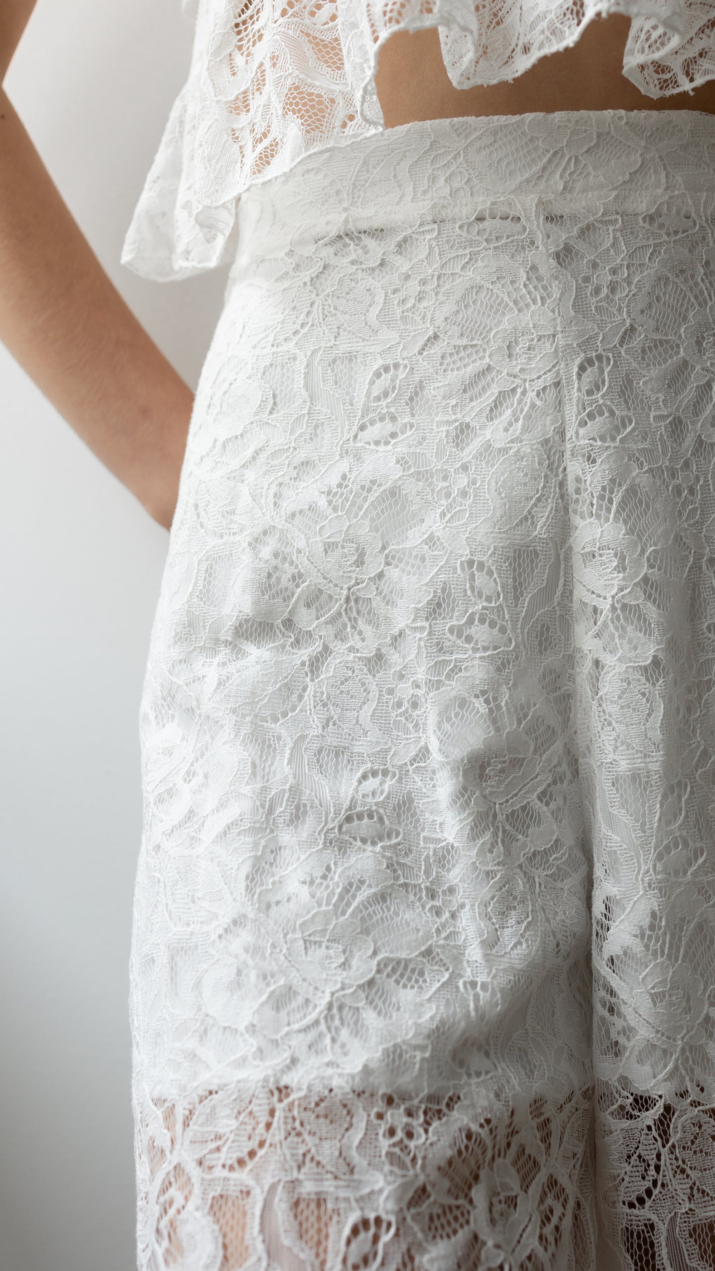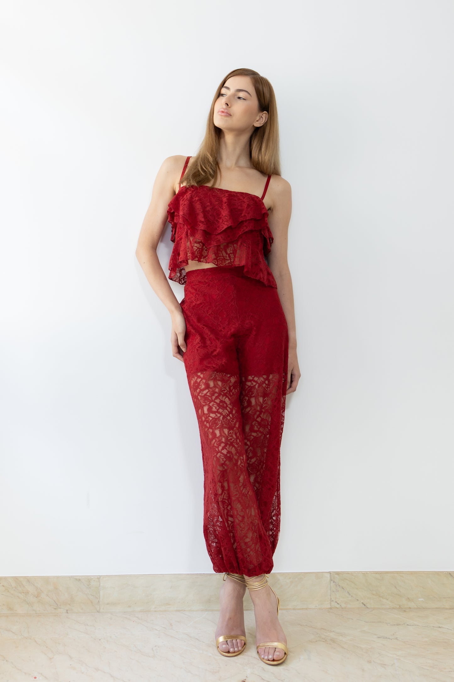 Exalando sofisticação e leveza, o Conjunto é a união perfeita entre delicadeza e personalidade. Confeccionado em renda estruturada de toque macio, o modelo apresenta top com alças finas e caimento fluido, adornado por babado frontal que traz movimento e charme à composição. O fechamento em zíper posterior garante ajuste impecável ao corpo. A calça estilo Aladim confere um ar contemporâneo e despojado à proposta, com cintura marcada, forro fixo até a altura das coxas — proporcionando conforto e segurança — e transparência sutil na barra, revelando a renda em sua forma mais pura. O fechamento lateral por zíper invisível mantém a estética refinada do conjunto. Perfeito para ocasiões onde o casual chic é palavra de ordem, este look transita com naturalidade entre o dia e a noite.