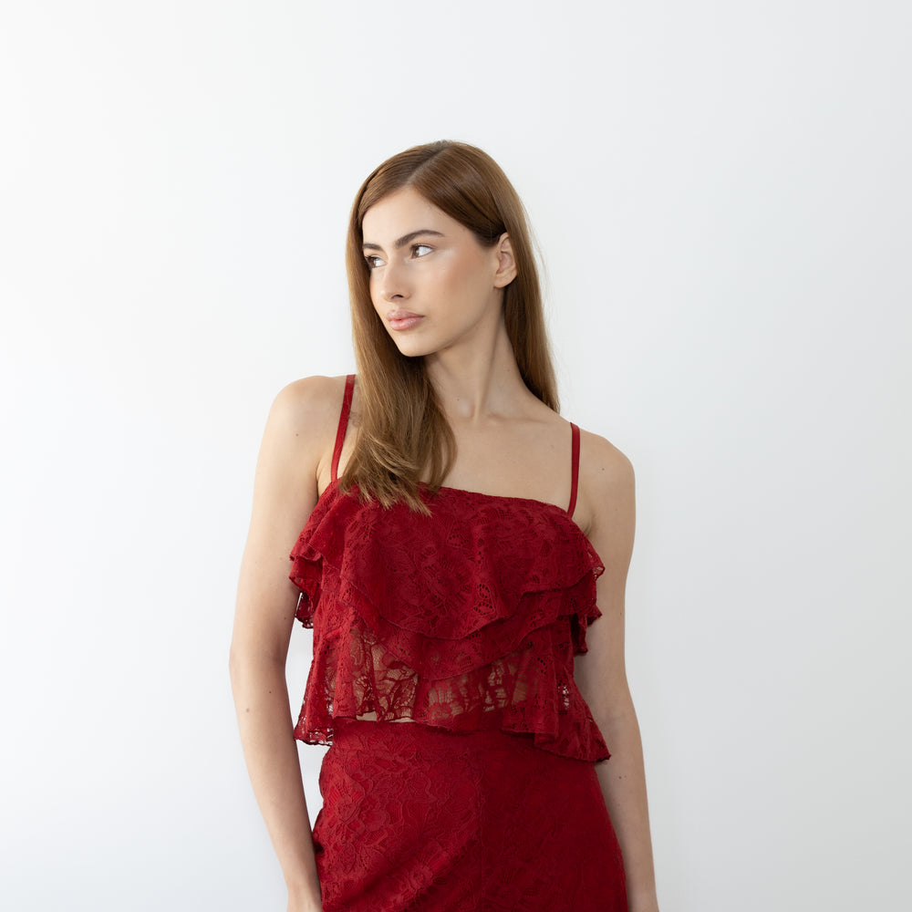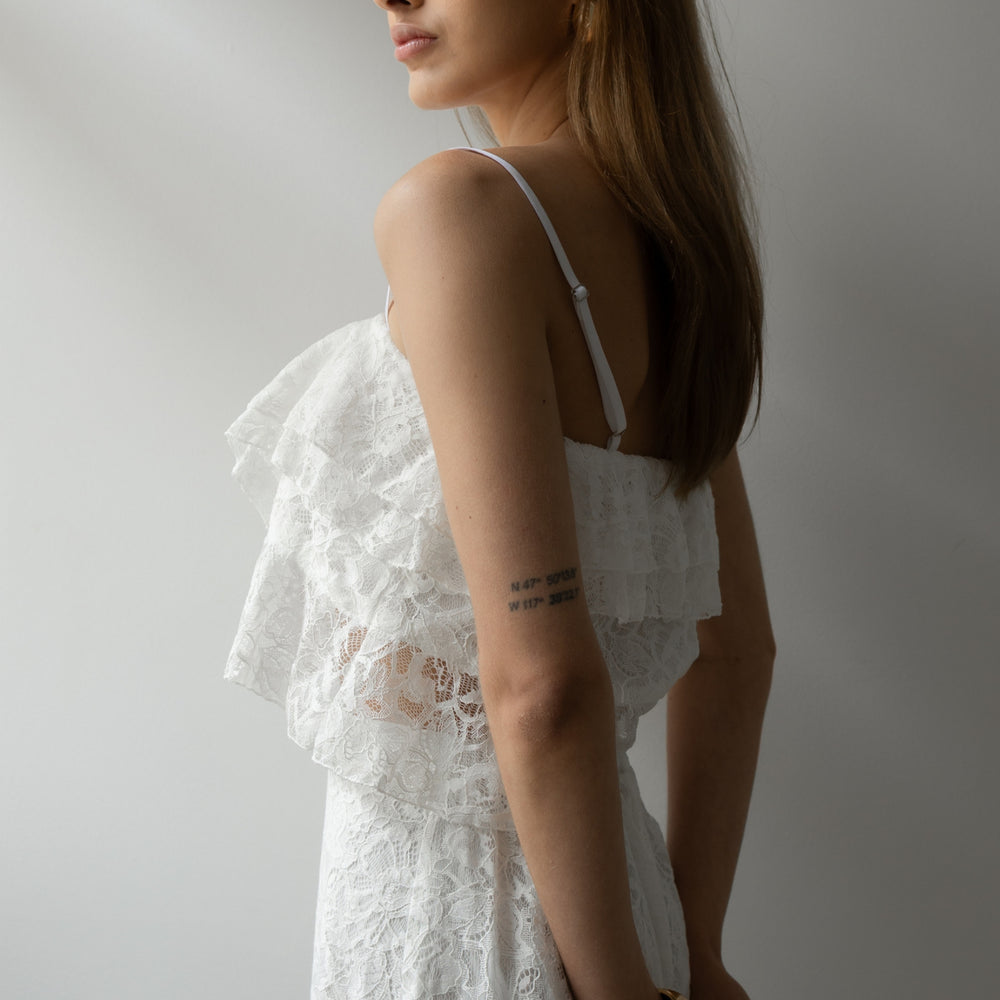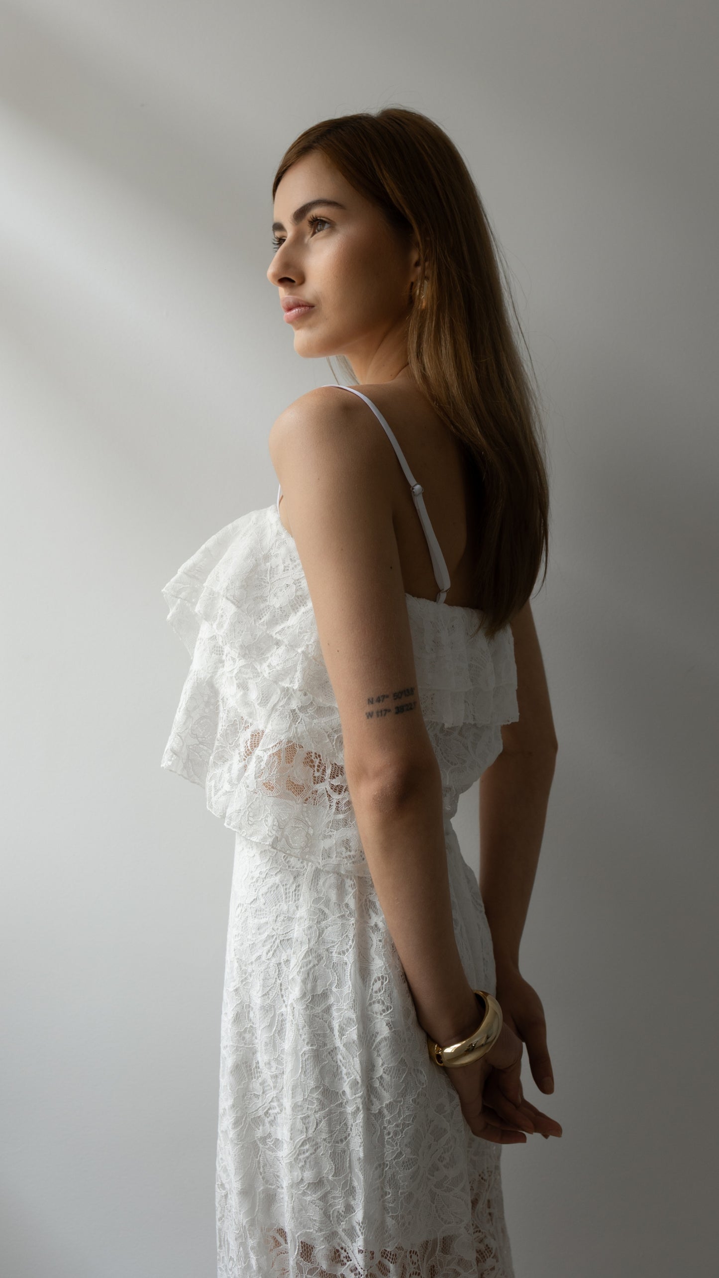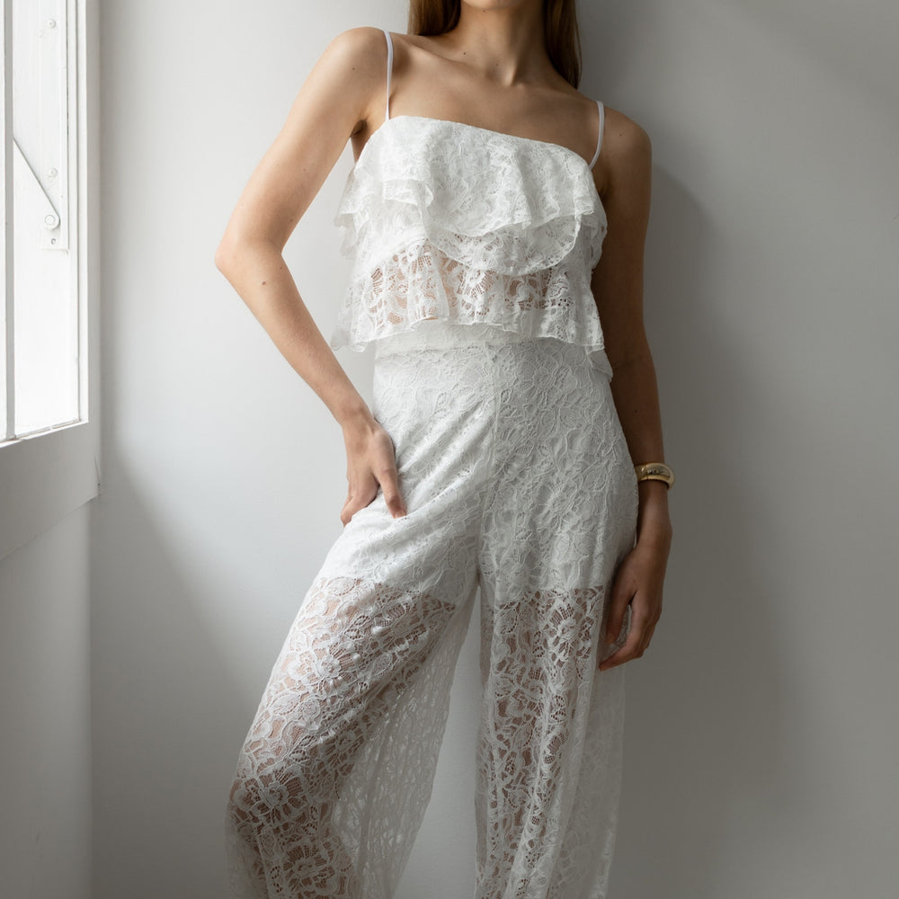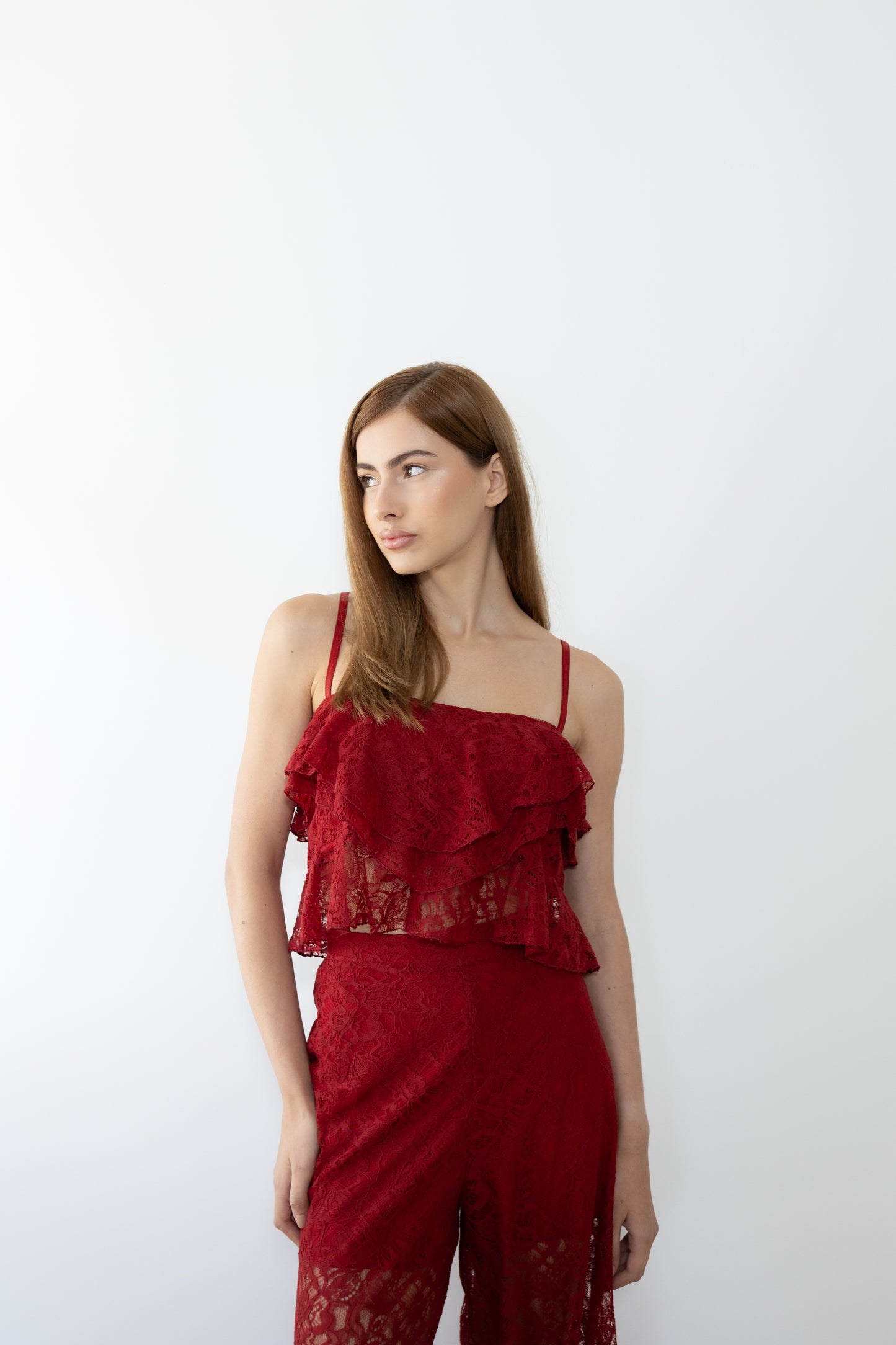 Exalando sofisticação e leveza, o Conjunto é a união perfeita entre delicadeza e personalidade. Confeccionado em renda estruturada de toque macio, o modelo apresenta top com alças finas e caimento fluido, adornado por babado frontal que traz movimento e charme à composição. O fechamento em zíper posterior garante ajuste impecável ao corpo. A calça estilo Aladim confere um ar contemporâneo e despojado à proposta, com cintura marcada, forro fixo até a altura das coxas — proporcionando conforto e segurança — e transparência sutil na barra, revelando a renda em sua forma mais pura. O fechamento lateral por zíper invisível mantém a estética refinada do conjunto. Perfeito para ocasiões onde o casual chic é palavra de ordem, este look transita com naturalidade entre o dia e a noite.