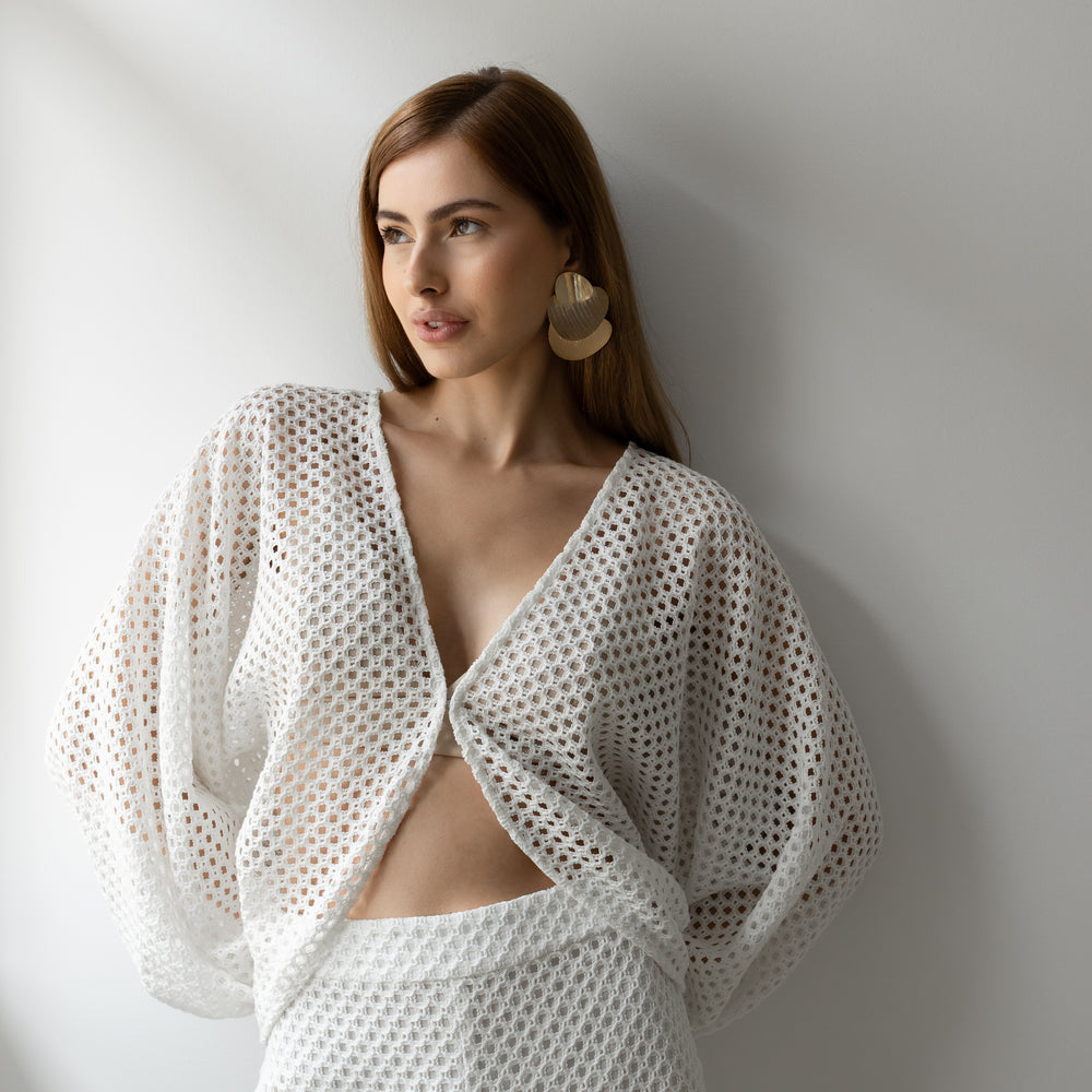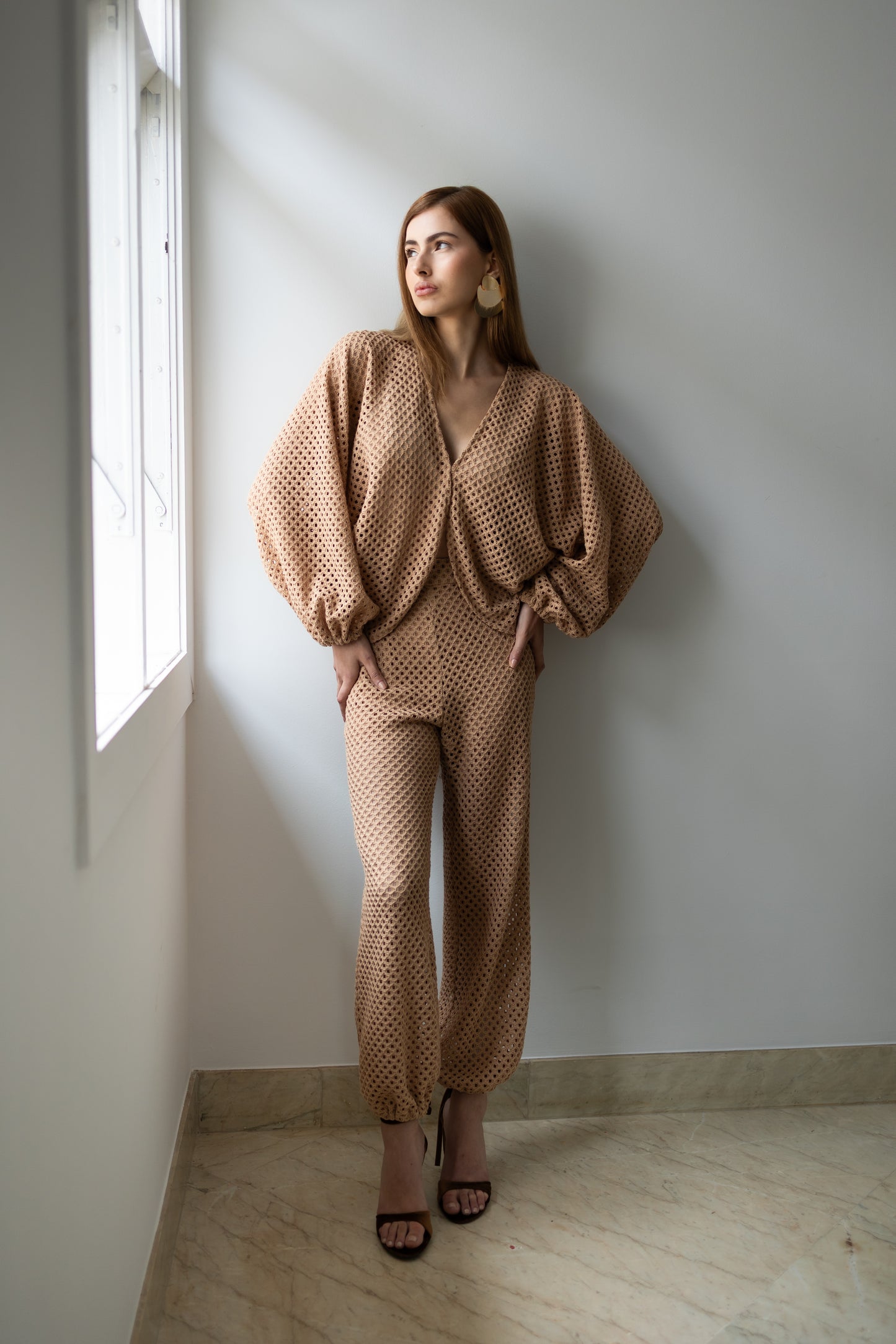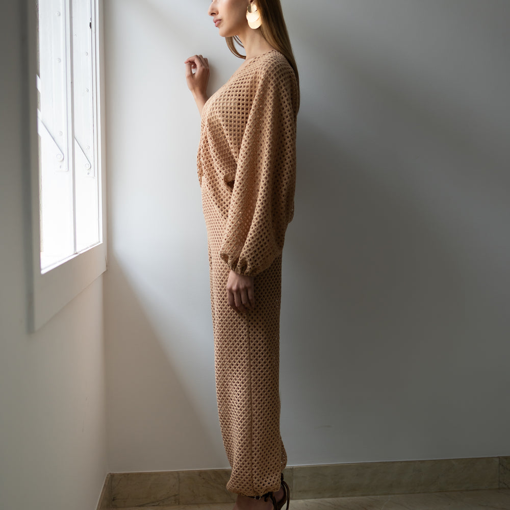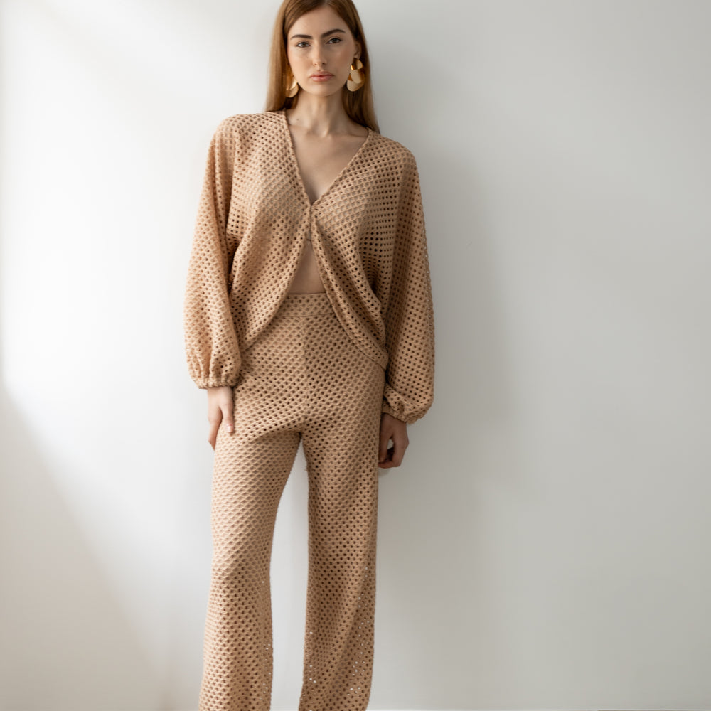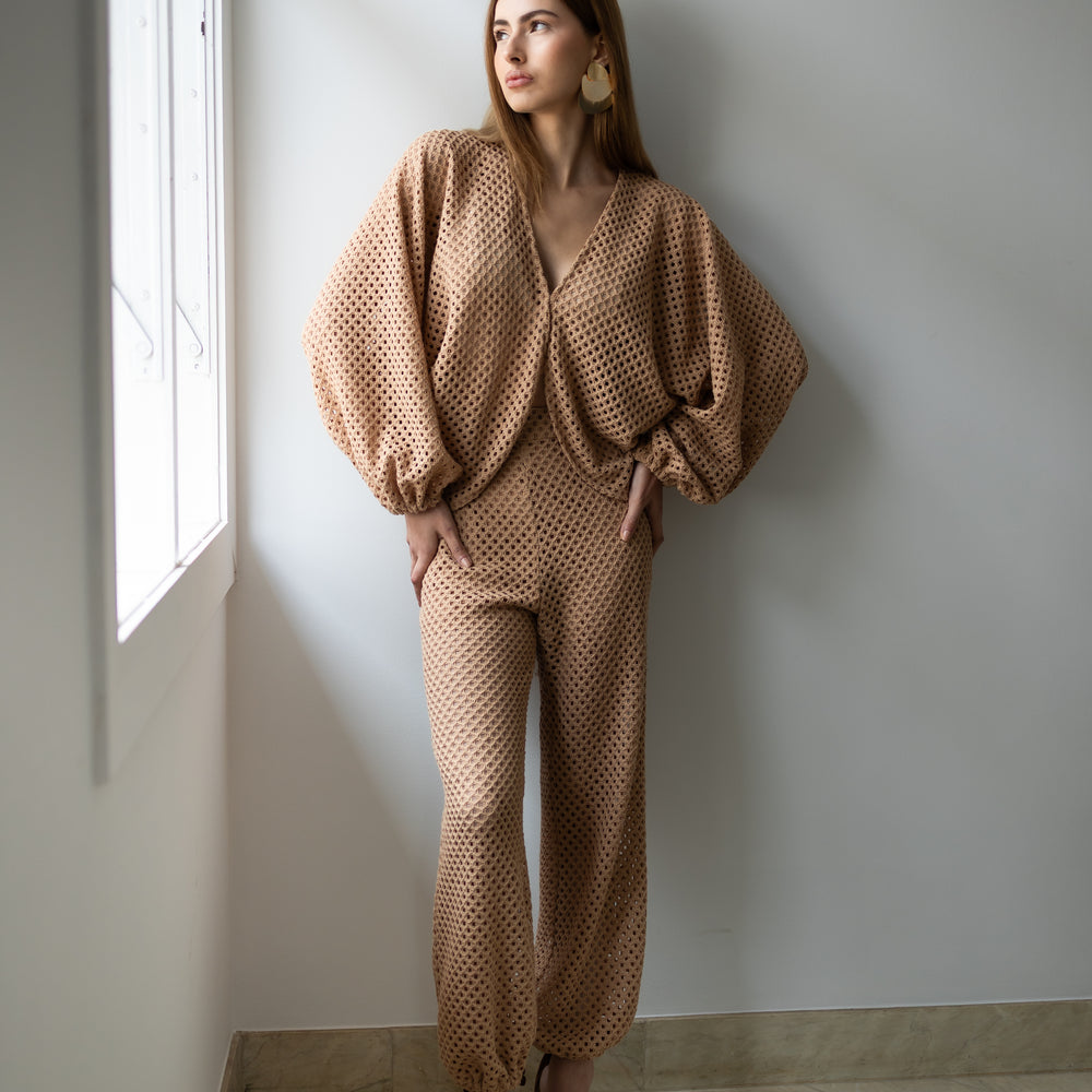 Delicadeza que transborda presença. Confeccionado inteiramente em renda, o conjunto traz um equilíbrio perfeito entre transparência e atitude. A blusa com mangas amplas e abotoamento frontal em colchete envolve o corpo com leveza, enquanto revela silhuetas com sofisticação sutil. A calça aladim, fluida e ousada, acompanha o movimento com graça, criando um visual que desliza entre o sonho e a realidade. Ideal para quem veste desejo com a naturalidade de quem sabe o que quer.