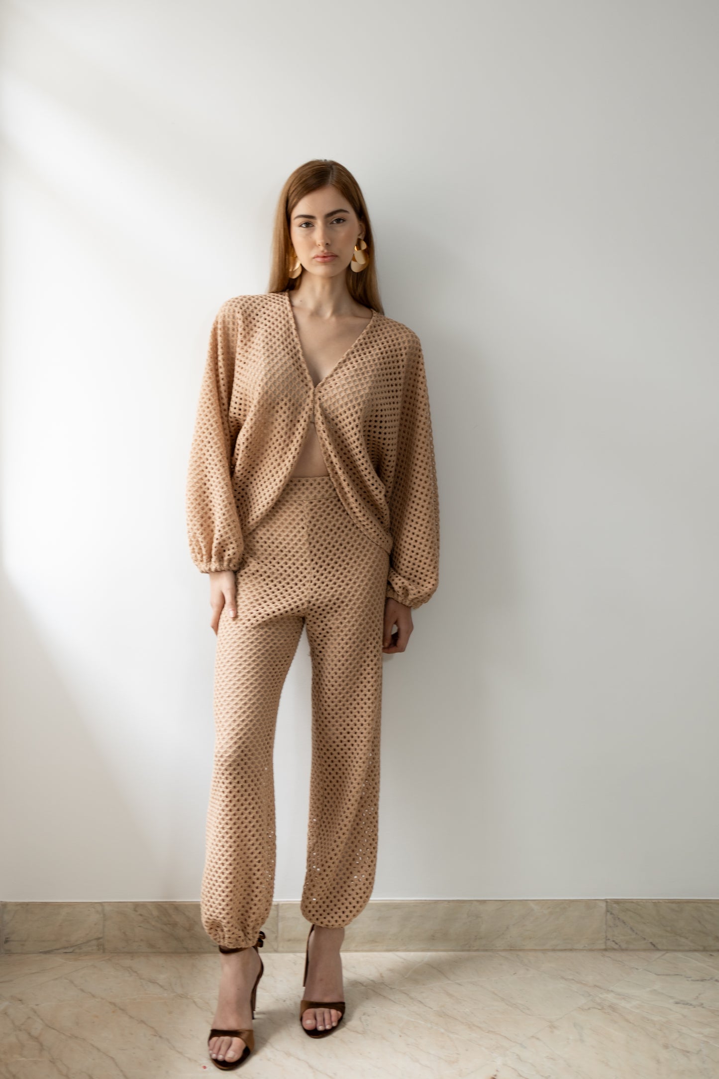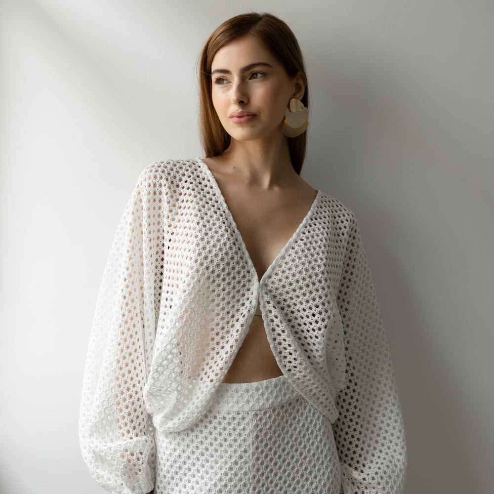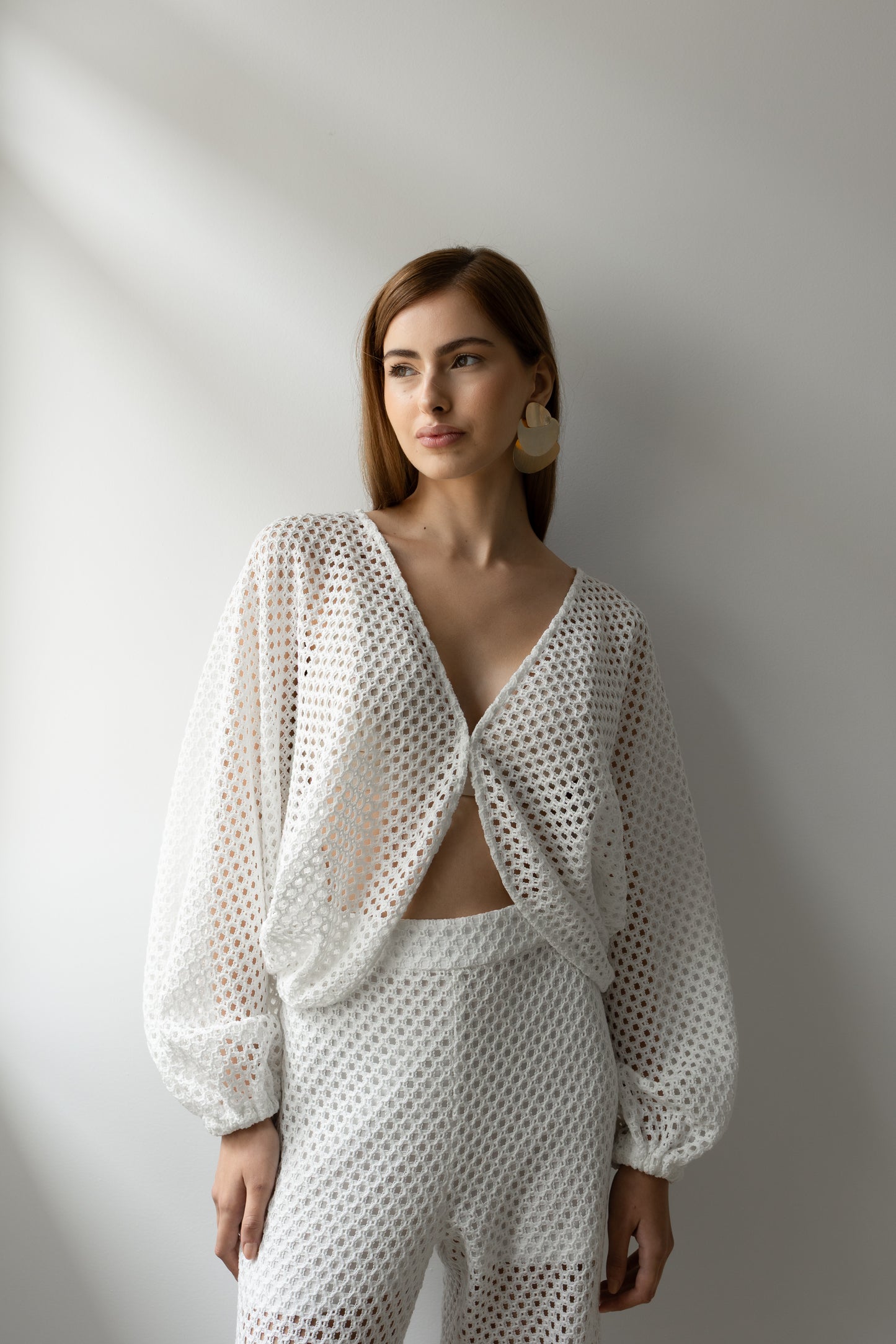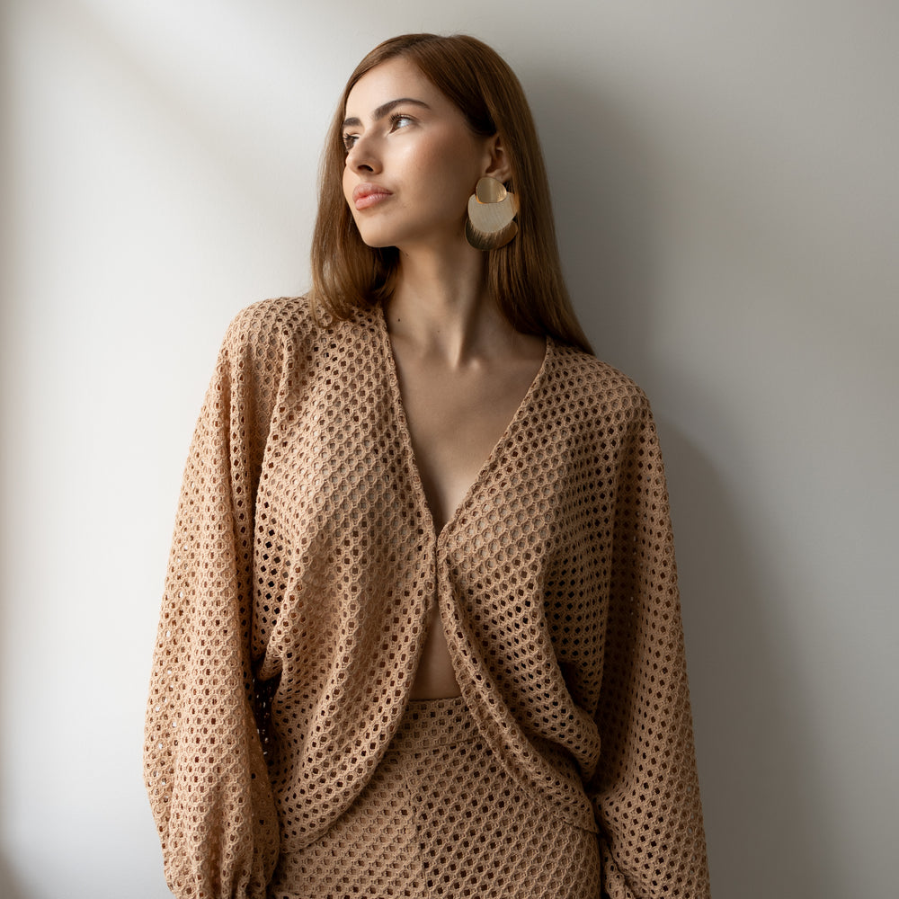 Delicadeza que transborda presença. Confeccionado inteiramente em renda, o conjunto traz um equilíbrio perfeito entre transparência e atitude. A blusa com mangas amplas e abotoamento frontal em colchete envolve o corpo com leveza, enquanto revela silhuetas com sofisticação sutil. A calça aladim, fluida e ousada, acompanha o movimento com graça, criando um visual que desliza entre o sonho e a realidade. Ideal para quem veste desejo com a naturalidade de quem sabe o que quer.