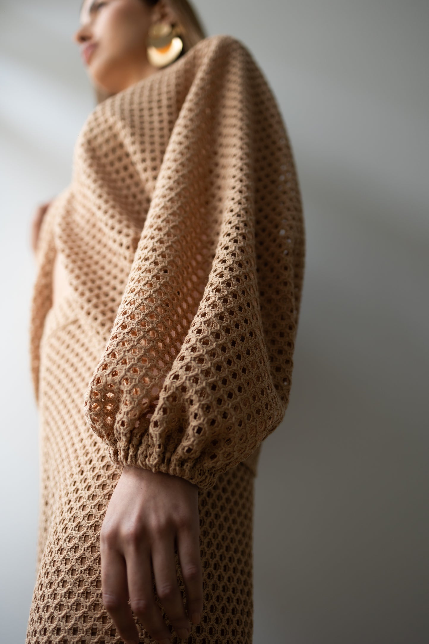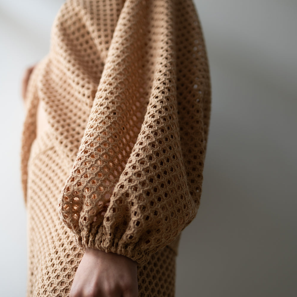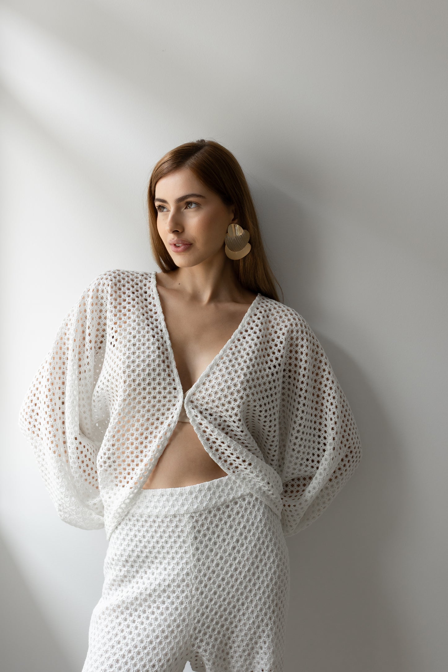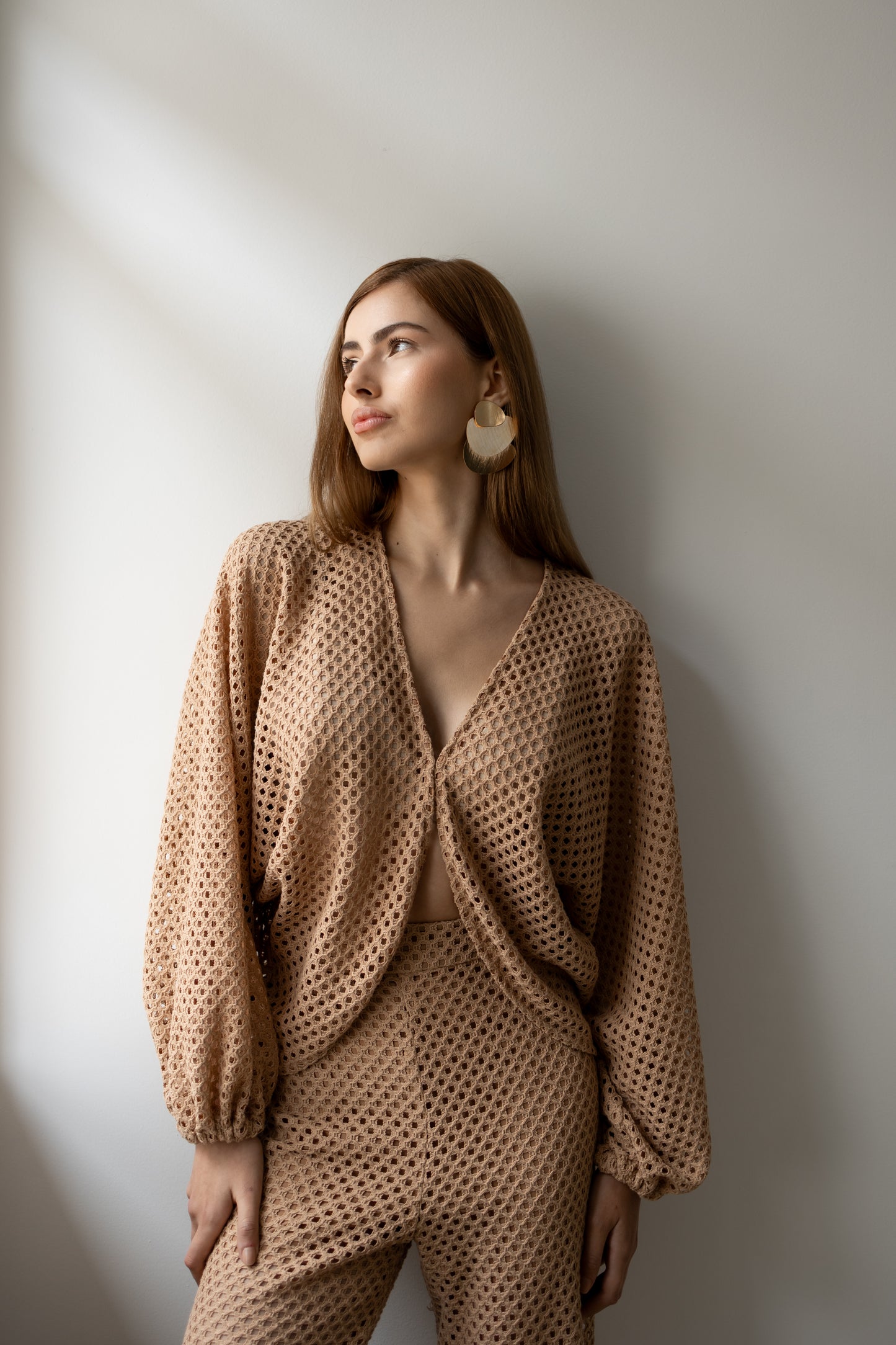 Delicadeza que transborda presença. Confeccionado inteiramente em renda, o conjunto traz um equilíbrio perfeito entre transparência e atitude. A blusa com mangas amplas e abotoamento frontal em colchete envolve o corpo com leveza, enquanto revela silhuetas com sofisticação sutil. A calça aladim, fluida e ousada, acompanha o movimento com graça, criando um visual que desliza entre o sonho e a realidade. Ideal para quem veste desejo com a naturalidade de quem sabe o que quer.
