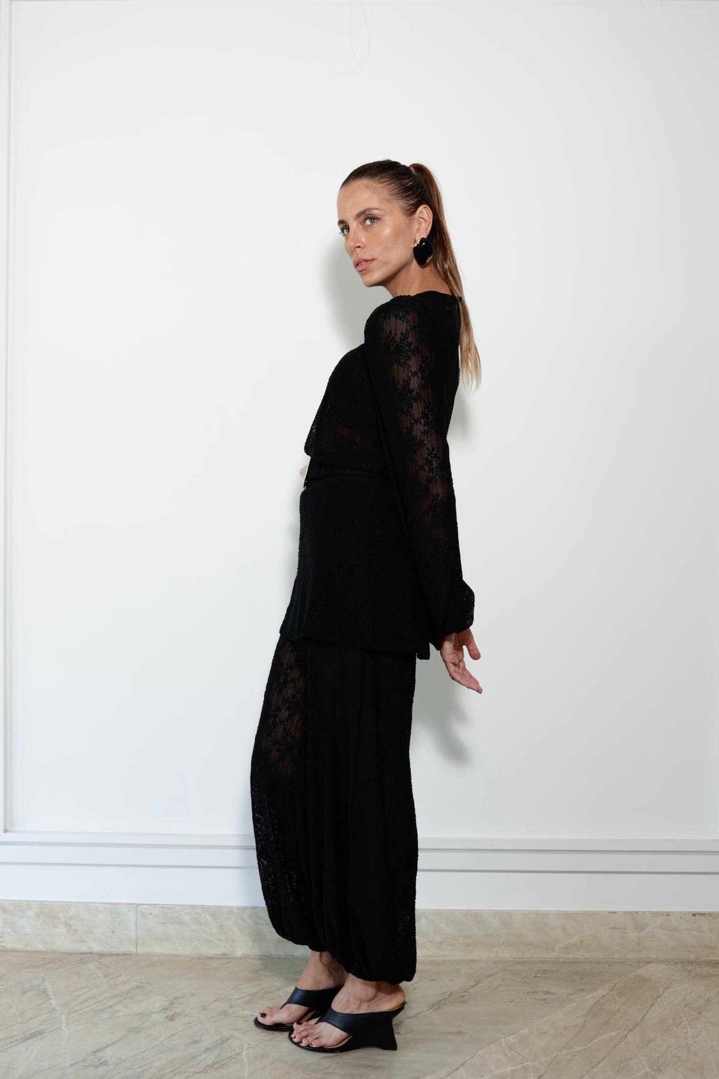 A própria essência do romance e da feminilidade. Este conjunto de duas peças em renda floral delicada é uma celebração da leveza e do charme vintage. Composto por uma blusa com detalhes requintados e uma calça fluida, é a escolha perfeita para eventos que pedem uma elegância sem esforço.