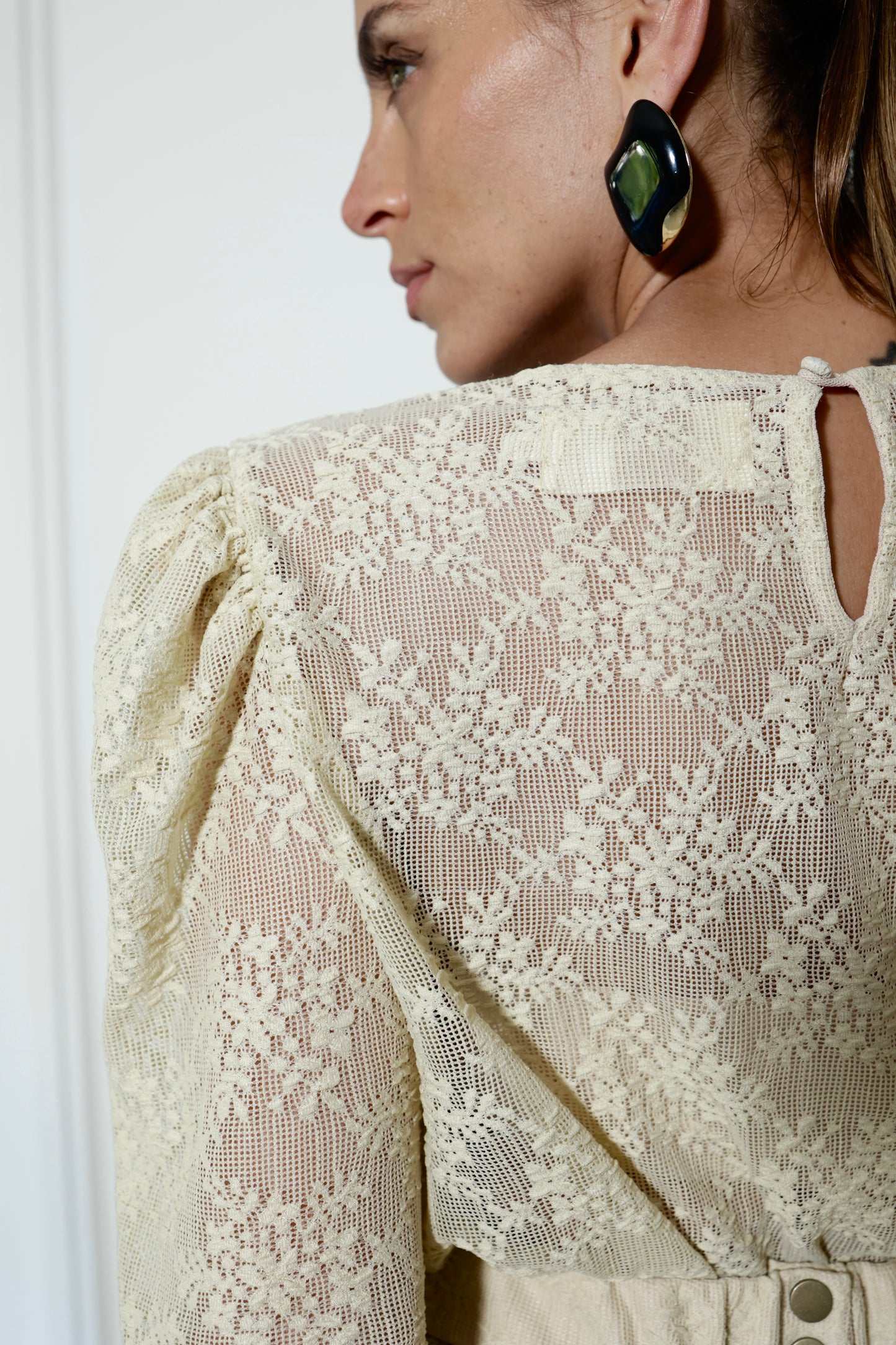 Detalhes Encantadores: O delicado padrão floral da renda é acentuado pelos botões de pérola nas costas da gola, um toque de luxo discreto.