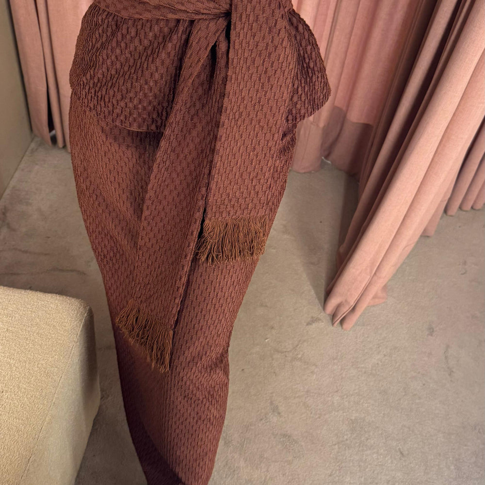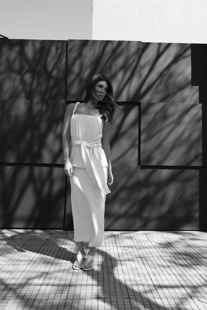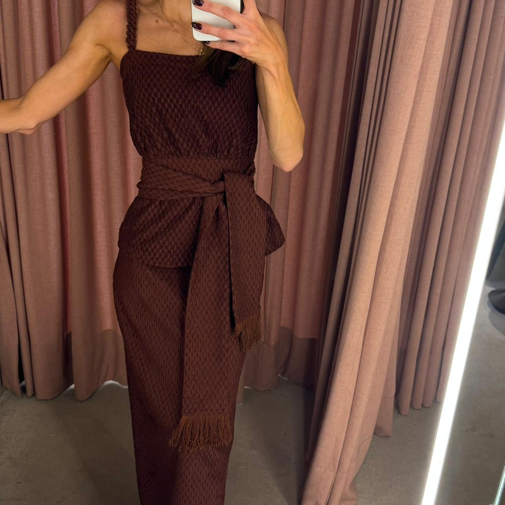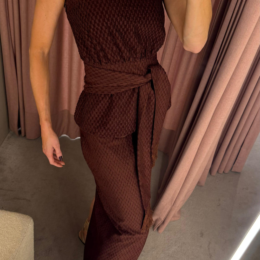 Este conjunto traz uma combinação perfeita de sofisticação e estilo contemporâneo. A blusa de alças finas é delicada e moderna, com uma modelagem que exalta a silhueta com suavidade. A saia longa, em um tom neutro e refinado, complementa perfeitamente o visual, criando um equilíbrio entre o clássico e o moderno. O cinto faixa com franjas nas pontas é o destaque da peça, adicionando movimento e um toque de ousadia ao conjunto. Esse detalhe exclusivo dá personalidade ao look, enquanto as alças finas trazem leveza e feminilidade. Ideal para quem busca elegância em momentos especiais, sem perder o toque de personalidade e modernidade.