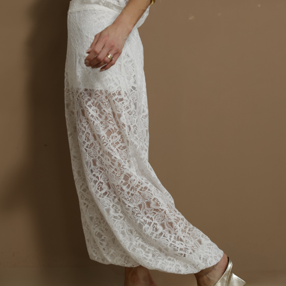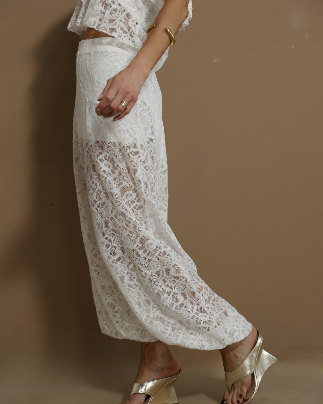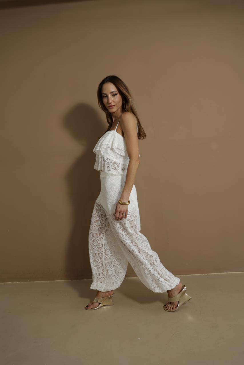 Exalando sofisticação e leveza, o Conjunto é a união perfeita entre delicadeza e personalidade. Confeccionado em renda estruturada de toque macio, o modelo apresenta top com alças finas e caimento fluido, adornado por babado frontal que traz movimento e charme à composição. O fechamento em zíper posterior garante ajuste impecável ao corpo. A calça estilo Aladim confere um ar contemporâneo e despojado à proposta, com cintura marcada, forro fixo até a altura das coxas — proporcionando conforto e segurança — e transparência sutil na barra, revelando a renda em sua forma mais pura. O fechamento lateral por zíper invisível mantém a estética refinada do conjunto. Perfeito para ocasiões onde o casual chic é palavra de ordem, este look transita com naturalidade entre o dia e a noite.