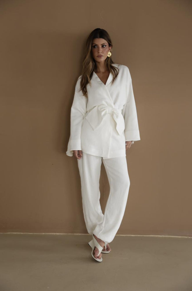 Conjunto elegante composto por kimono de mangas soltas e calça de corte reto. O kimono vem acompanhado de cinto no mesmo tom para acinturar a silhueta com leveza, permitindo diferentes formas de uso — aberto, solto ou marcado na cintura. A calça traz um caimento fluido e sofisticado, com cintura média e acabamento impecável, perfeita para transitar com naturalidade entre o casual chic e o refinado.