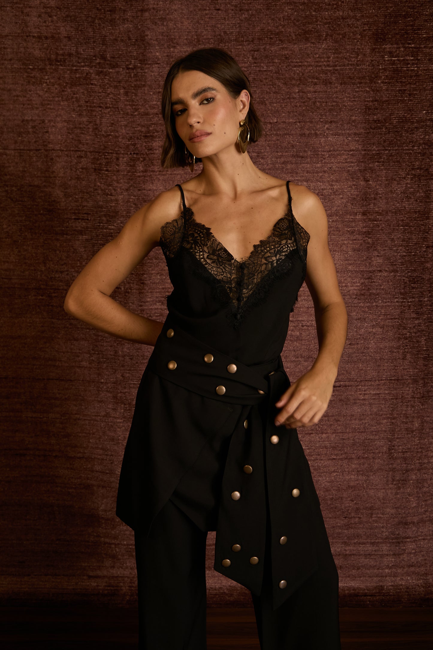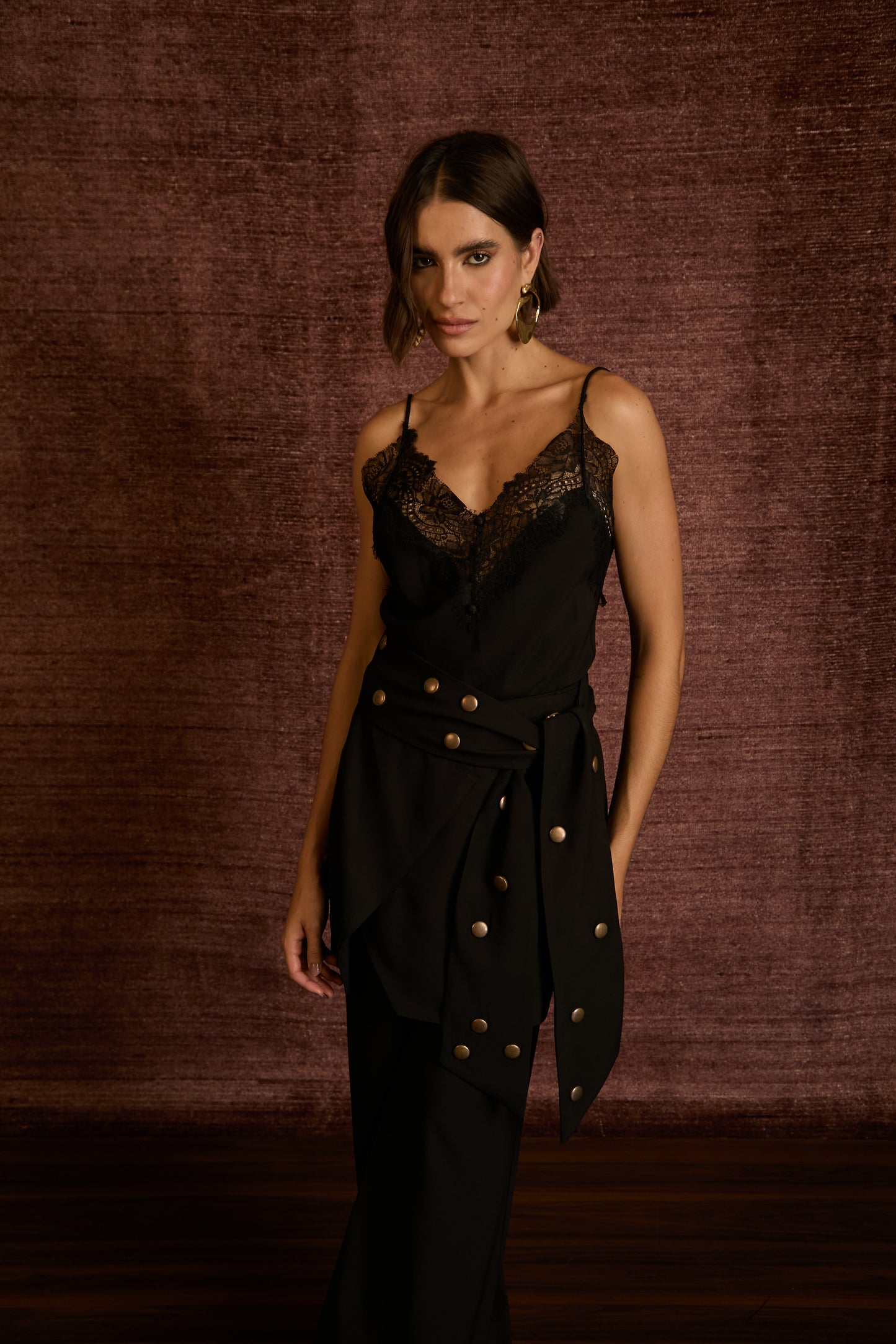 Preço regular R$ 249,00Blusa Naila de Alça Fina em Crepe com Renda no Decote, elegante em crepe combina a leveza e o caimento fluido do tecido com a sofisticação da renda delicada no decote. As alças finas oferecem um toque de feminilidade, enquanto o detalhe em renda adiciona um charme extra, criando um visual refinado e romântico. O crepe, conhecido por sua suavidade e textura única, proporciona um toque de conforto e movimento à peça, tornando-a perfeita para ocasiões especiais ou para um look mais casual, mas com sofisticação. Combine com uma saia de cintura alta ou calças para um visual moderno e elegante.