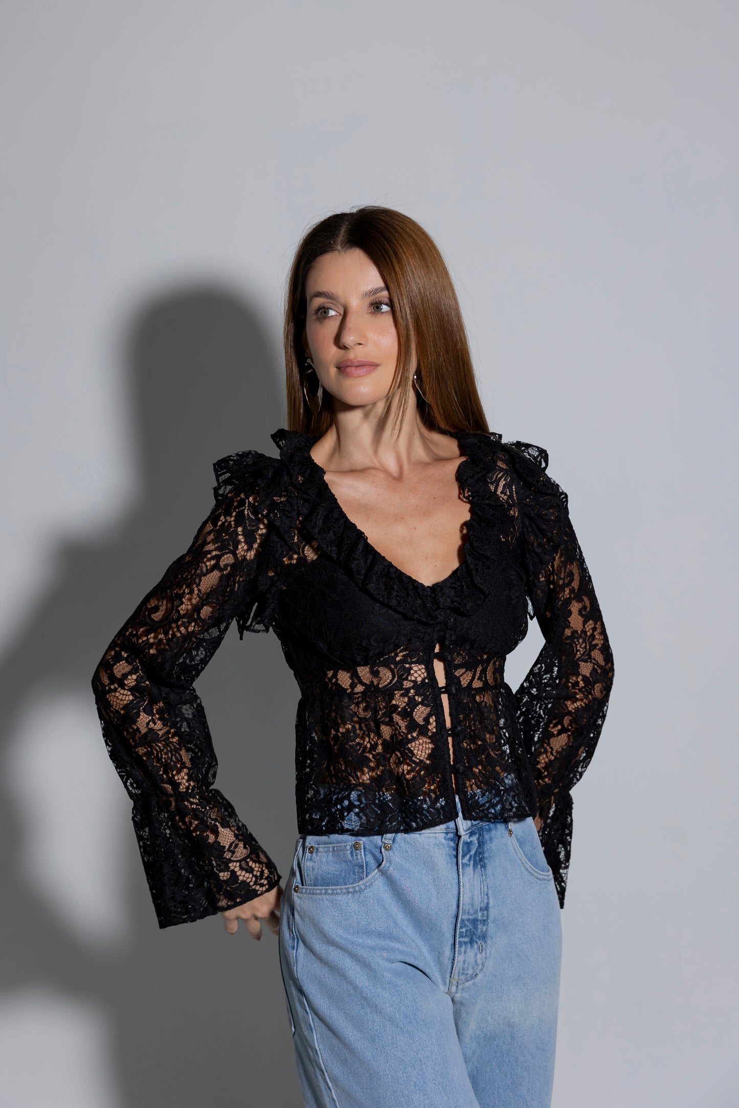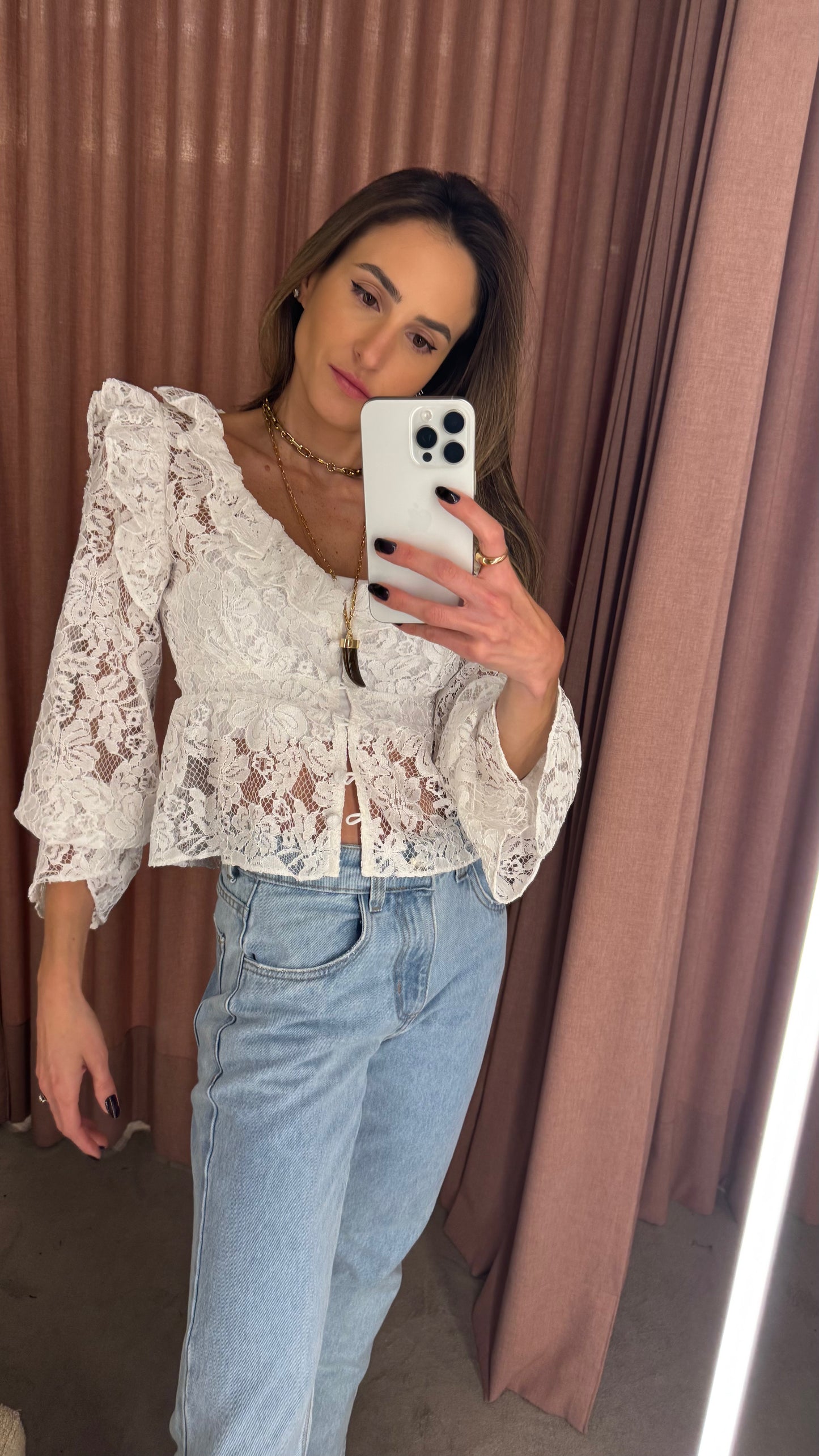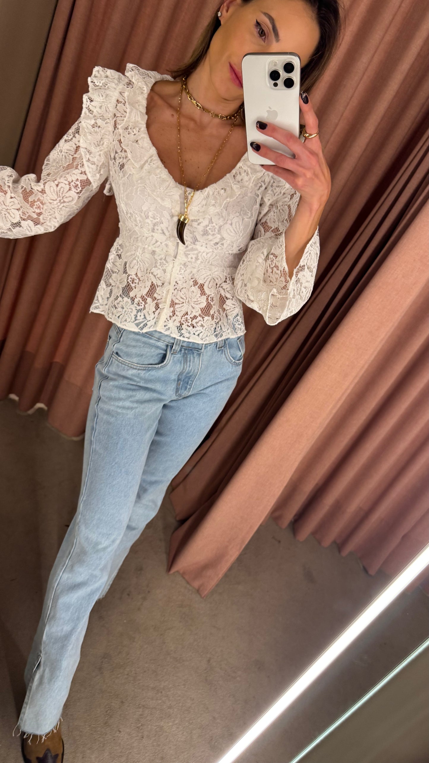 A Blusa Nice Renda é a escolha perfeita para compor looks sofisticados e modernos. Confeccionada em renda delicada e transparente, ela valoriza o corpo com sutileza e estilo. Possui modelagem ajustada, mangas longas com acabamento em babados e fechamento discreto nas costas.