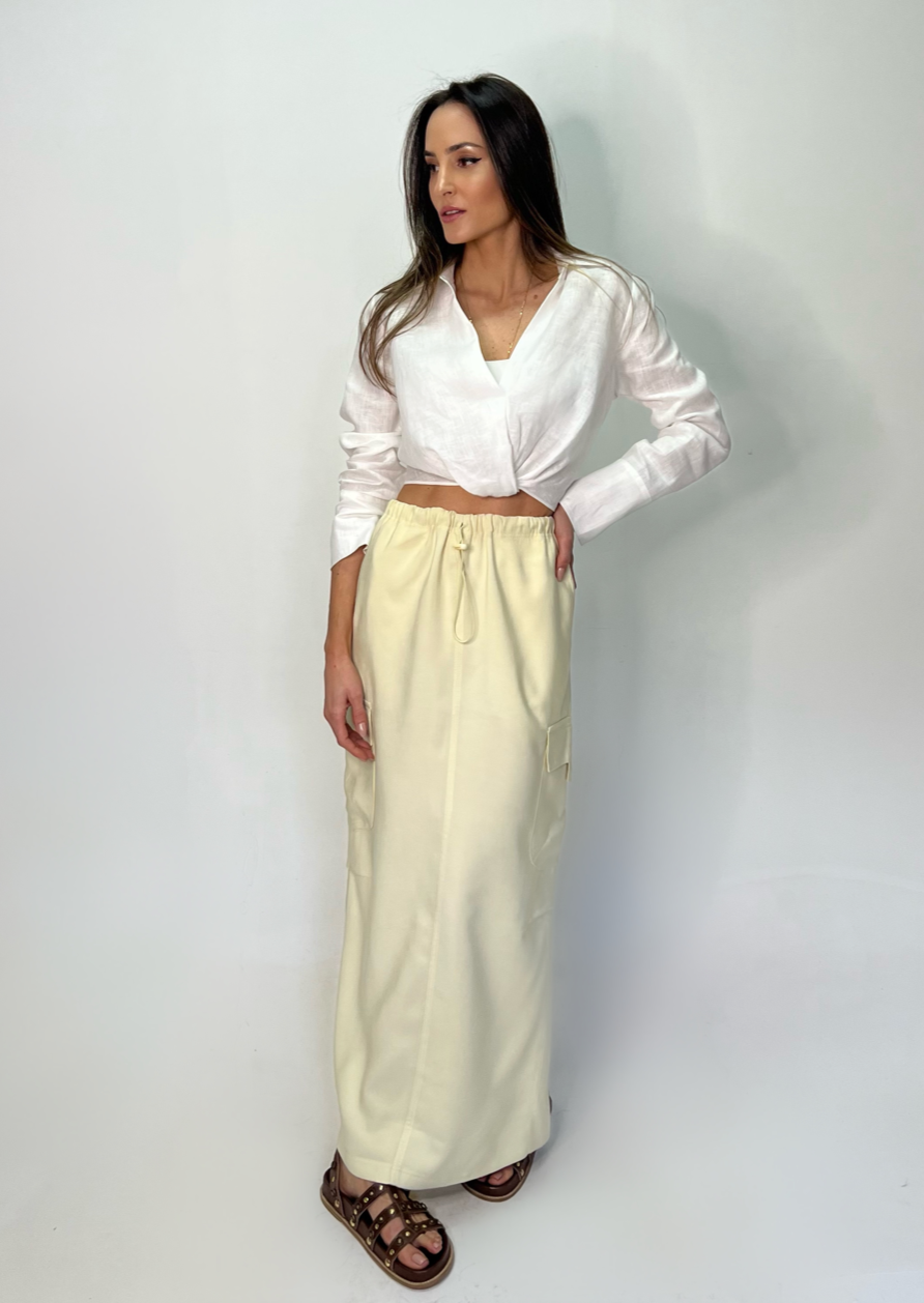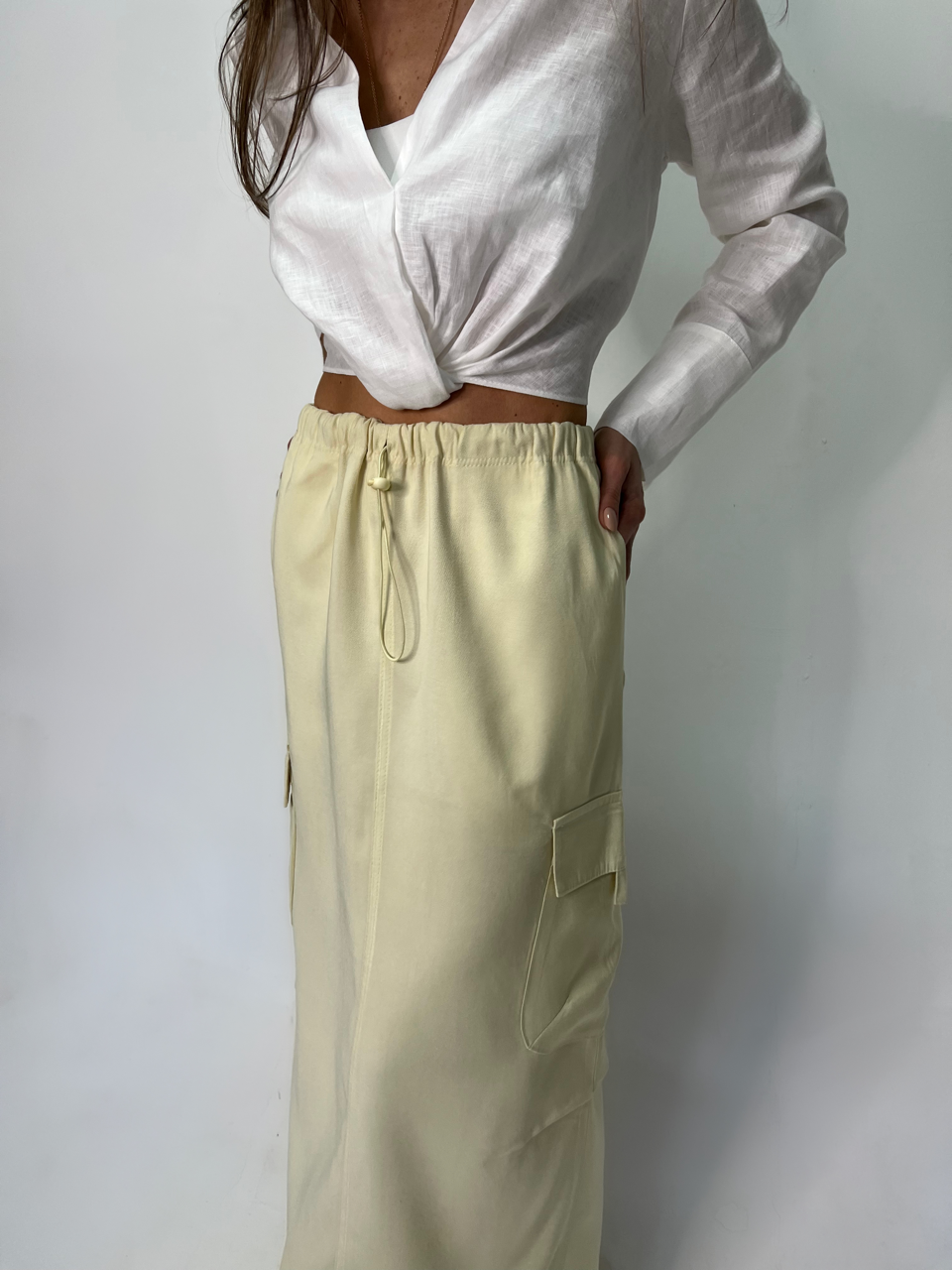Preço regular R$ 231,00Saia longa modelo cargo com corda na cintura.