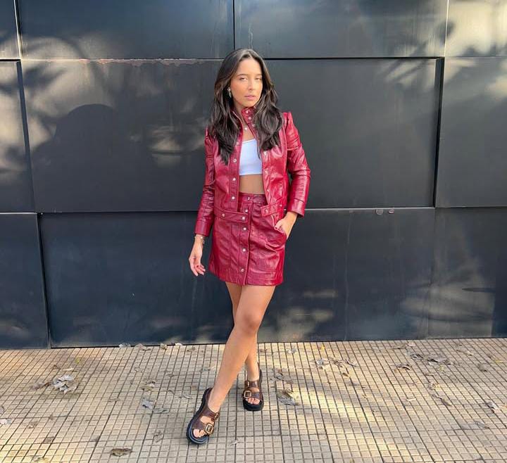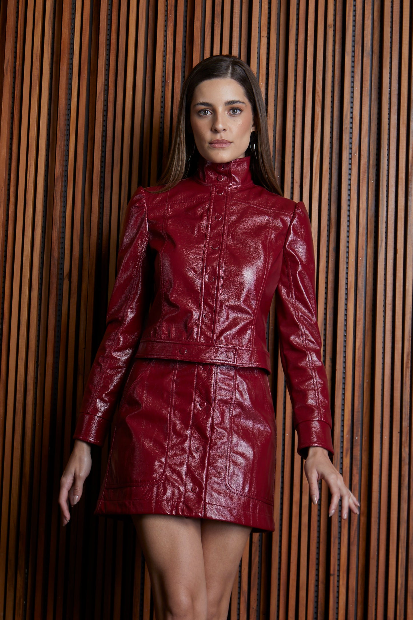 Preço regular R$ 312,00Saia de vinil com botões de pressão encapados com o mesmo tecido.