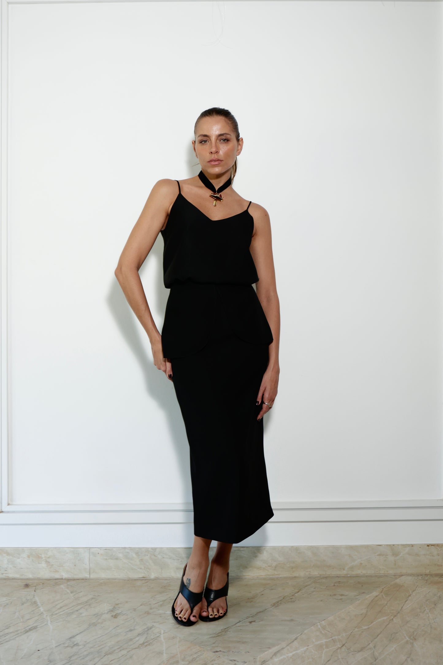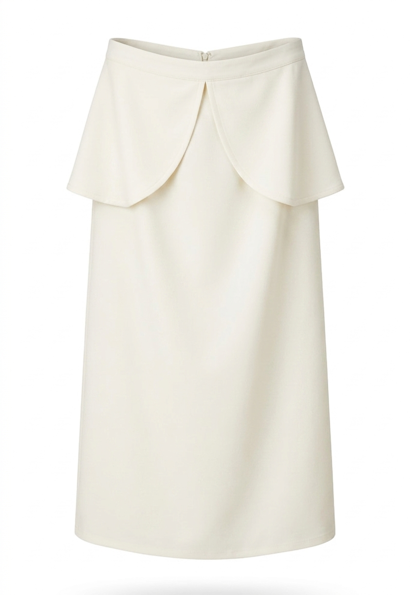 A elegância arquitetônica em forma de vestuário. Esta saia em crepe patou é a tradução do luxo contemporâneo, apresentando um design minimalista elevado pelo peplum fixo com abas sobrepostas. Uma peça de presença marcante que transita com perfeição do ambiente corporativo de alto nível aos eventos sociais mais exclusivos.