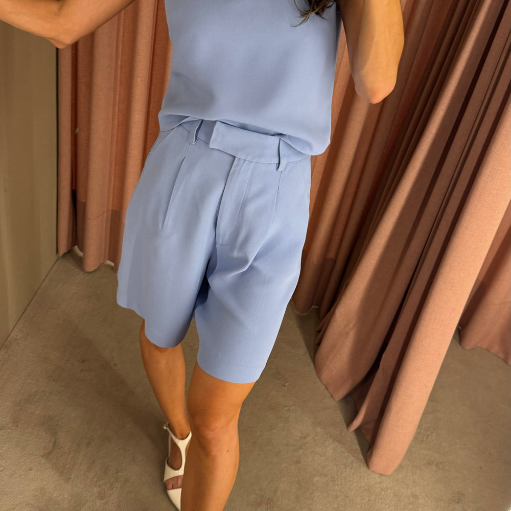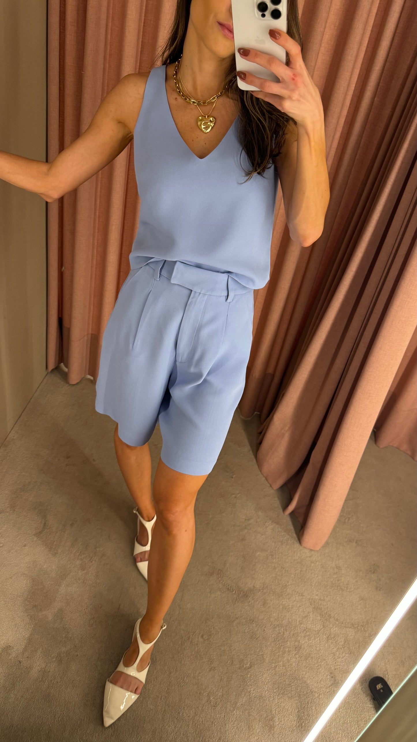 Preço regular R$ 330,00Bermuda de cintura alta em crepe com modelagem reta. Possui pregas frontais, cos com passante, bolsos faca frontais e bolsos besom na parte de trás