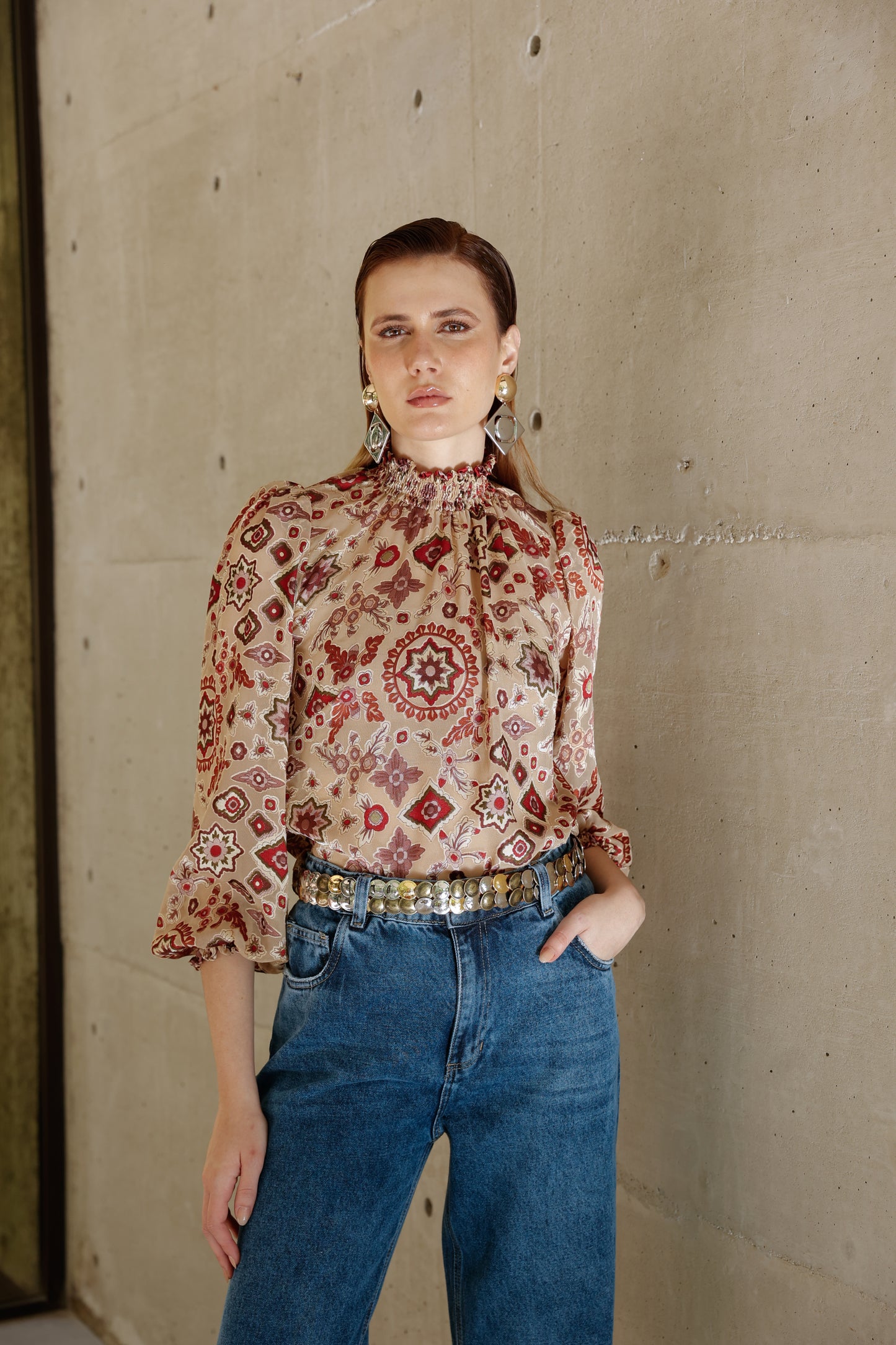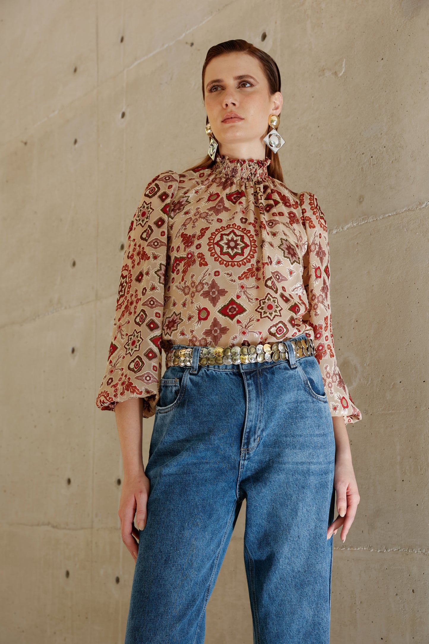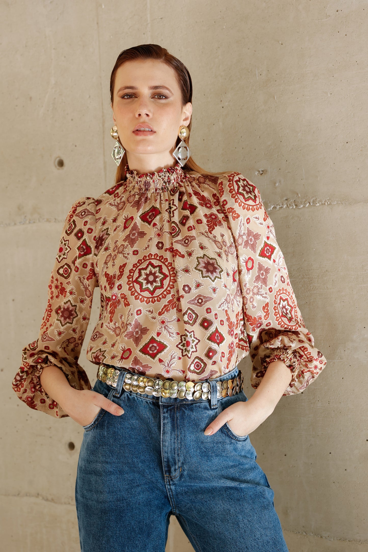 Com um visual marcante e ao mesmo tempo delicado, esta blusa apresenta uma estampa exclusiva de mandalas, trazendo uma fusão entre sofisticação e personalidade. O modelo conta com gola alta franzida e mangas bufantes com punho ajustado, que adicionam charme e romantismo ao visual. Confeccionada em tecido leve e fluido, proporciona ótimo caimento e conforto ao vestir. Ideal para produções elegantes e autênticas — seja com jeans ou alfaiataria.