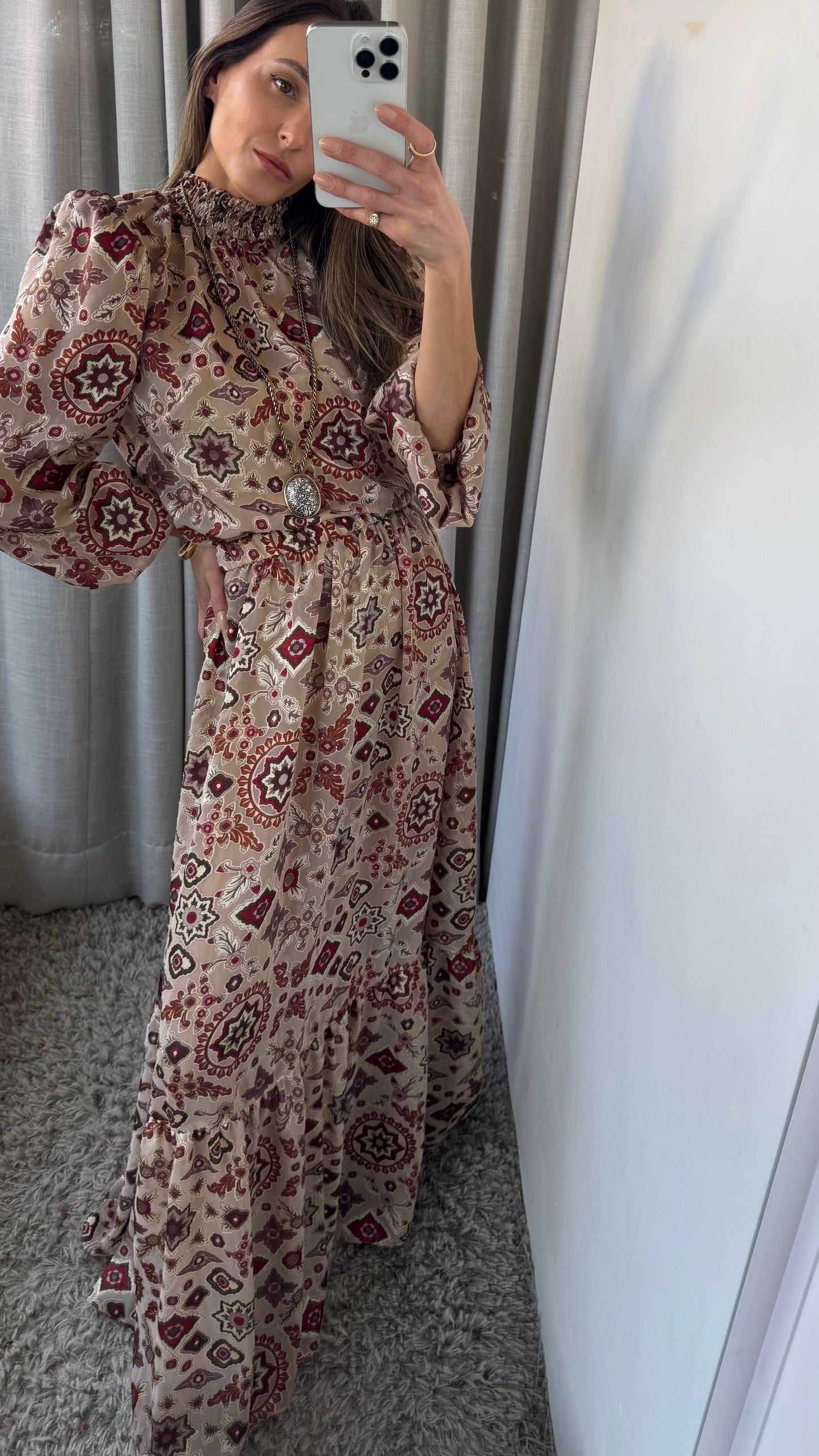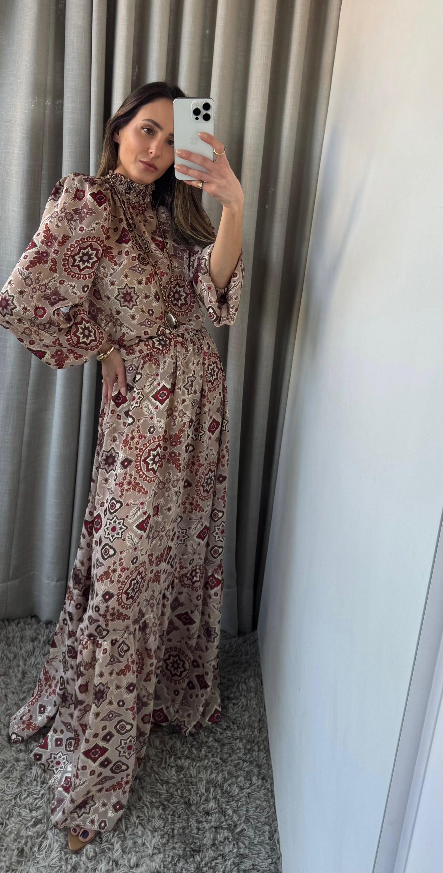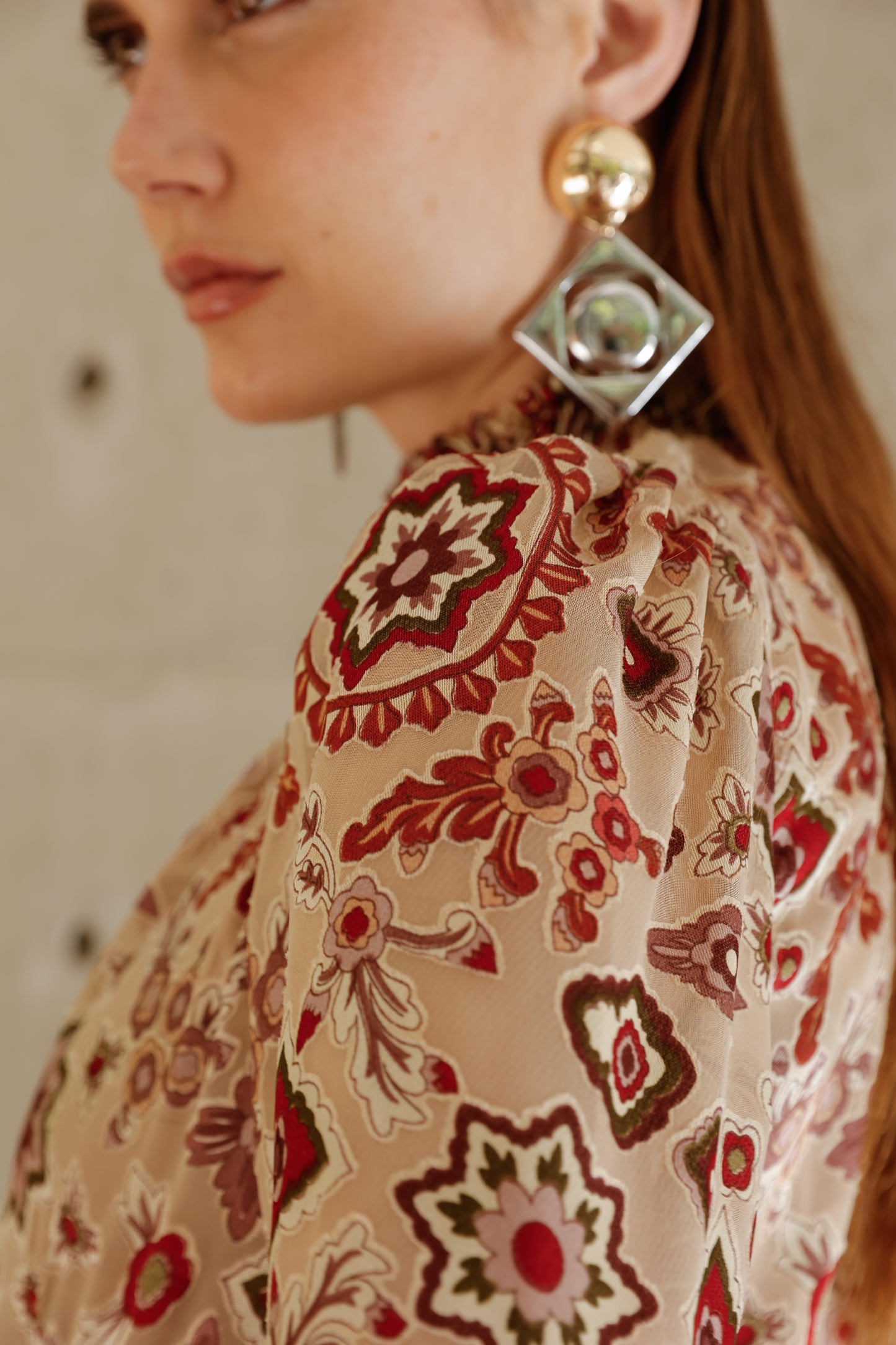 Com um visual marcante e ao mesmo tempo delicado, esta blusa apresenta uma estampa exclusiva de mandalas, trazendo uma fusão entre sofisticação e personalidade. O modelo conta com gola alta franzida e mangas bufantes com punho ajustado, que adicionam charme e romantismo ao visual. Confeccionada em tecido leve e fluido, proporciona ótimo caimento e conforto ao vestir. Ideal para produções elegantes e autênticas — seja com jeans ou alfaiataria.