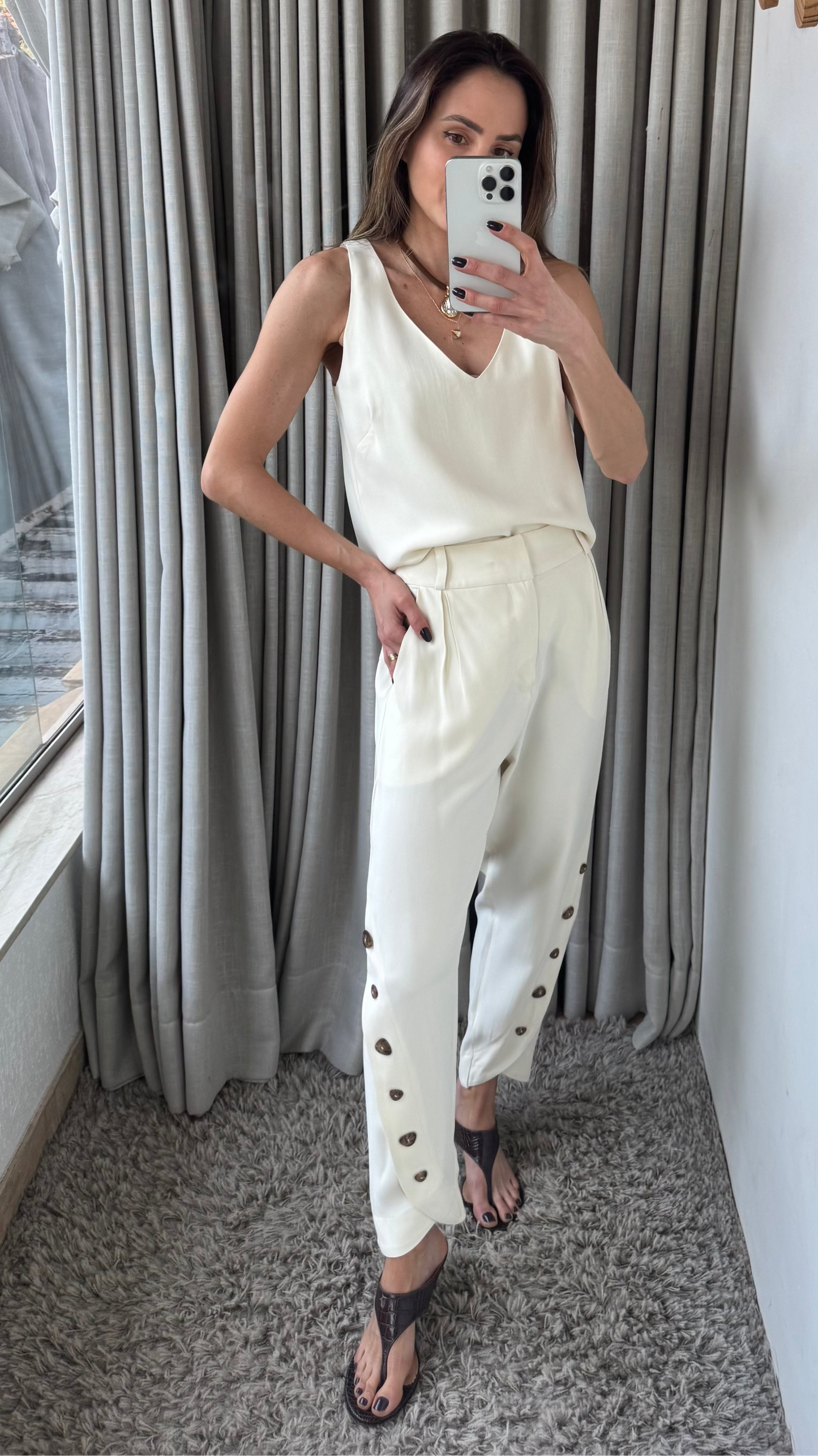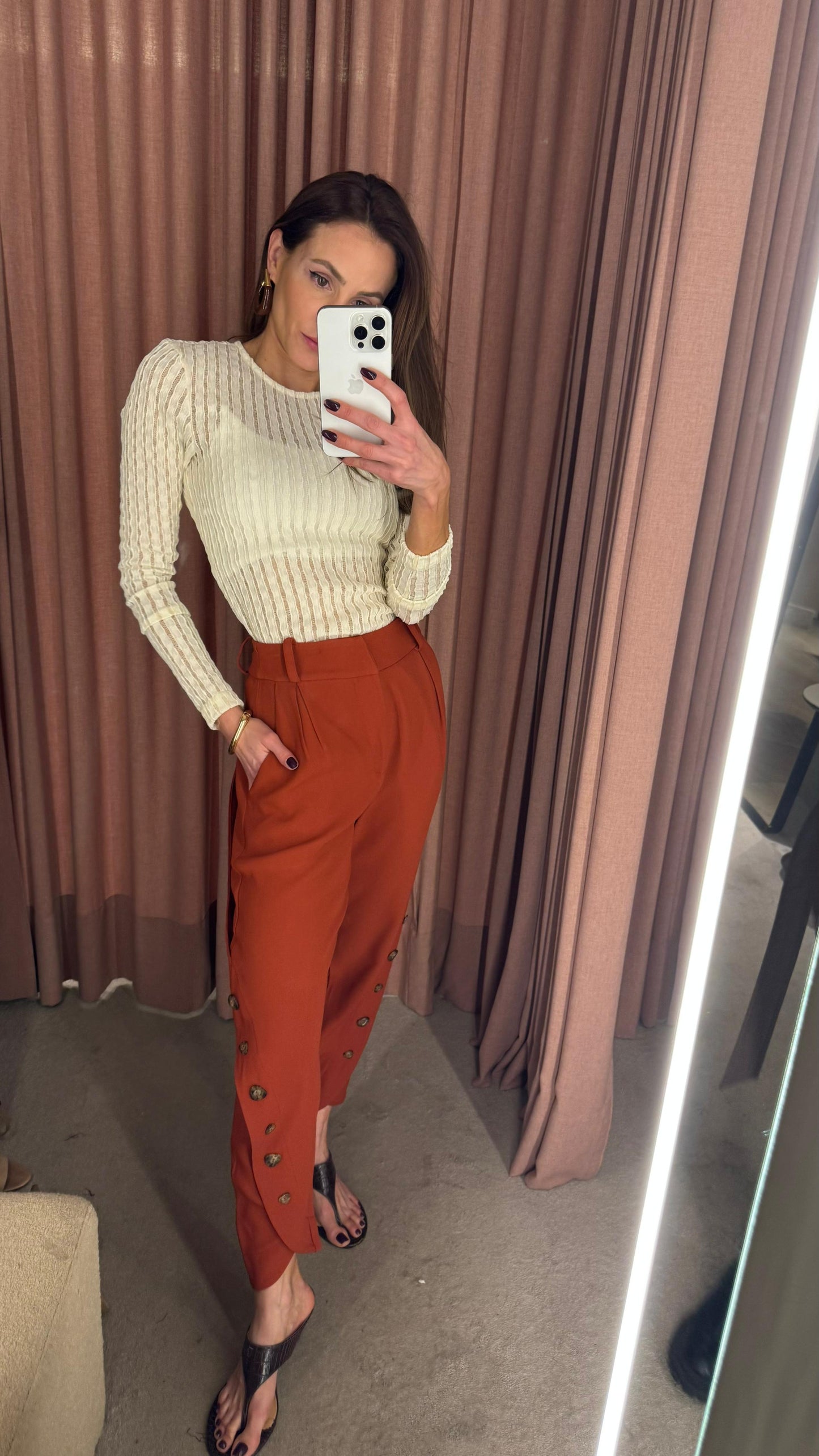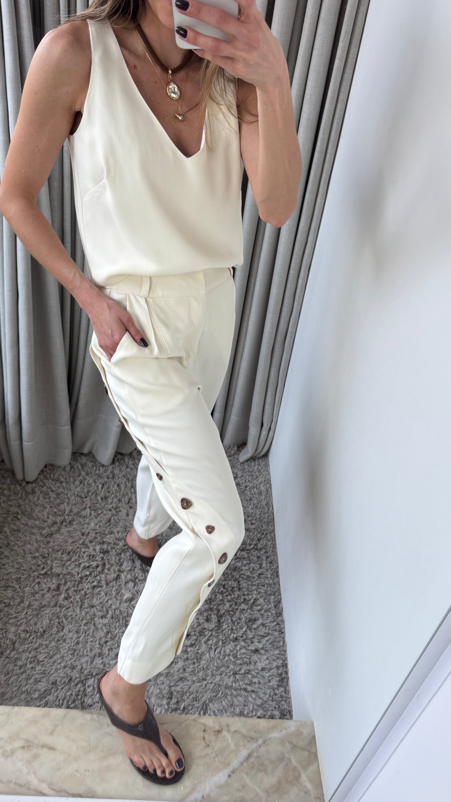 A calça Le Beau aposta no clássico com um toque de personalidade. Com cós estruturado, fechamento por zíper e bolsos faca funcionais, o destaque fica por conta dos botões fixos aplicados ao longo das laterais — do cós até a barra — que conferem charme e originalidade ao design. A barra levemente afunilada equilibra a silhueta, garantindo um caimento moderno e elegante. Uma peça versátil que eleva o visual com estilo e sofisticação.