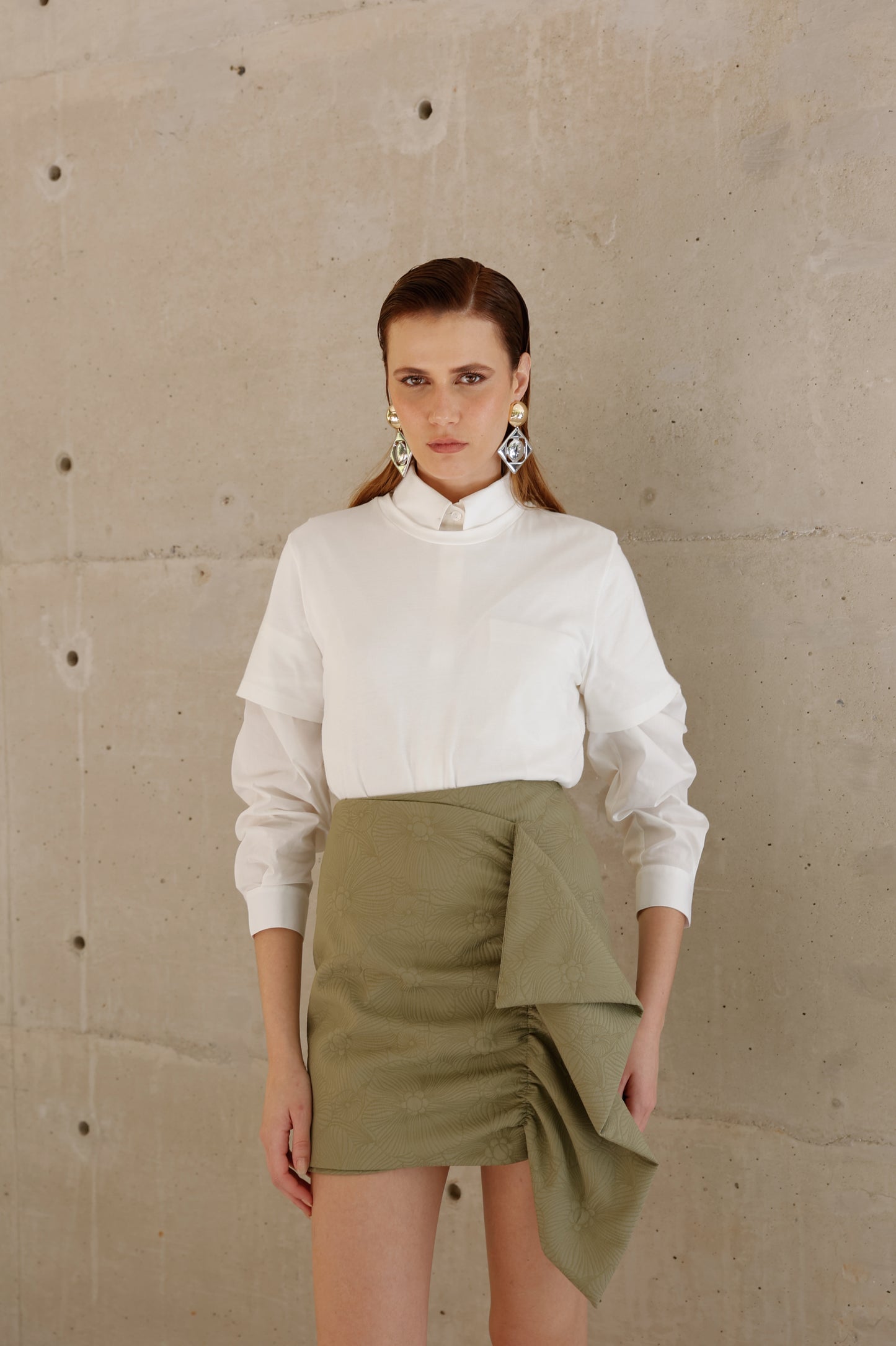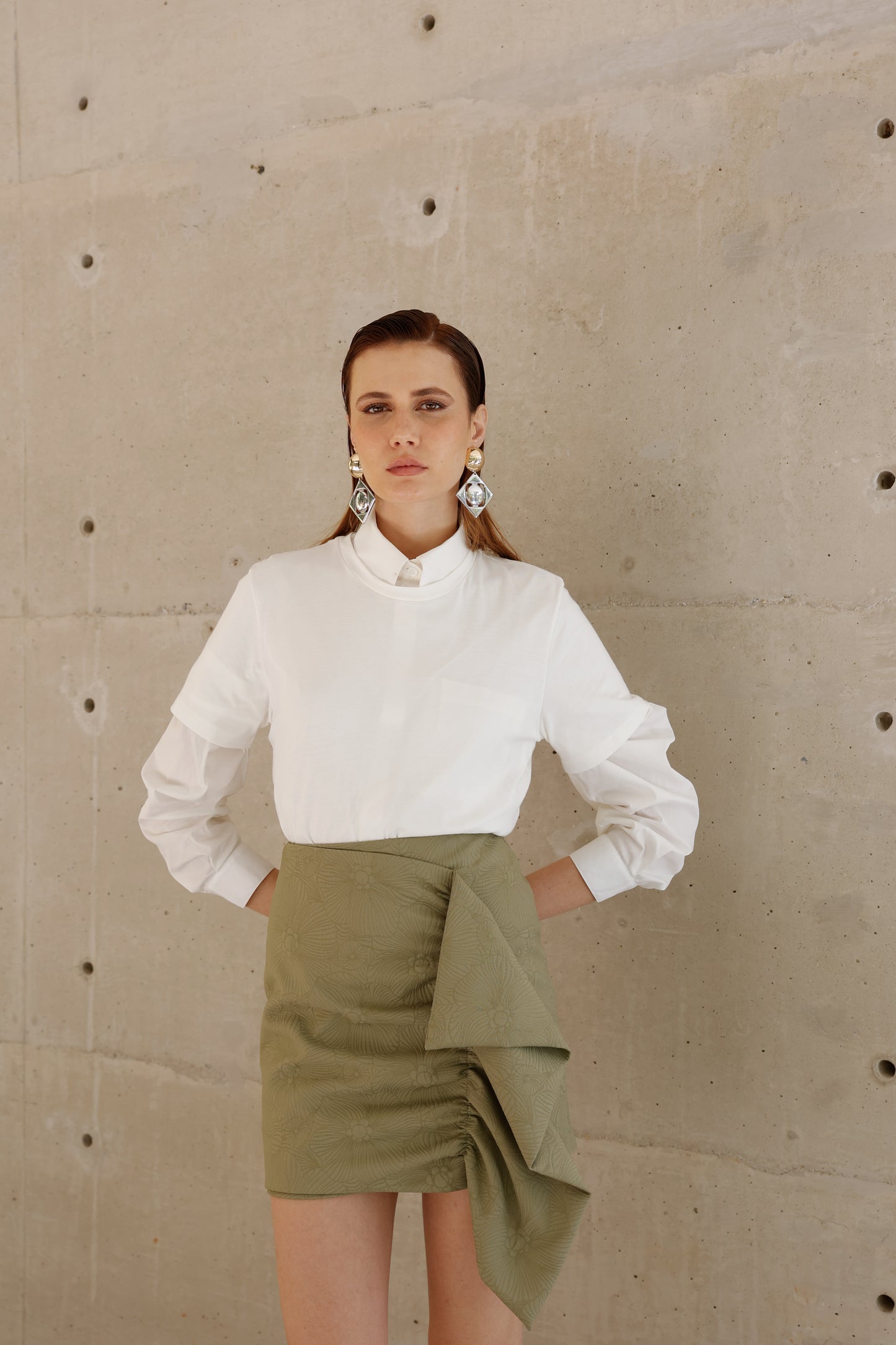 Atemporal, leve e sofisticada. Nossa camisa off traz modelagem oversized com caimento fluido e toque suave sobre a pele. O punho marcado com botão forrado adiciona um acabamento delicado, enquanto a gola estruturada reforça sua versatilidade — do clássico ao contemporâneo. Ideal para compor camadas elegantes ou como peça protagonista em looks minimalistas.