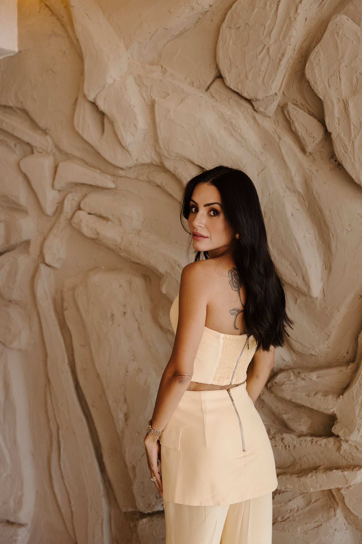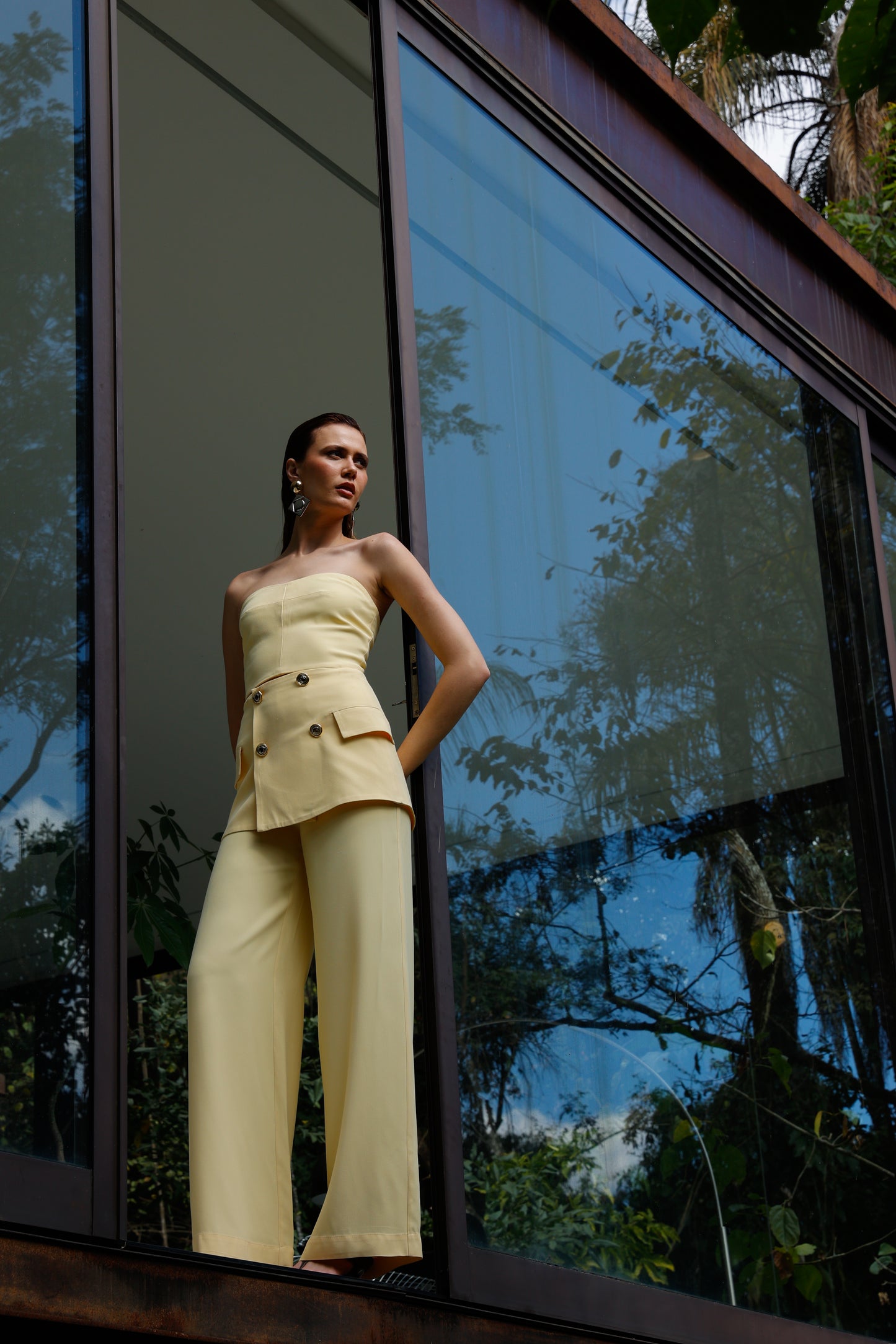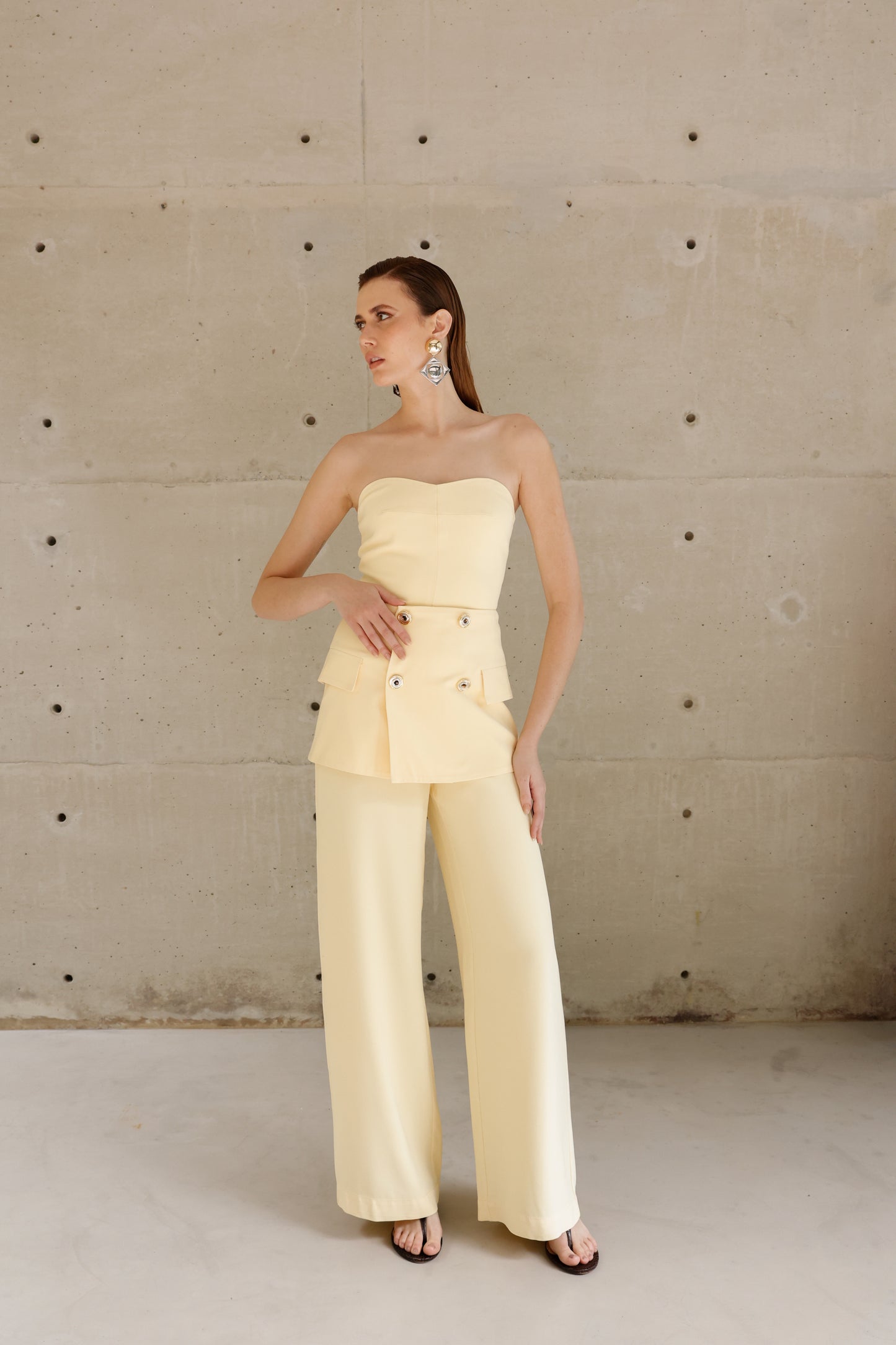 Conjunto luxuoso e delicado, com top tomara que caia realçando a silhueta através do lastex estrategicamente posicionado nas costas, proporcionando ajuste impecável e conforto absoluto. A calça de corte reto se transforma em peça statement com o sofisticado peplum na cintura, adornado por botões brilhantes que conferem um toque de elegância e exclusividade. Um look que exala modernidade e sofisticação, perfeito para quem deseja brilhar com estilo e personalidade.