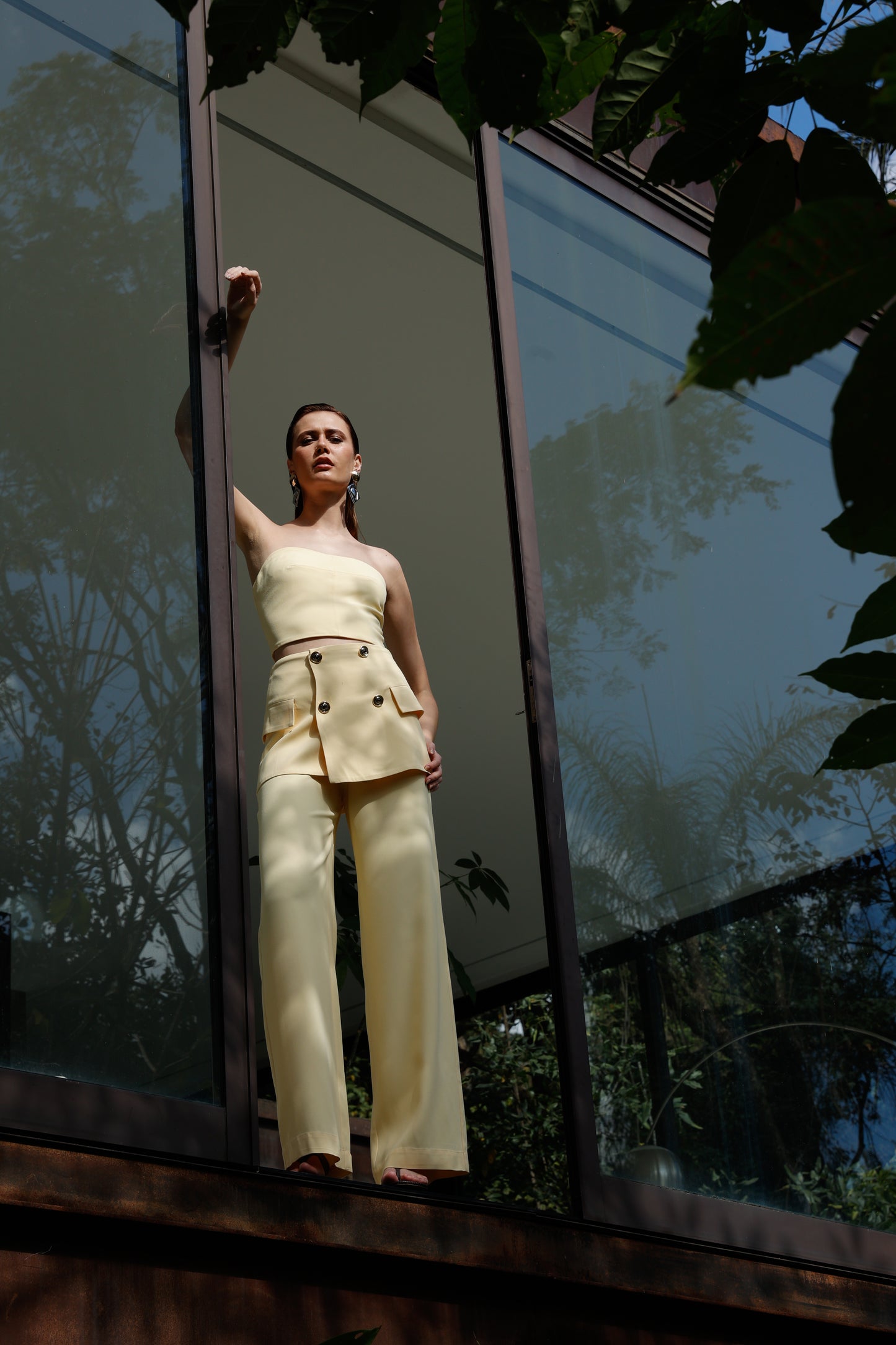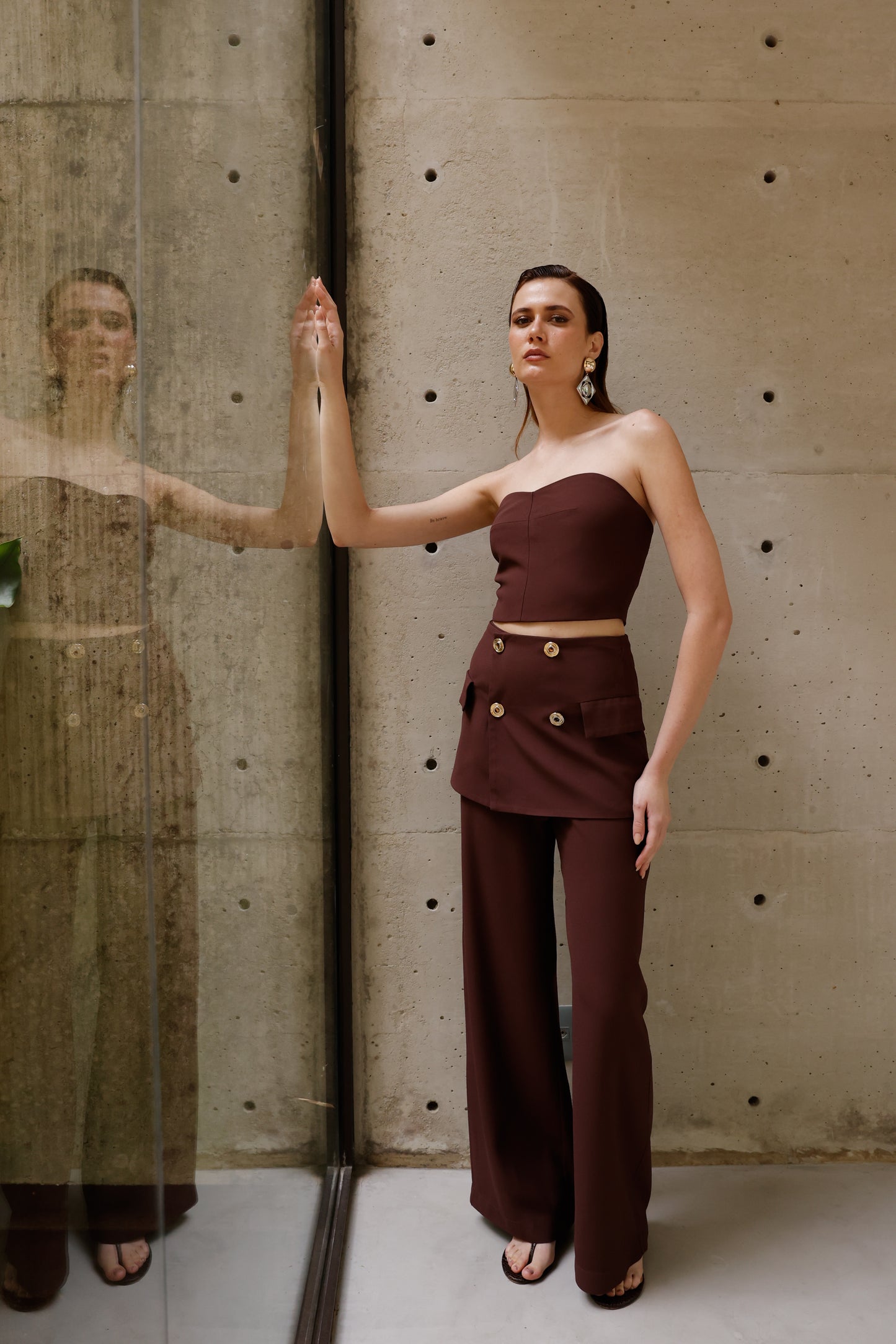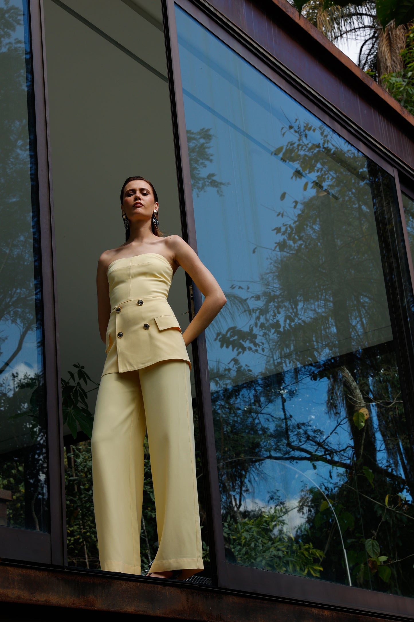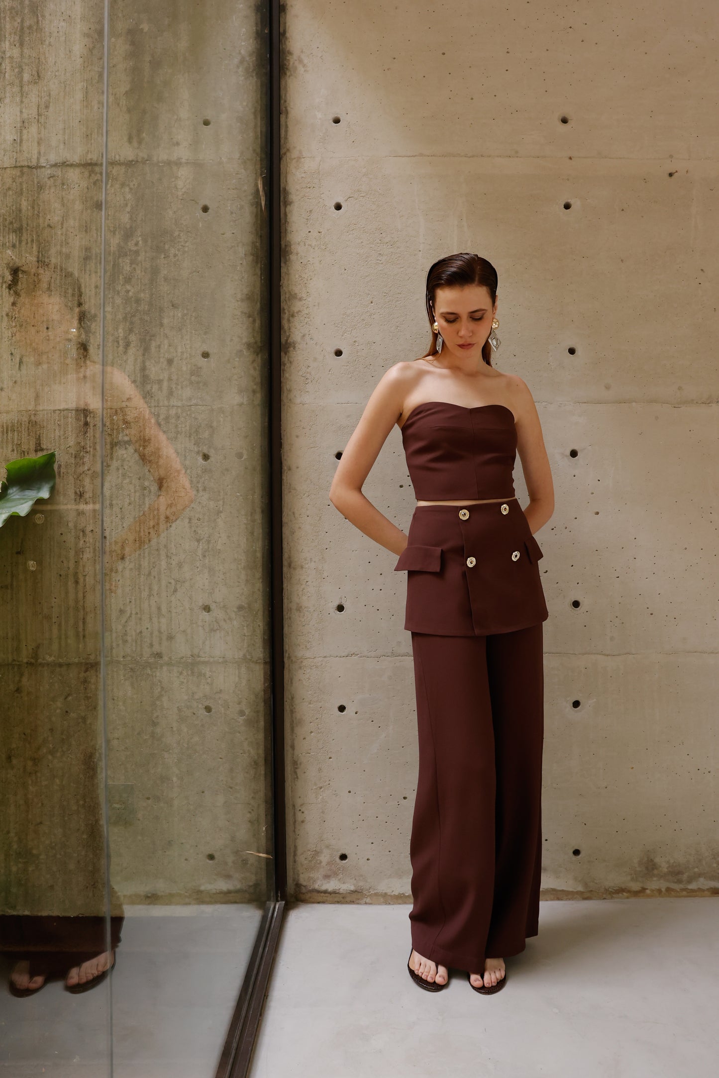 Conjunto luxuoso e delicado, com top tomara que caia realçando a silhueta através do lastex estrategicamente posicionado nas costas, proporcionando ajuste impecável e conforto absoluto. A calça de corte reto se transforma em peça statement com o sofisticado peplum na cintura, adornado por botões brilhantes que conferem um toque de elegância e exclusividade. Um look que exala modernidade e sofisticação, perfeito para quem deseja brilhar com estilo e personalidade.