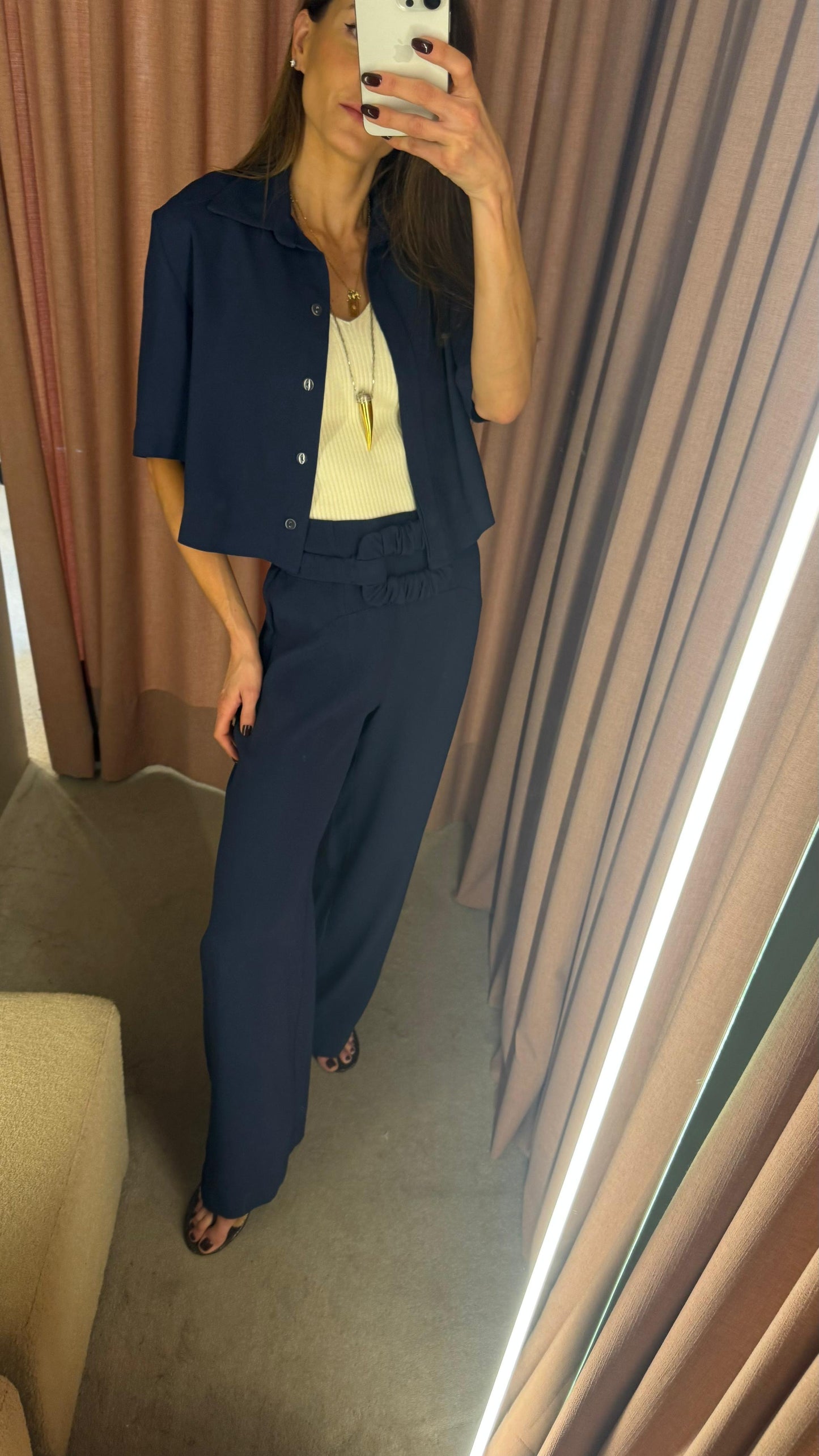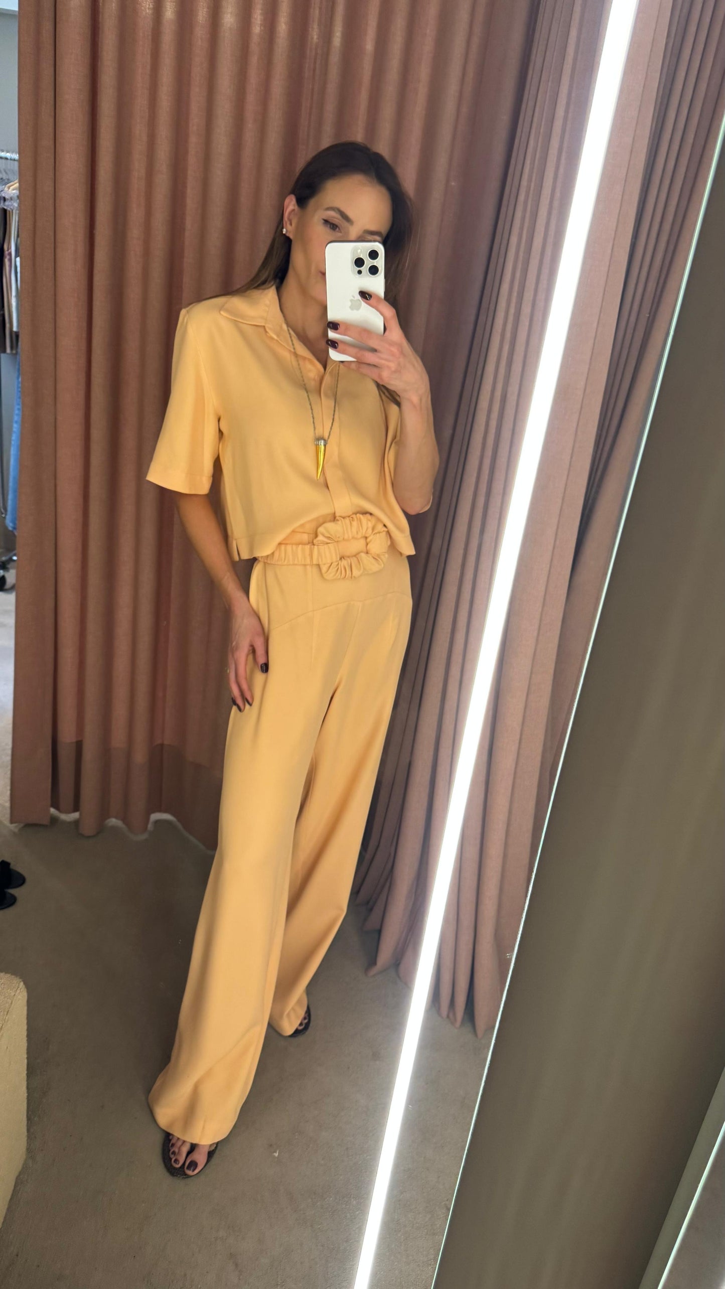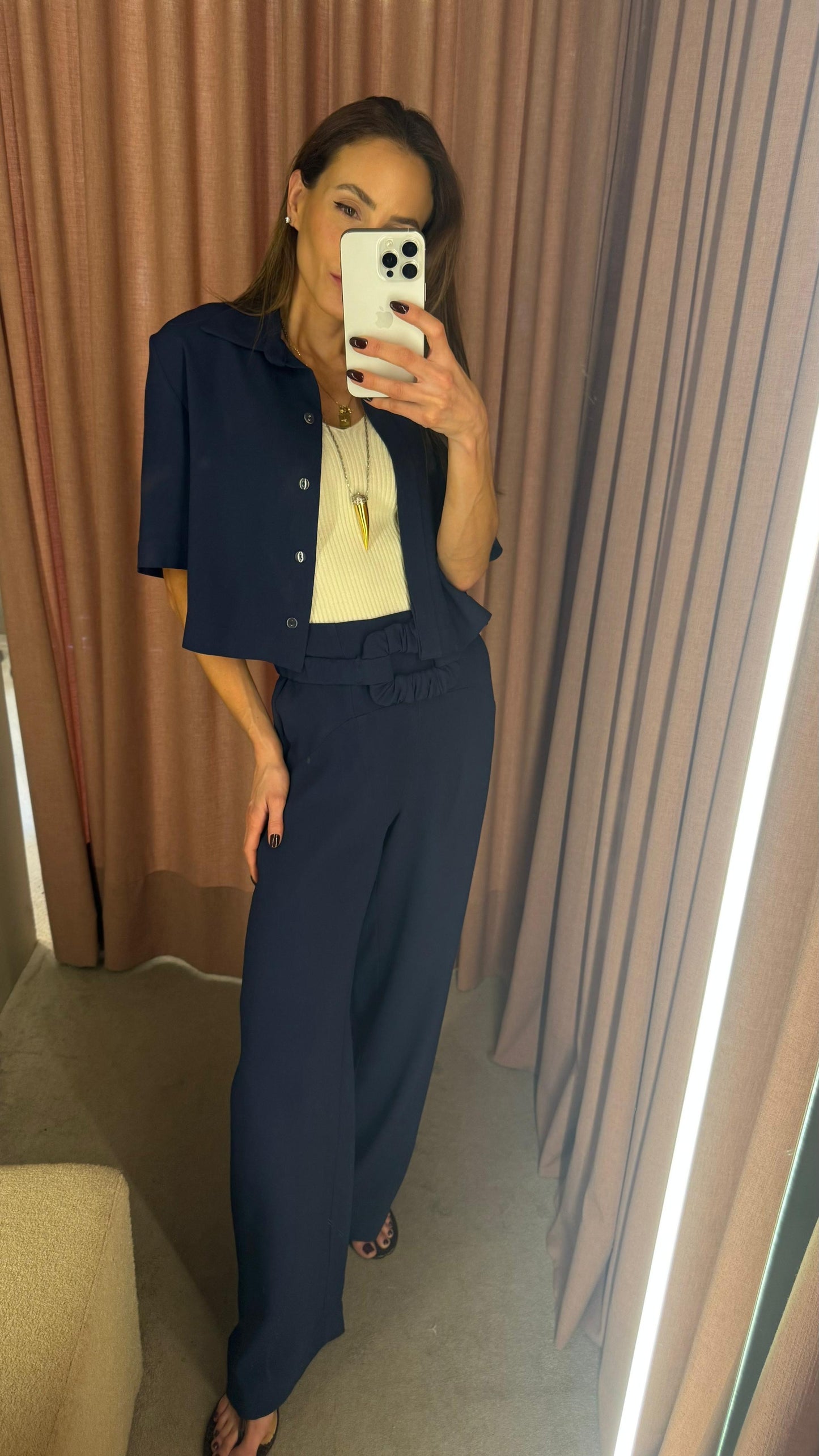 Este conjunto em crepe é a definição de estilo refinado com um toque atual. A camisa estilo cropped com botões e manga curta traz leveza e modernidade, perfeita para compor looks sofisticados sem abrir mão do conforto. A calça de corte reto, com zíper nas costas e acabamento impecável, alonga a silhueta e garante um caimento elegante. O cinto que acompanha valoriza a cintura e adiciona um detalhe extra de sofisticação. Ideal para quem busca um visual poderoso, seja no trabalho, em eventos ou para um dia especial.