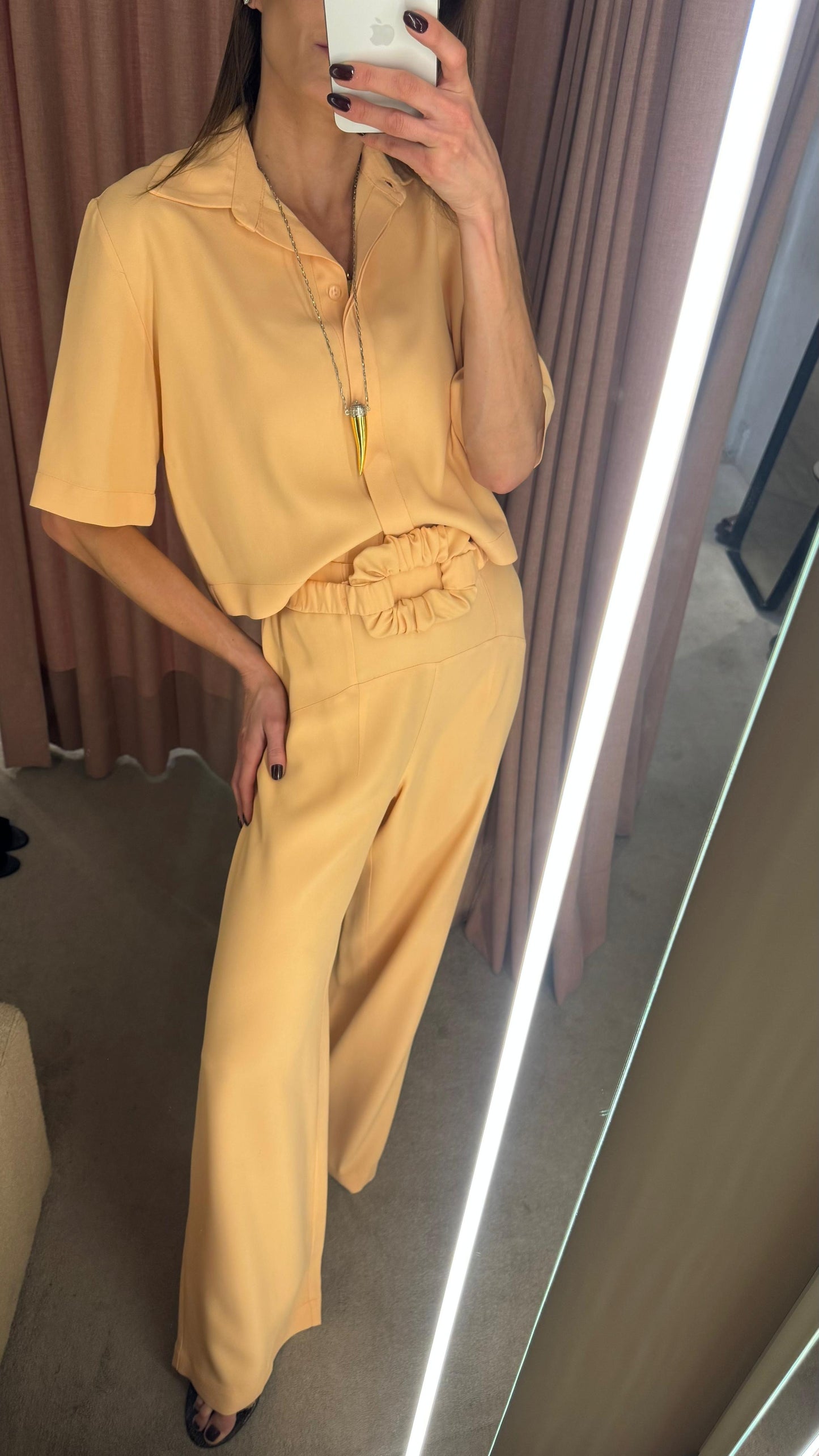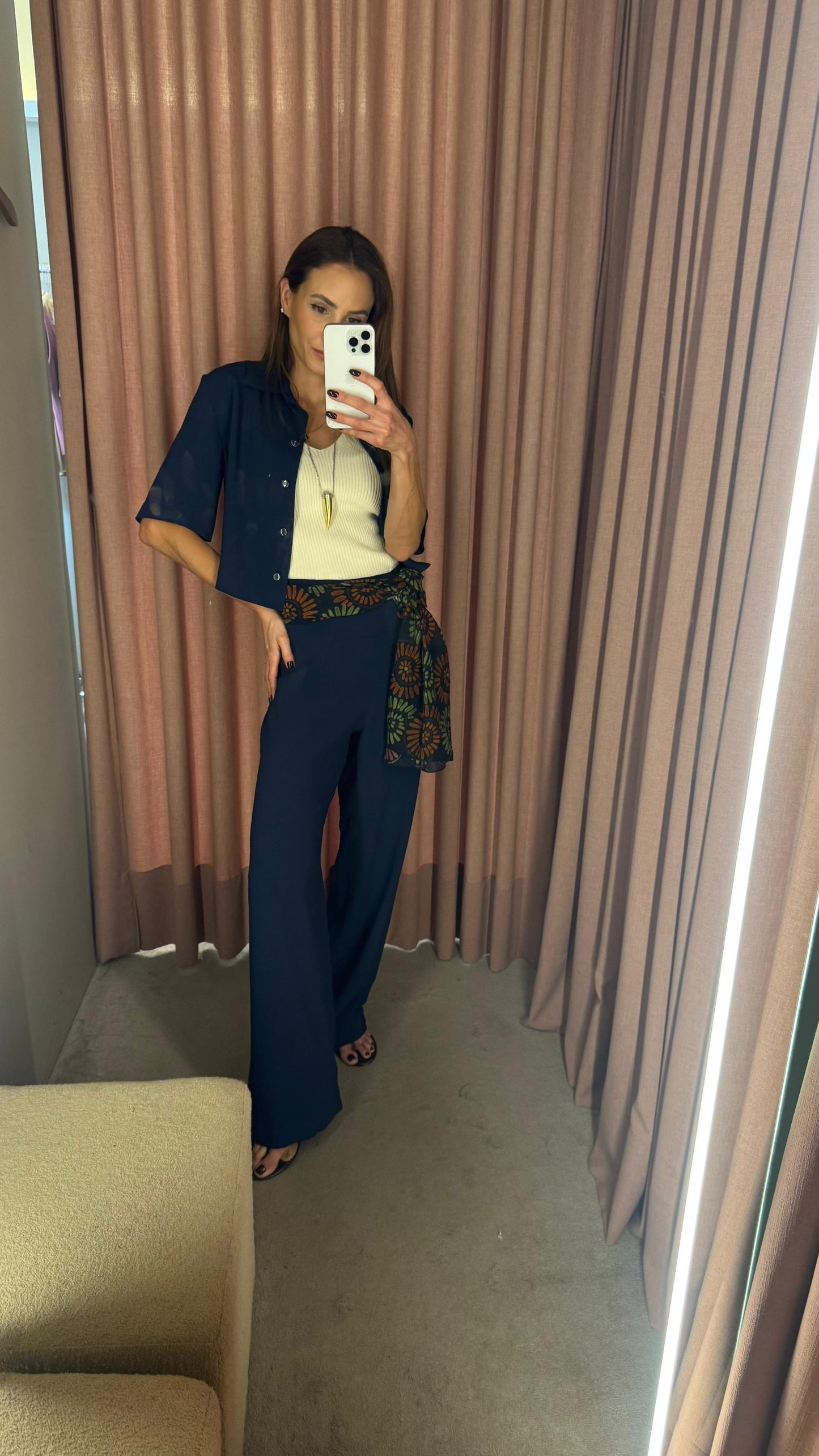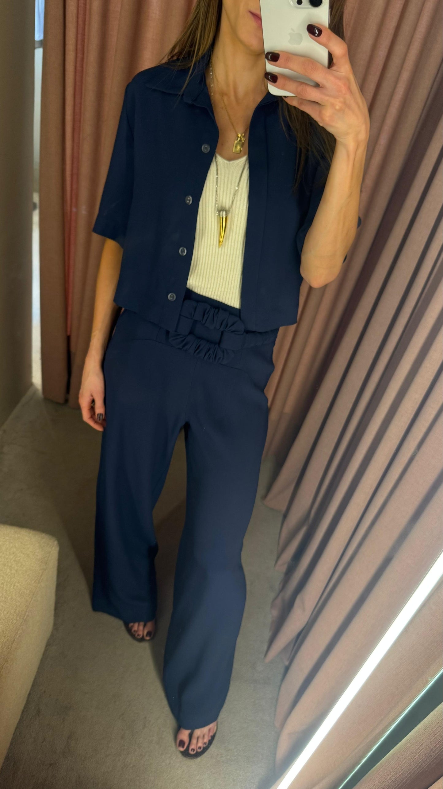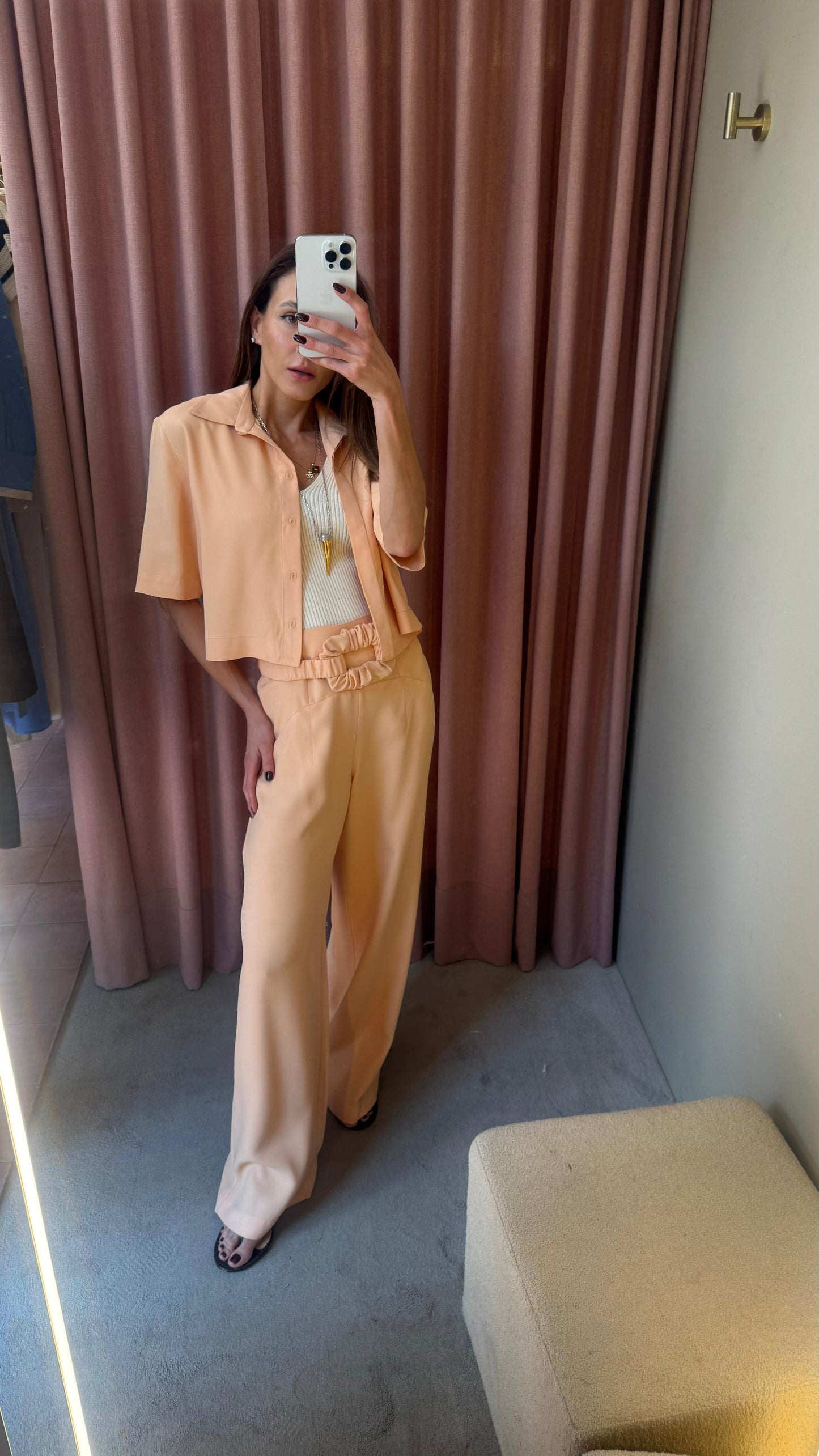 Este conjunto em crepe é a definição de estilo refinado com um toque atual. A camisa estilo cropped com botões e manga curta traz leveza e modernidade, perfeita para compor looks sofisticados sem abrir mão do conforto. A calça de corte reto, com zíper nas costas e acabamento impecável, alonga a silhueta e garante um caimento elegante. O cinto que acompanha valoriza a cintura e adiciona um detalhe extra de sofisticação. Ideal para quem busca um visual poderoso, seja no trabalho, em eventos ou para um dia especial.