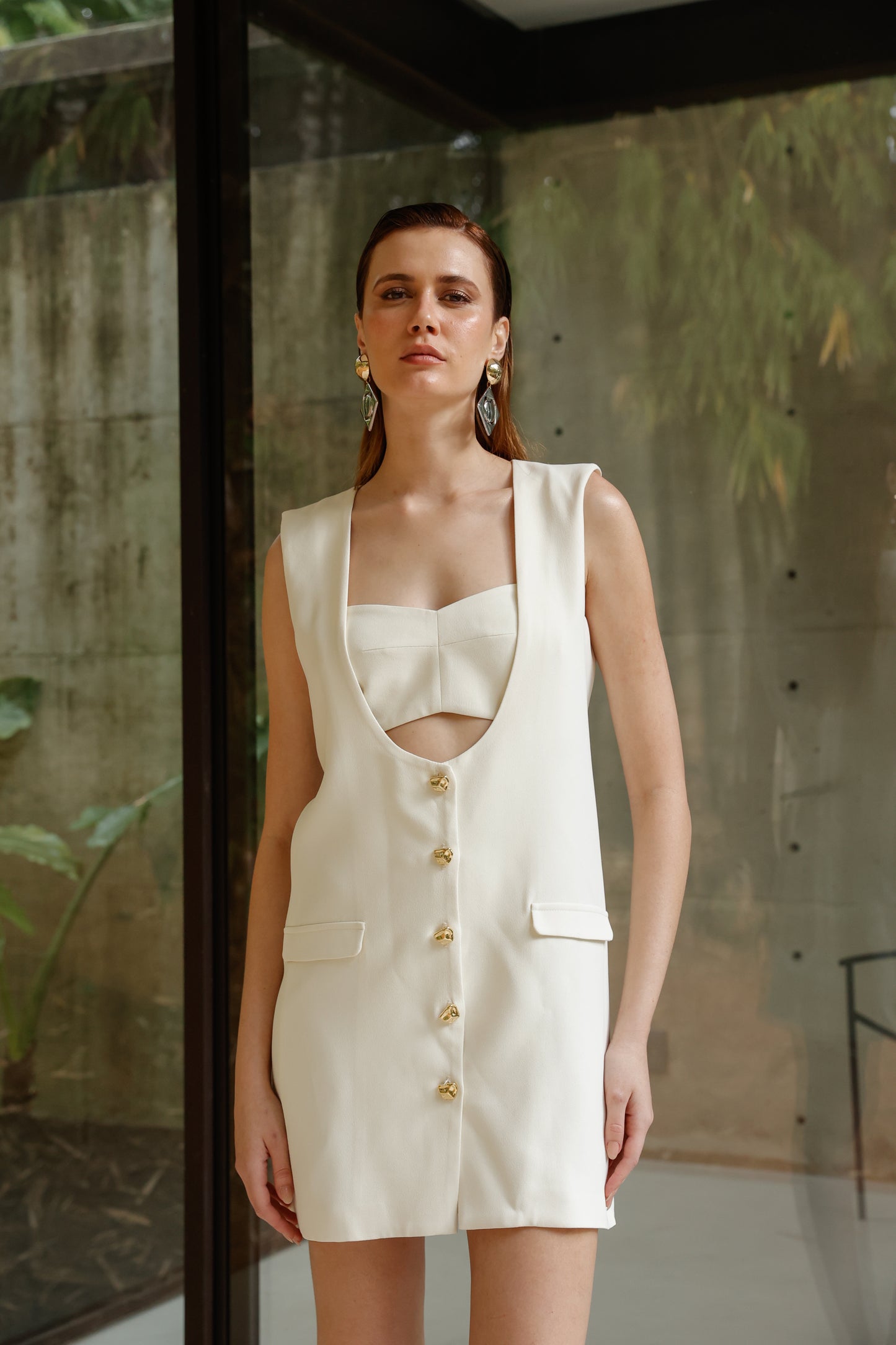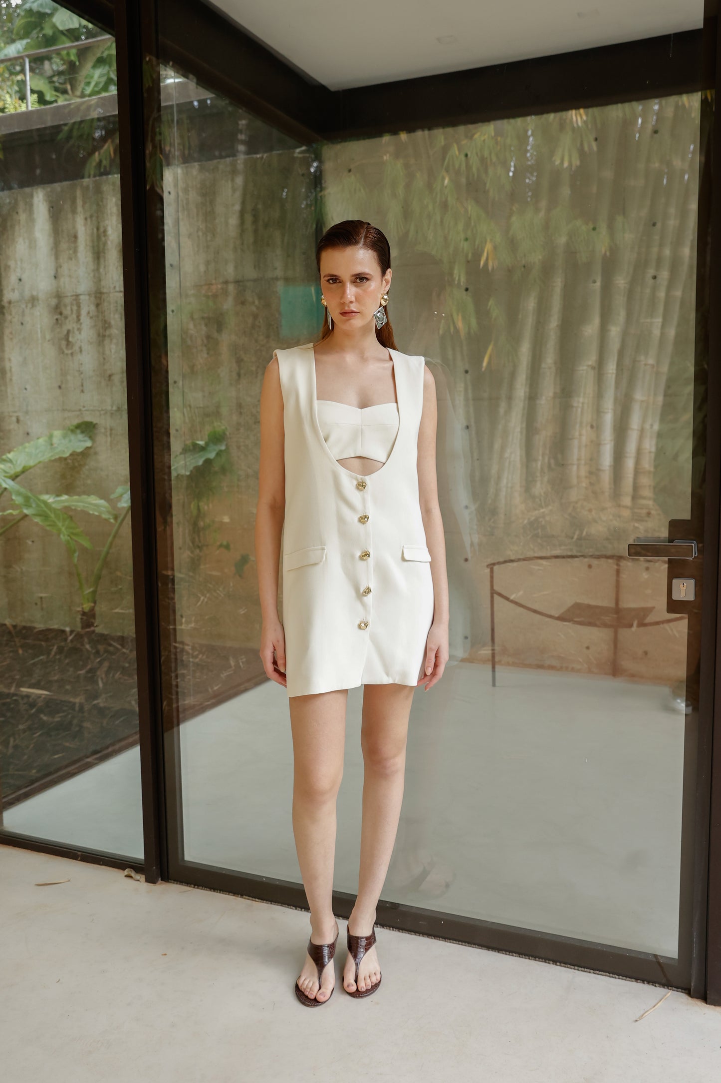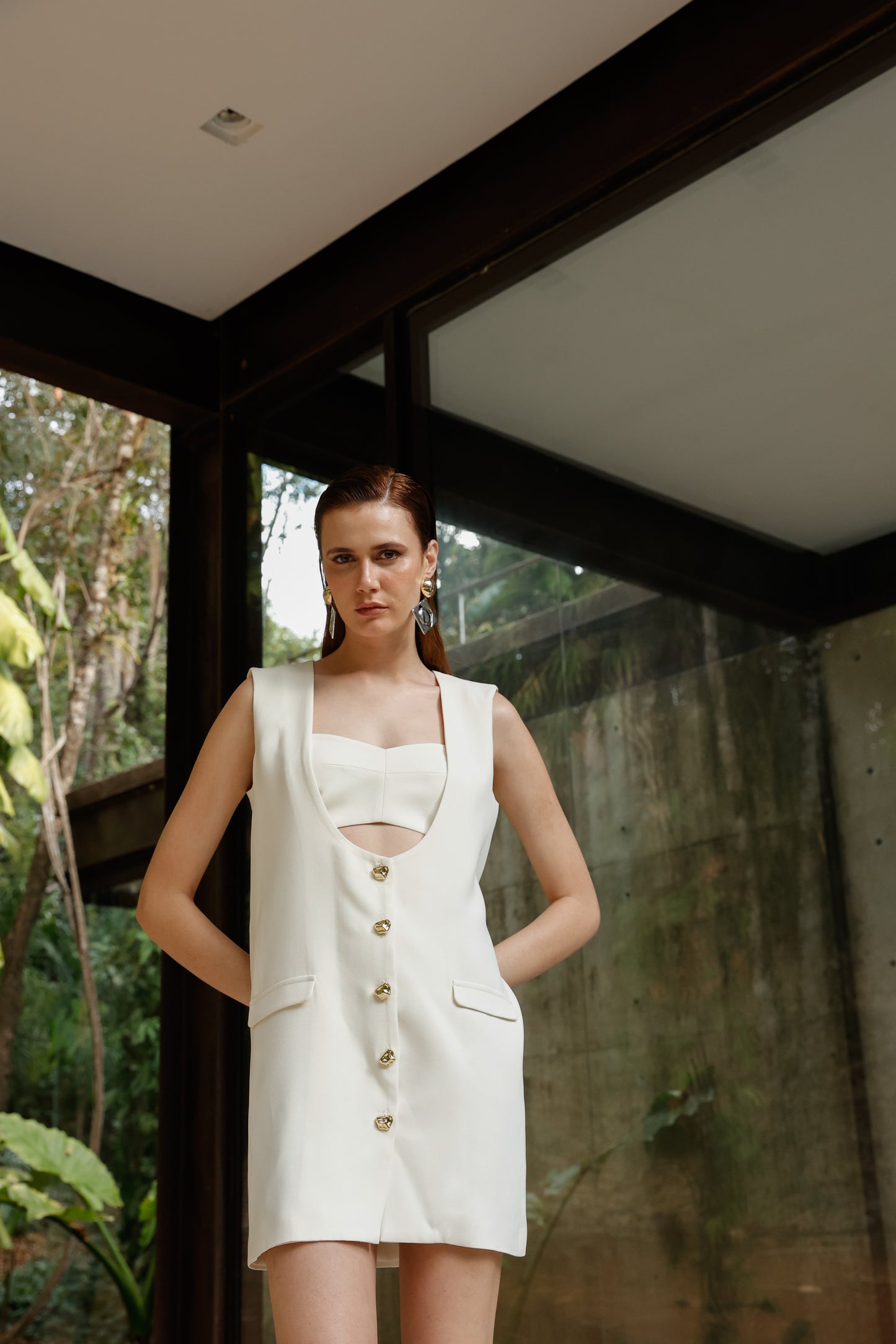 Com visual de blazer oversized reinterpretado em formato de vestido, essa peça entrega um equilíbrio perfeito entre alfaiataria clássica e sensualidade contemporânea. O decote profundo valoriza o colo com ousadia elegante, enquanto os botões encapados frontais e os bolsos importados trazem sofisticação à proposta. A estrutura da modelagem ao longo da silhueta, e o comprimento mini garantem leveza e frescor.