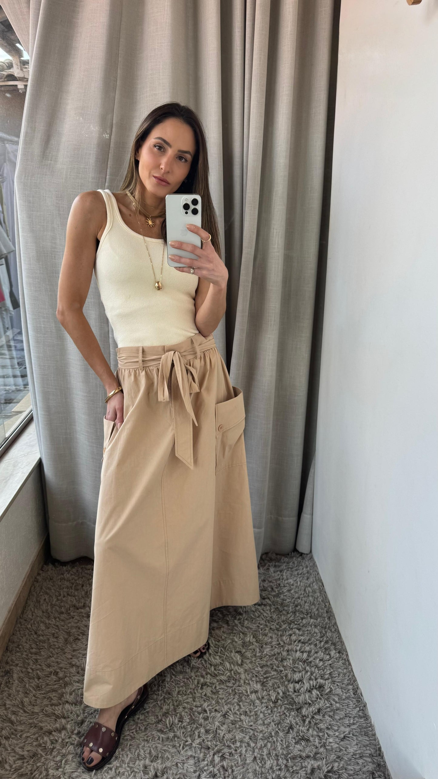 Saia Midi Utility Elegance - Com cinto ajustável. Um clássico com toque contemporâneo. A saia midi em tom terroso une a elegância de uma peça atemporal com detalhes utilitários que trazem identidade ao look. Seu caimento estruturado acompanha pregas frontais suaves, que conferem movimento sem perder a forma. O grande destaque está nos bolsos utilitários laterais amplos, funcionais e cheios de estilo, além do cinto do mesmo tecido, com passantes e amarração ajustável, que marca a cintura e reforça o visual moderno e autêntico. Versátil e estilosa, vai do casual ao elegante com apenas a troca de acessórios — combine com tops minimalistas ou camisas para um visual chic urbano.
