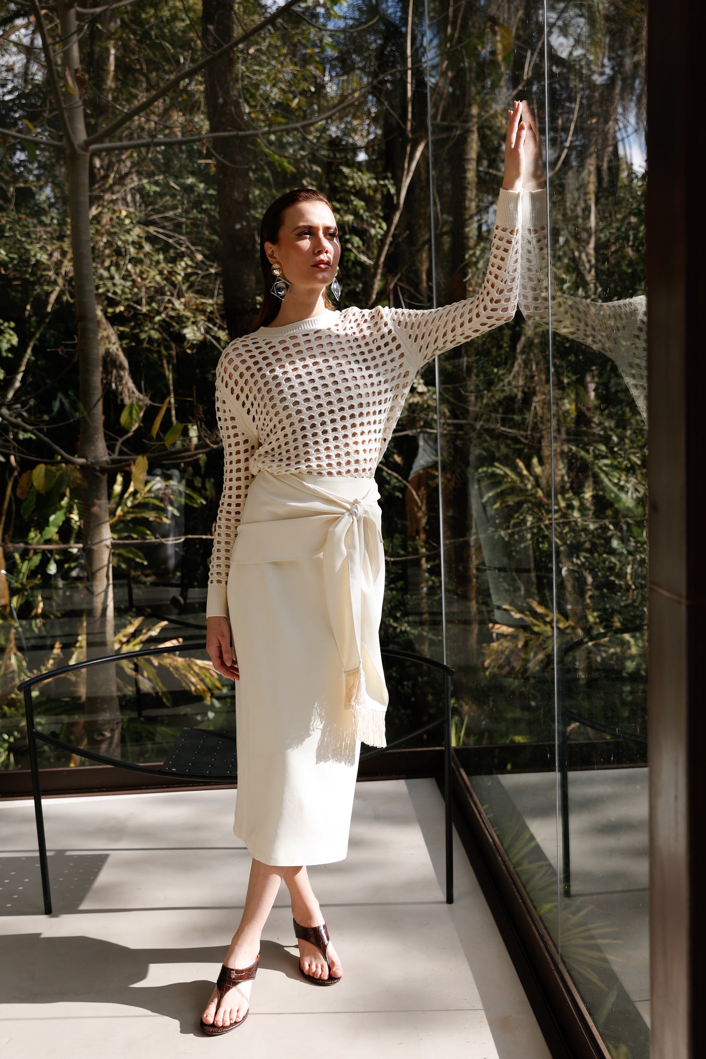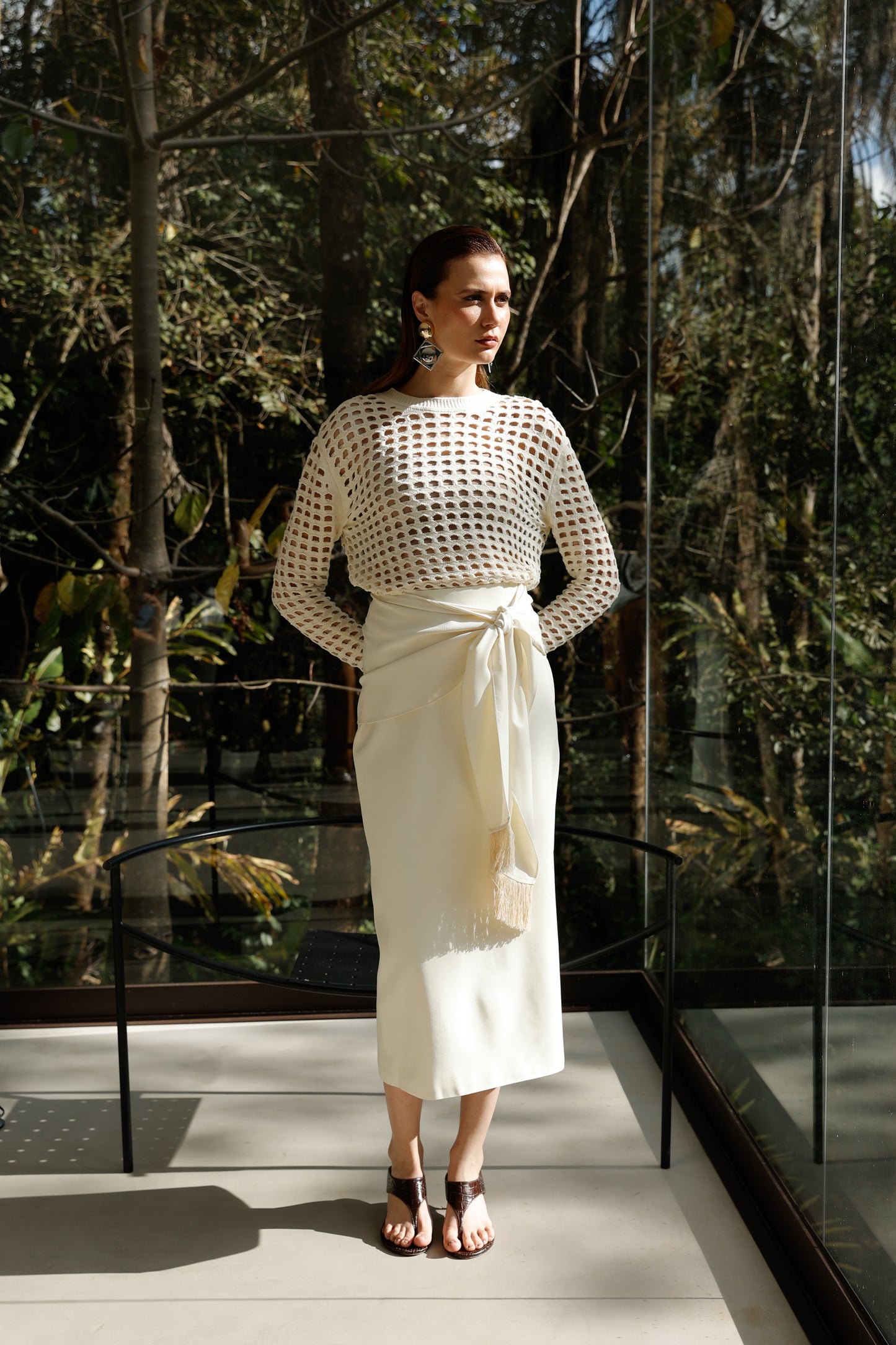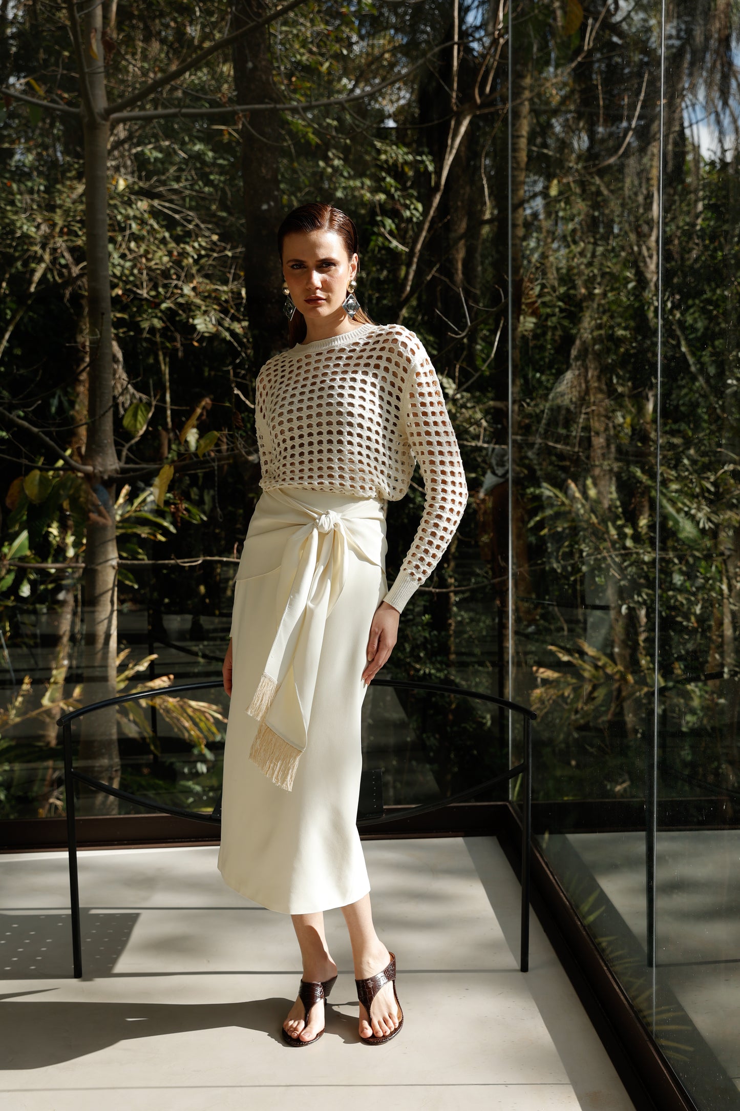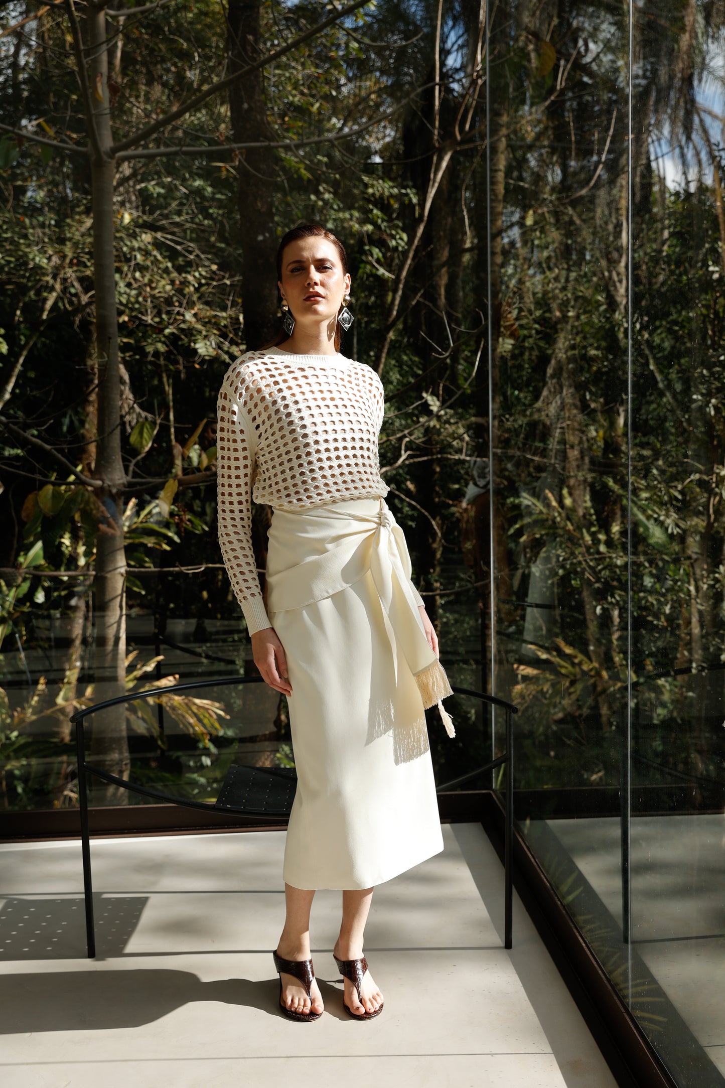 Saia midi em tecido leve de alfaiataria, com caimento fluido e sofisticado. O grande destaque fica por conta do cinto tipo faixa, que se amarra na cintura criando um efeito de laço marcante — suas pontas alongadas com franjas sutis adicionam movimento e elegância à peça. Uma proposta versátil que transita com naturalidade entre o casual refinado e ocasiões especiais, trazendo charme artesanal e uma estética contemporânea e feminina.