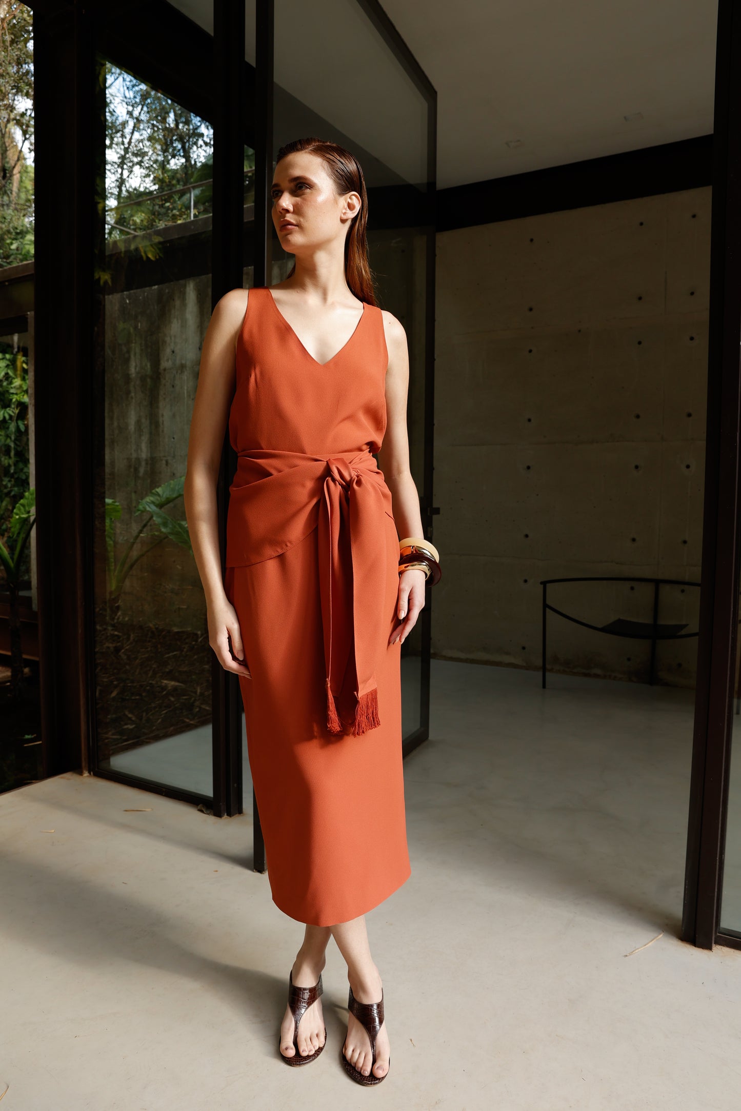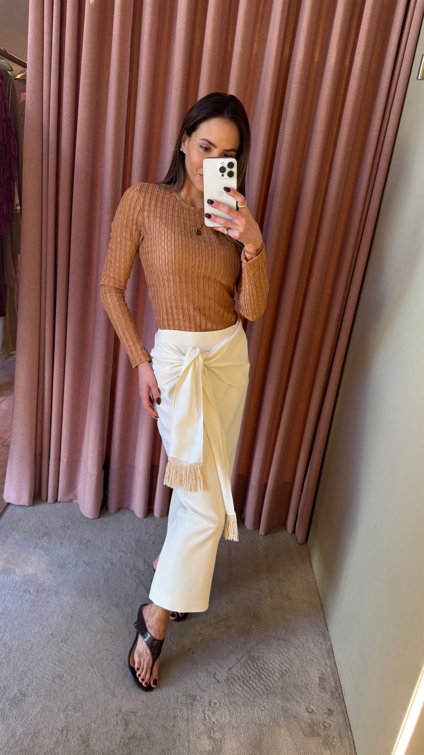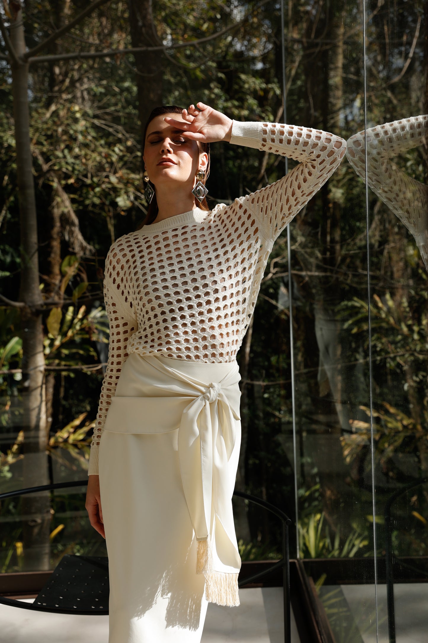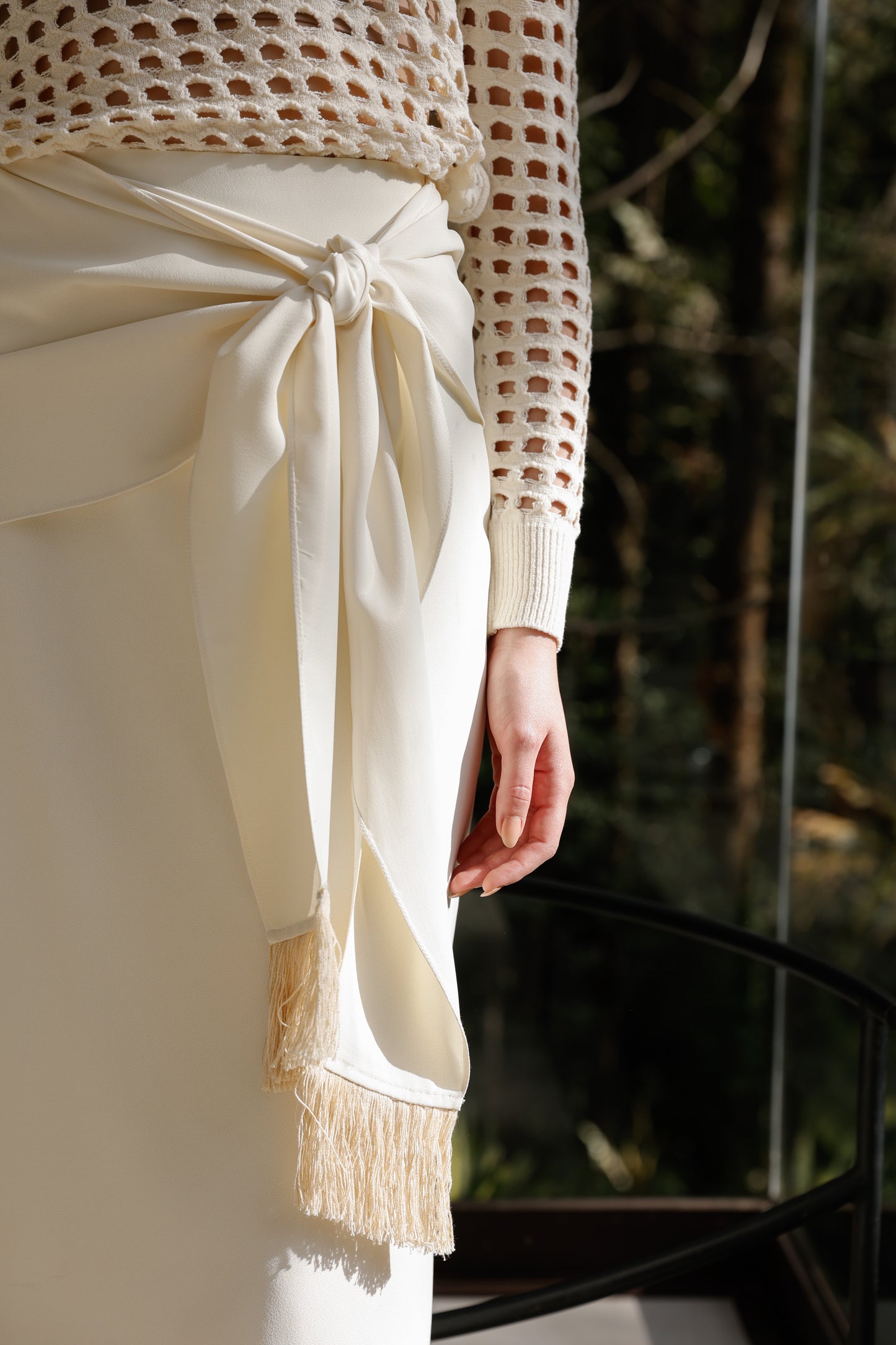 Saia midi em tecido leve de alfaiataria, com caimento fluido e sofisticado. O grande destaque fica por conta do cinto tipo faixa, que se amarra na cintura criando um efeito de laço marcante — suas pontas alongadas com franjas sutis adicionam movimento e elegância à peça. Uma proposta versátil que transita com naturalidade entre o casual refinado e ocasiões especiais, trazendo charme artesanal e uma estética contemporânea e feminina.