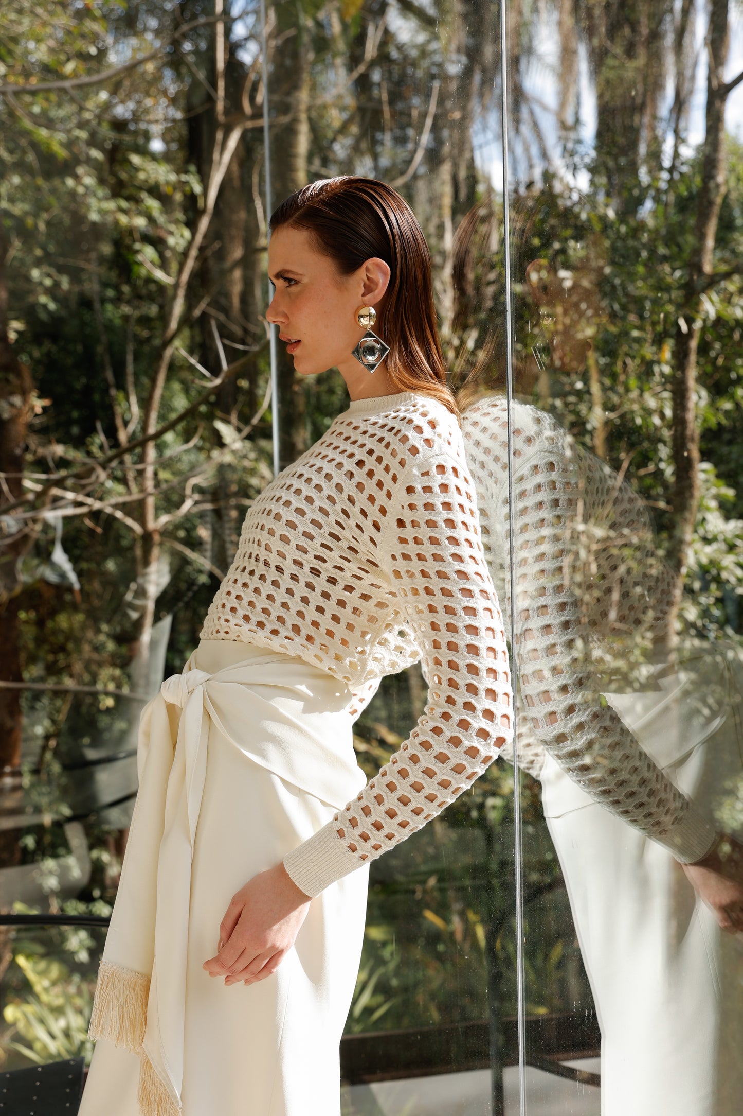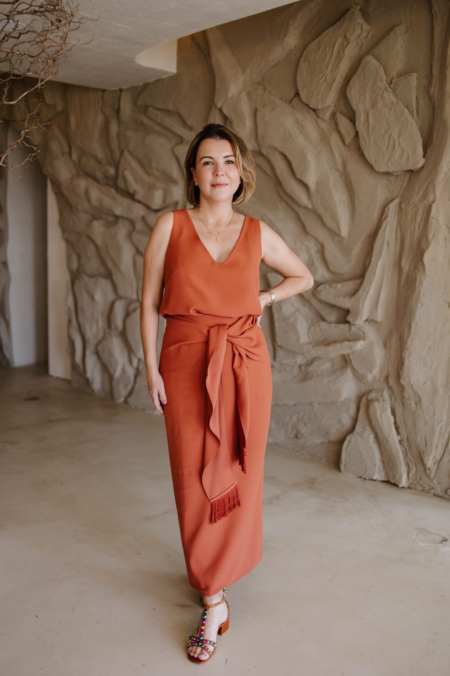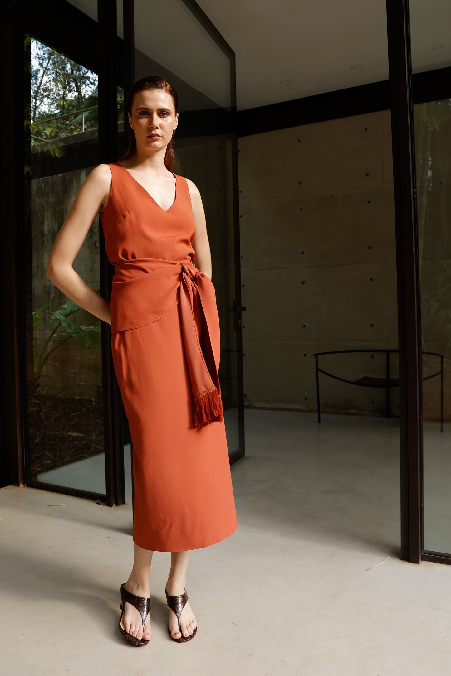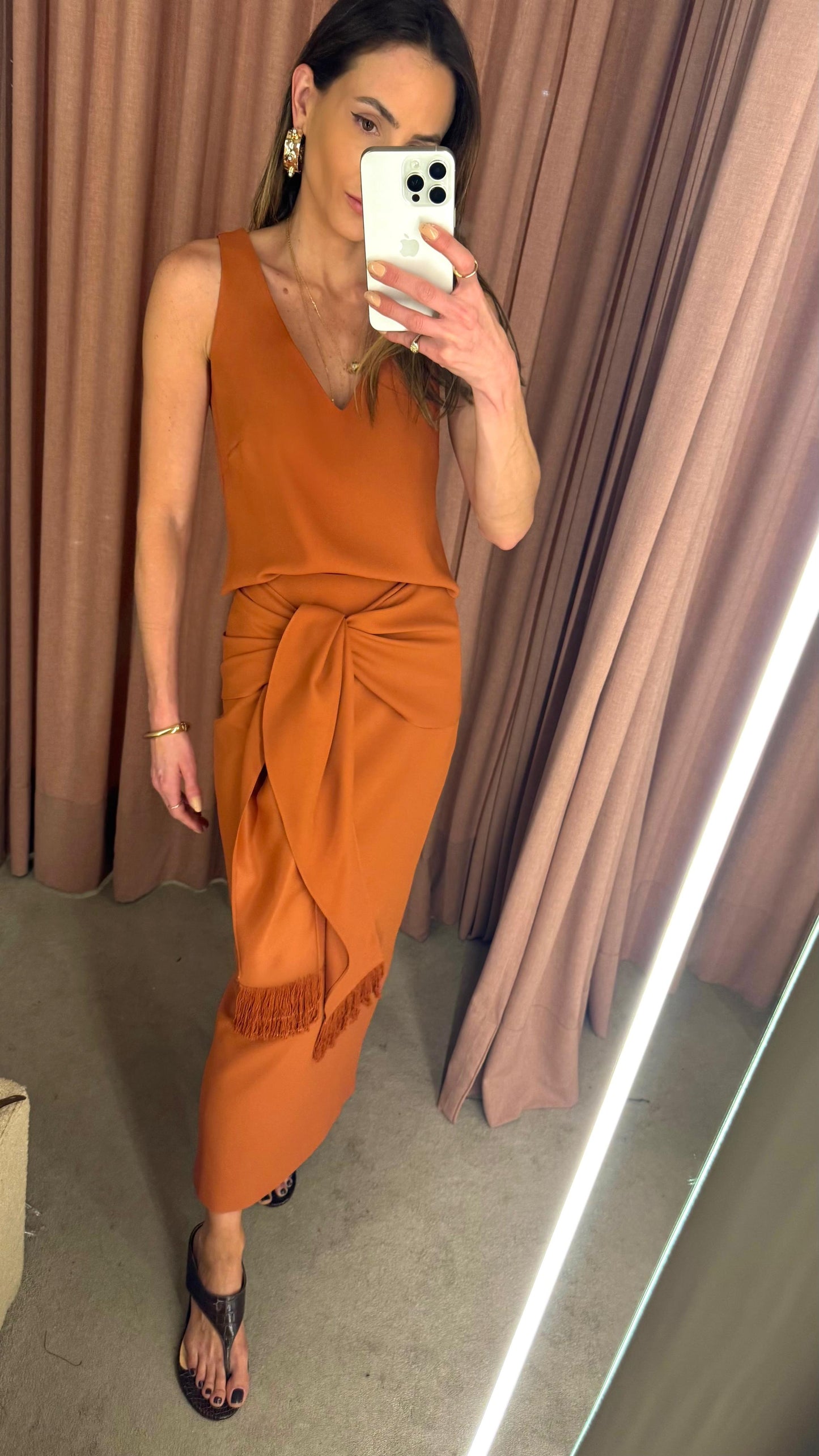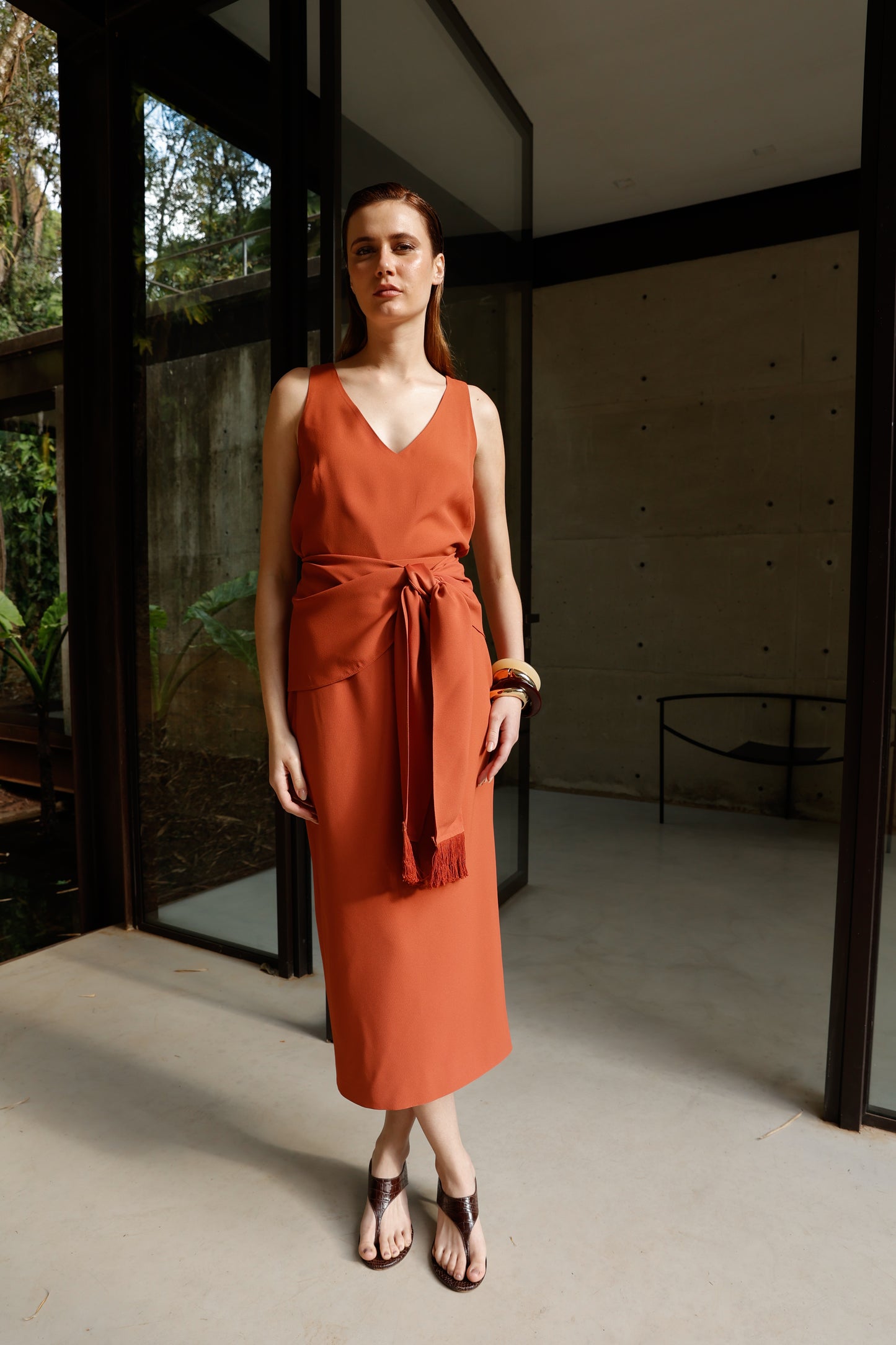 Saia midi em tecido leve de alfaiataria, com caimento fluido e sofisticado. O grande destaque fica por conta do cinto tipo faixa, que se amarra na cintura criando um efeito de laço marcante — suas pontas alongadas com franjas sutis adicionam movimento e elegância à peça. Uma proposta versátil que transita com naturalidade entre o casual refinado e ocasiões especiais, trazendo charme artesanal e uma estética contemporânea e feminina.