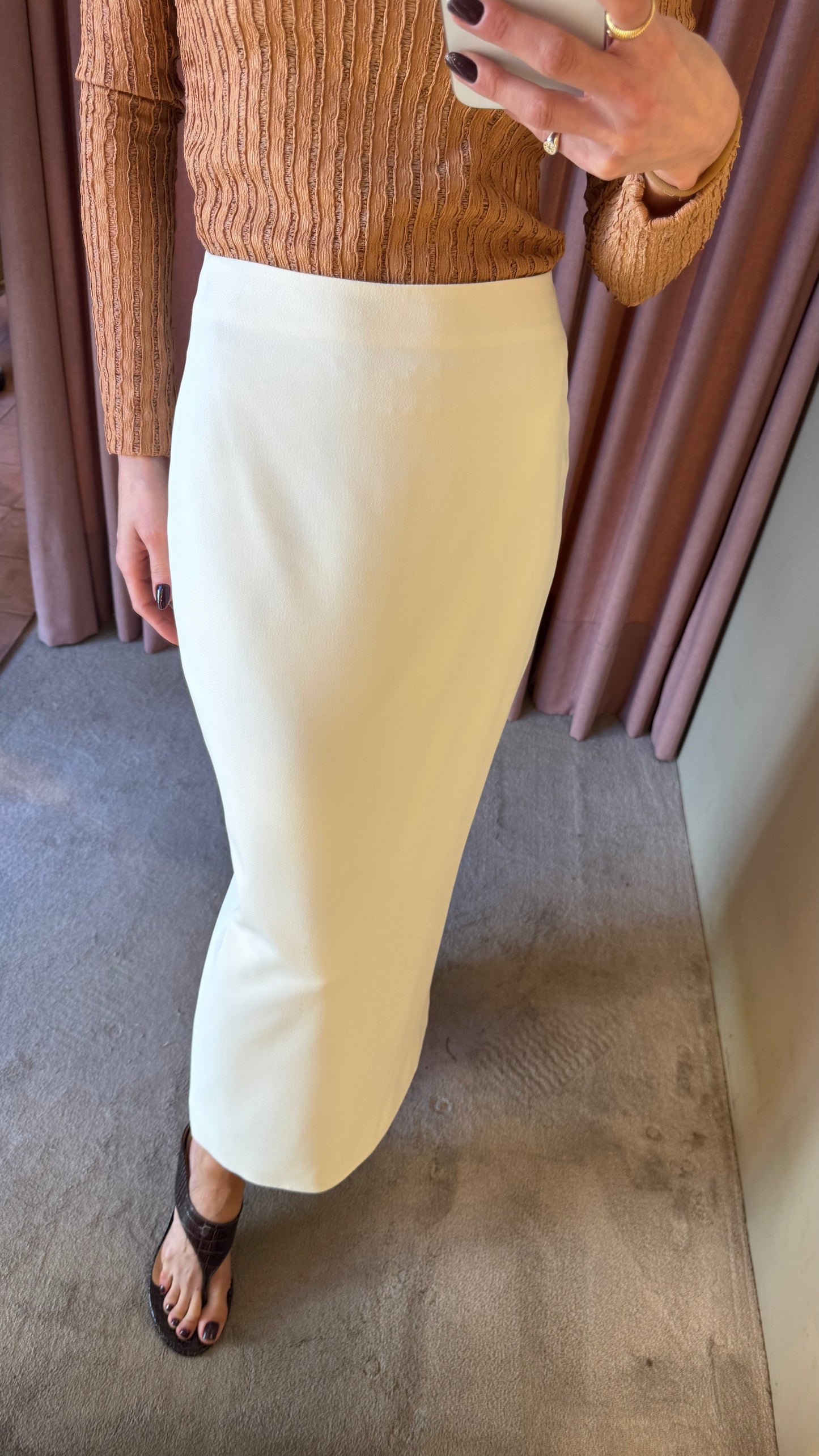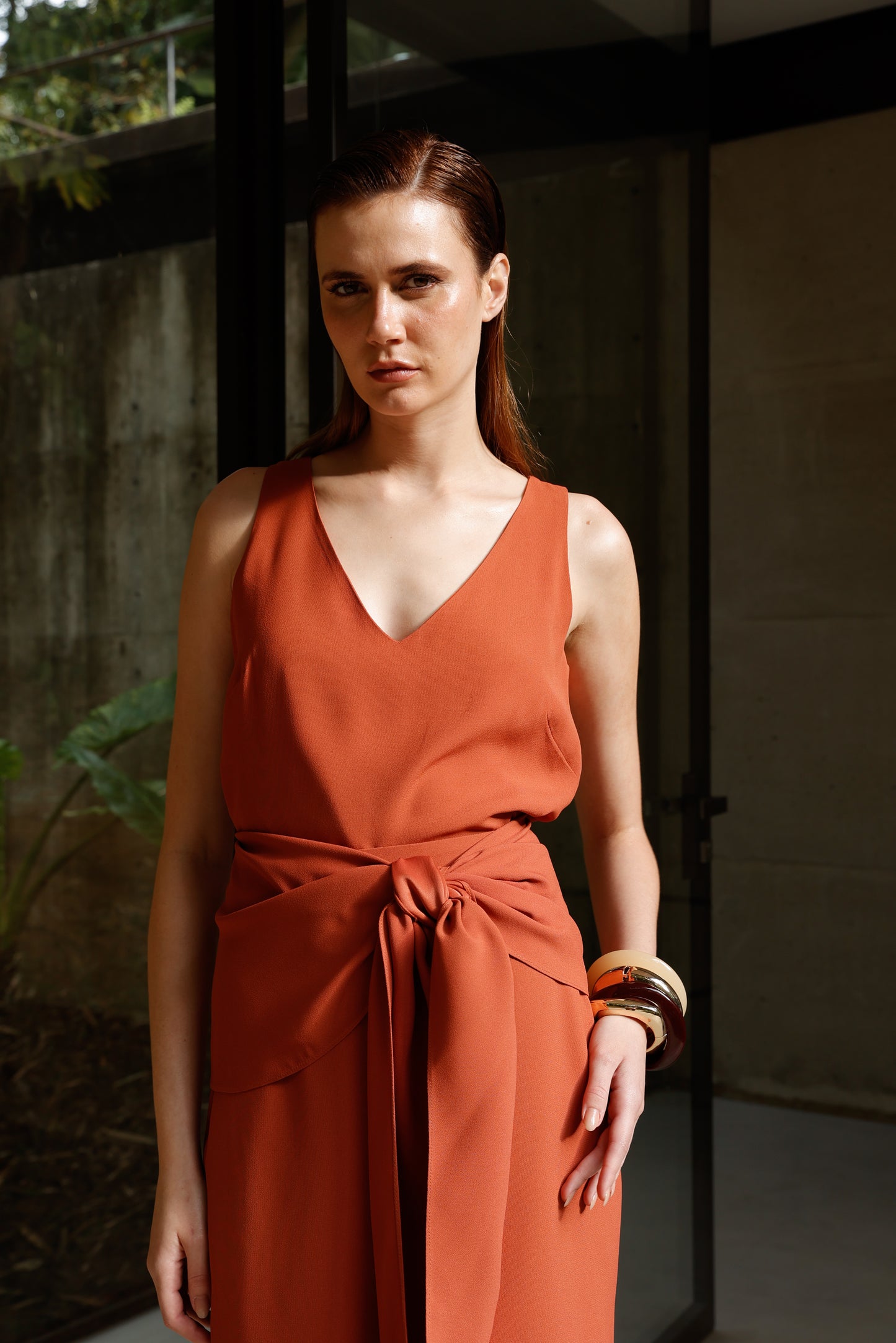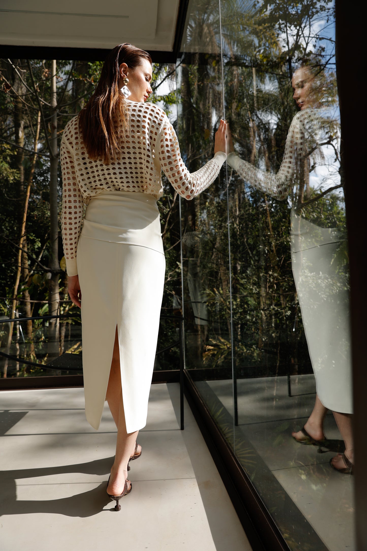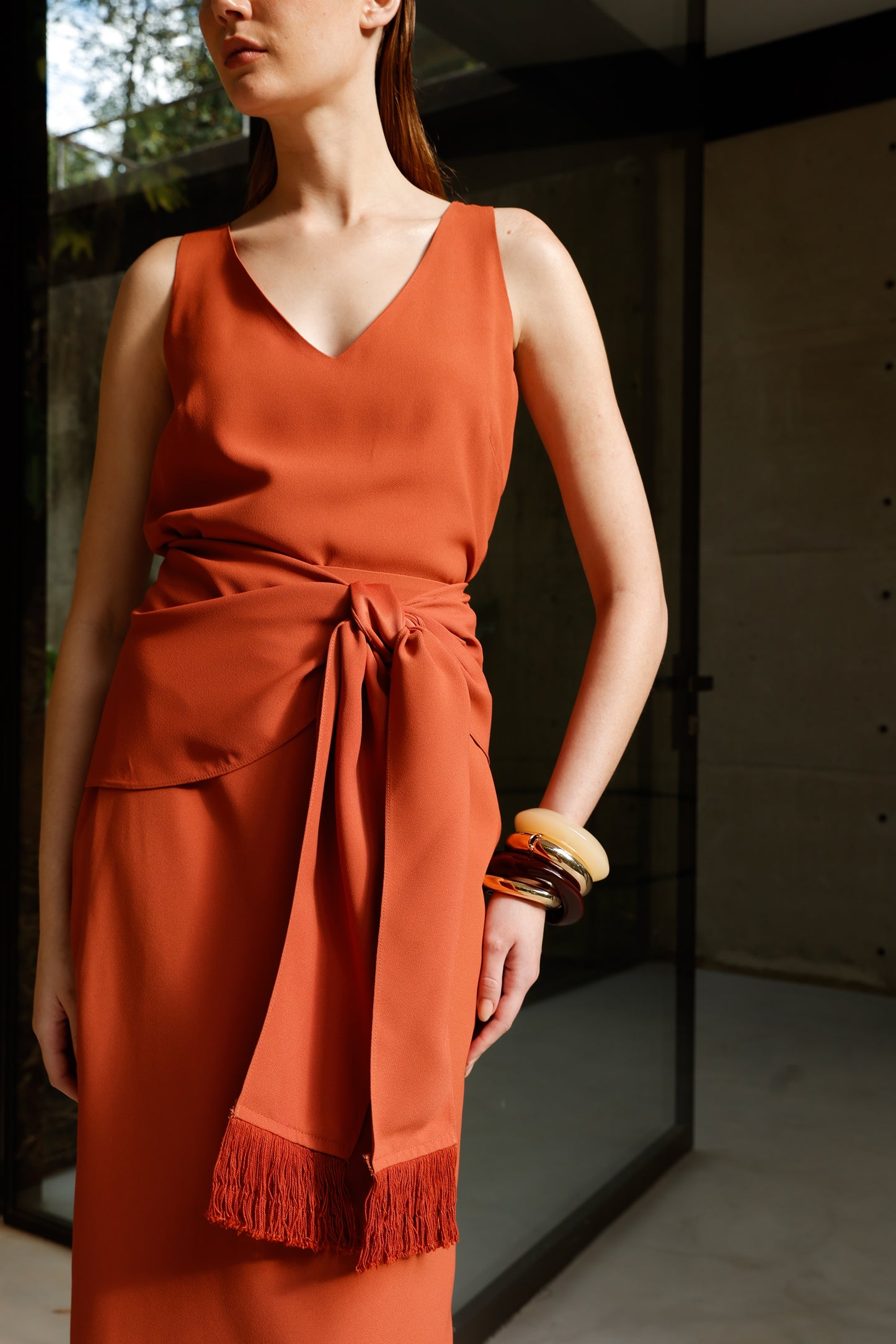 Saia midi em tecido leve de alfaiataria, com caimento fluido e sofisticado. O grande destaque fica por conta do cinto tipo faixa, que se amarra na cintura criando um efeito de laço marcante — suas pontas alongadas com franjas sutis adicionam movimento e elegância à peça. Uma proposta versátil que transita com naturalidade entre o casual refinado e ocasiões especiais, trazendo charme artesanal e uma estética contemporânea e feminina.