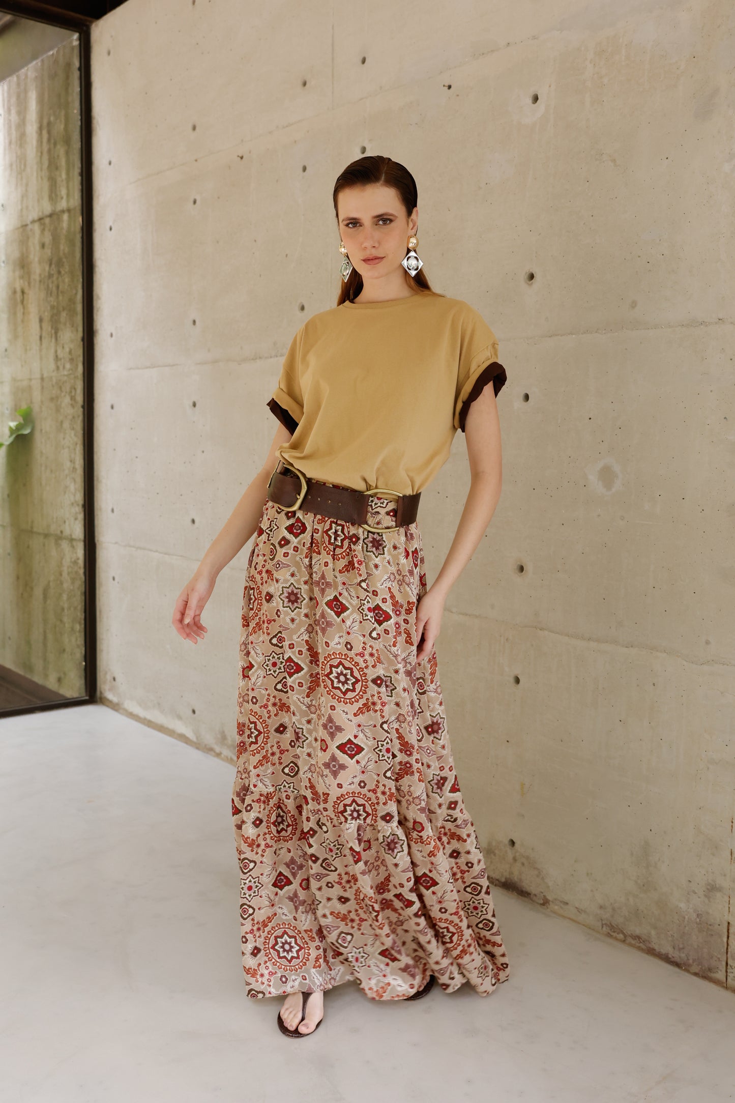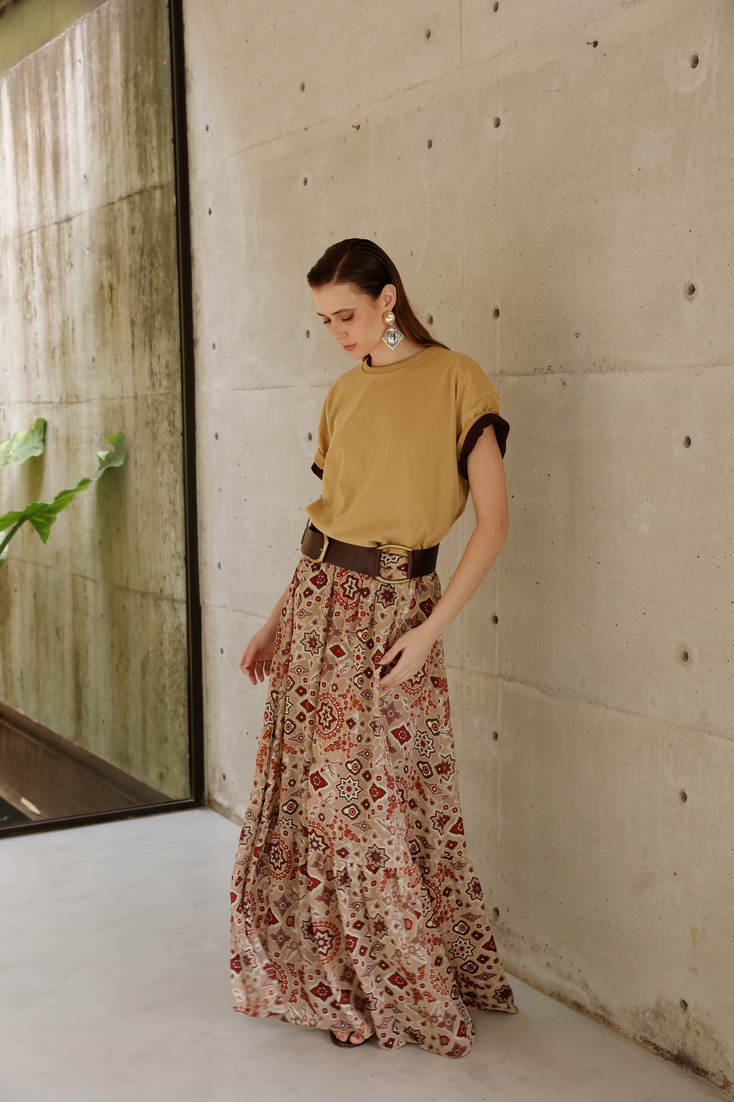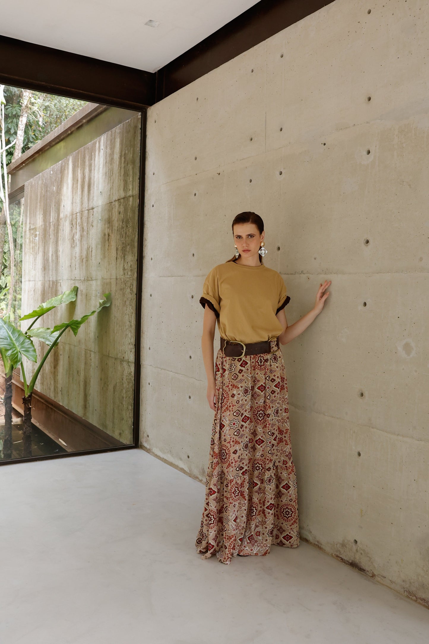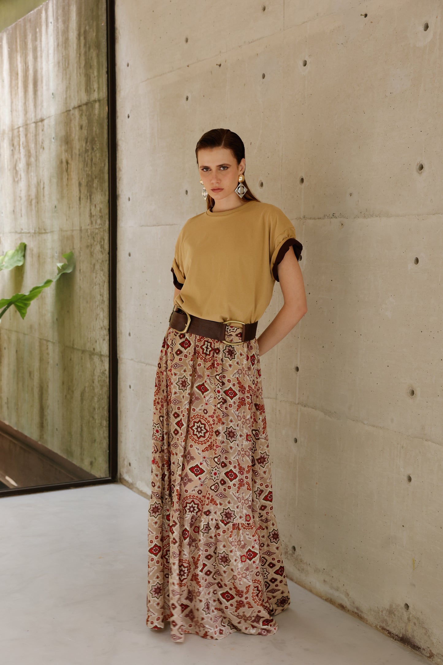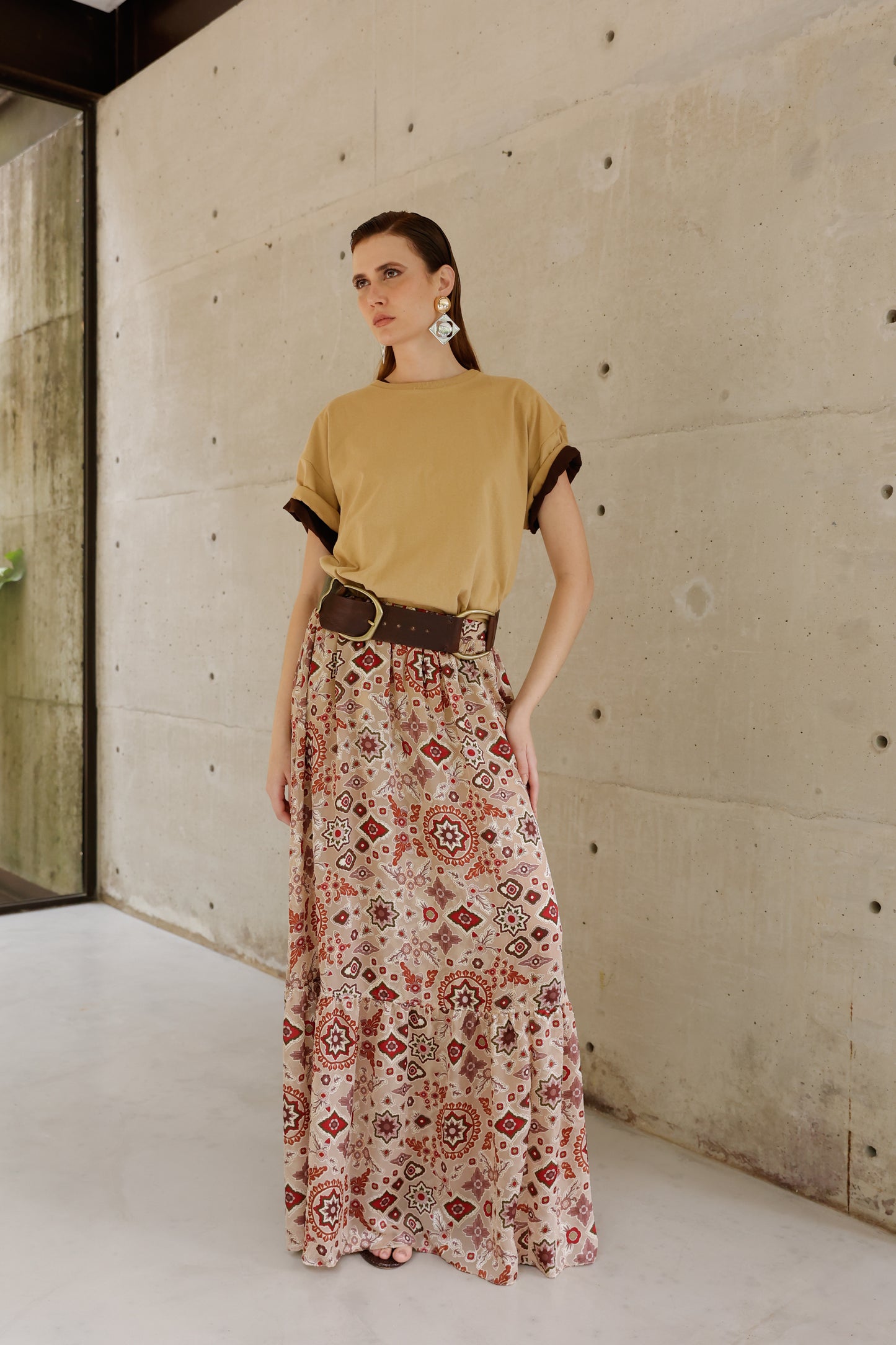 Com caimento leve e elegante, esta saia longa destaca-se pela estampa sofisticada que mistura elementos geométricos em tons terrosos e vibrantes, criando uma composição visual única. A modelagem ampla proporciona conforto e liberdade de movimento, enquanto o cinto de detalhes em couro adiciona um toque de personalidade e estrutura à peça. Versátil e cheia de atitude, é perfeita para looks que transitam do dia ao night com charme e autenticidade.