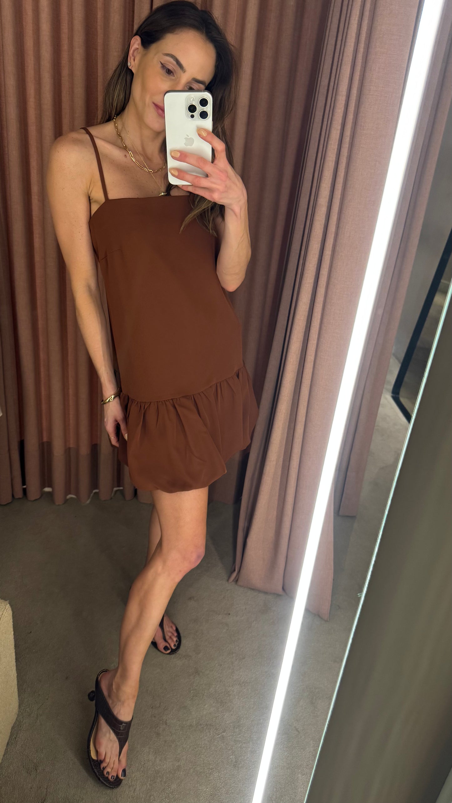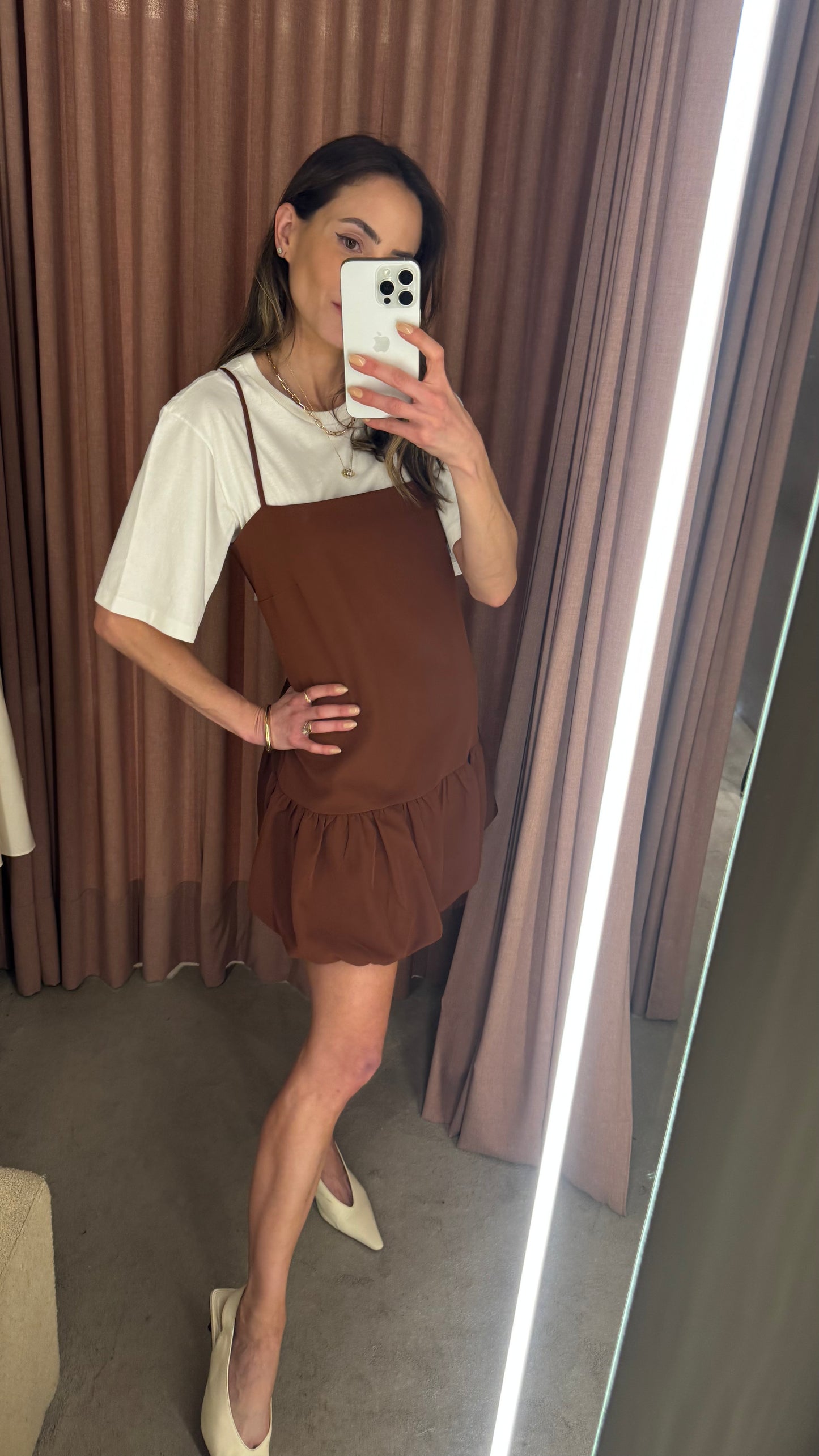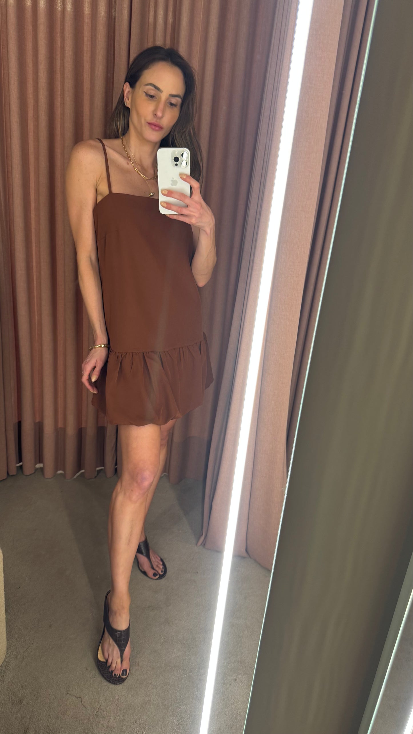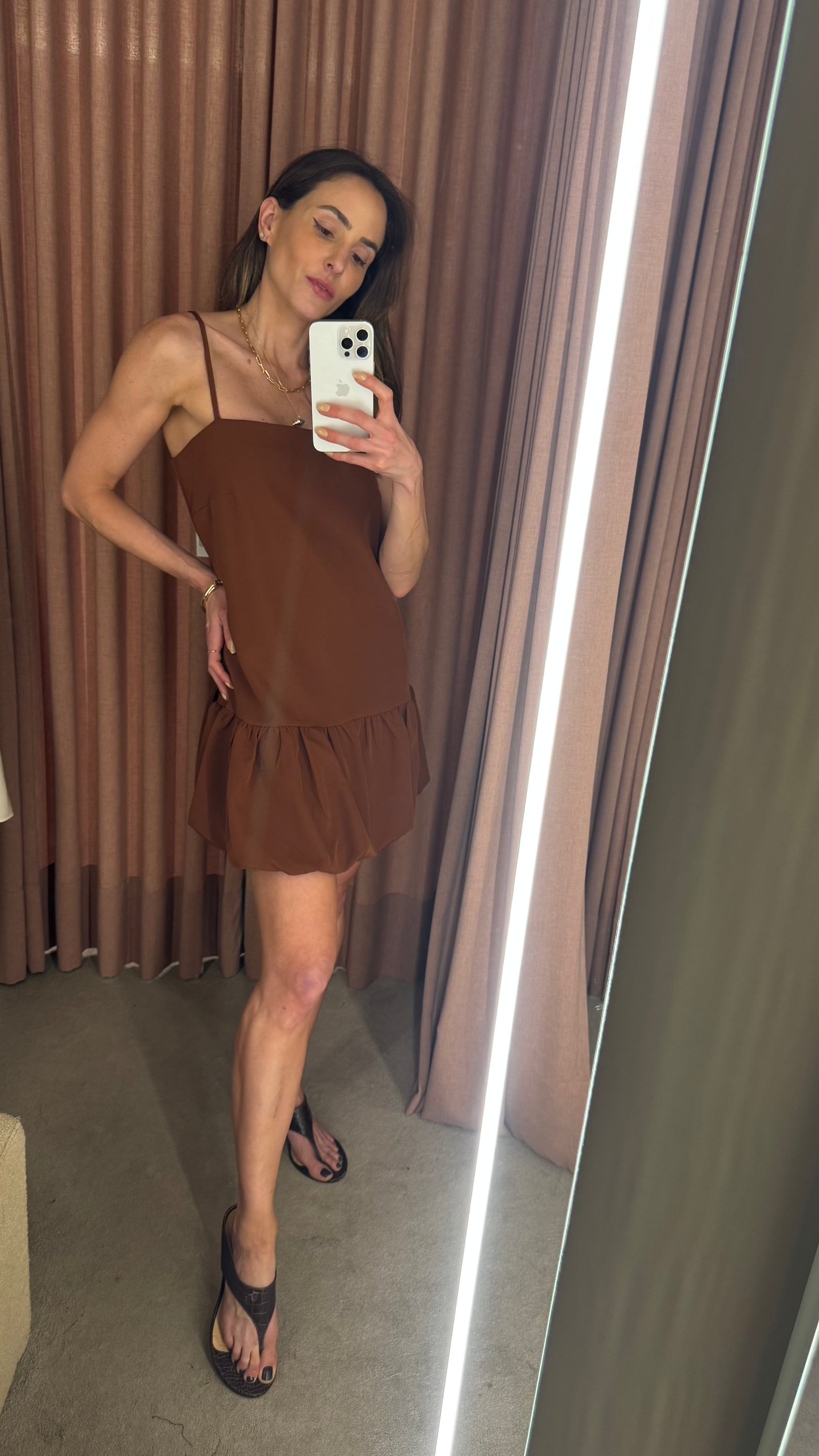 Vestido curto em tom terroso sofisticado, com alças finas e decote reto que valoriza o colo com delicadeza. A modelagem balonê na barra adiciona volume sutil e movimento, criando um visual feminino e moderno. Ideal para produções que transitam do casual chic ao look noturno com poucos complementos. Uma peça versátil com personalidade e charme atemporal.