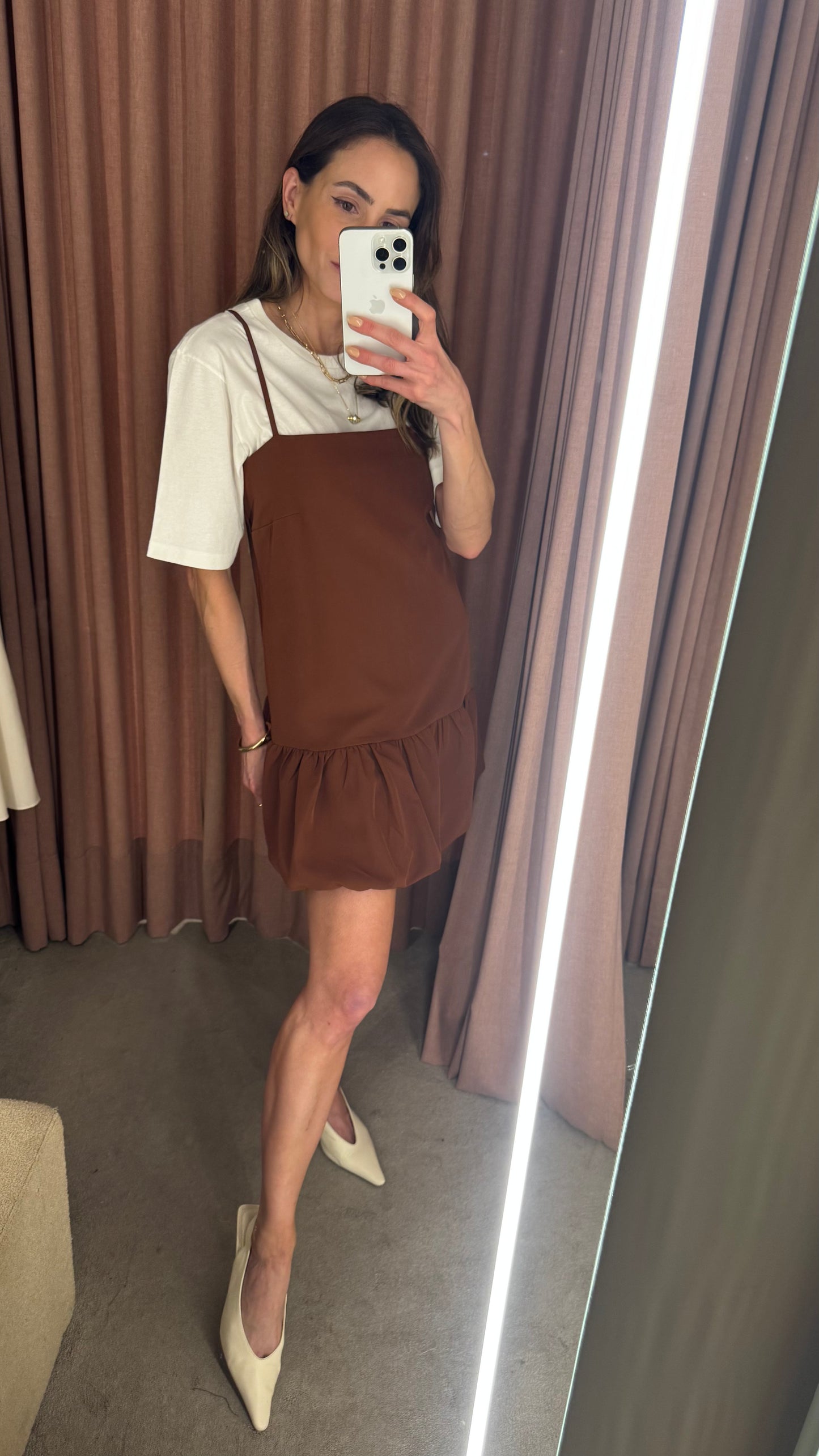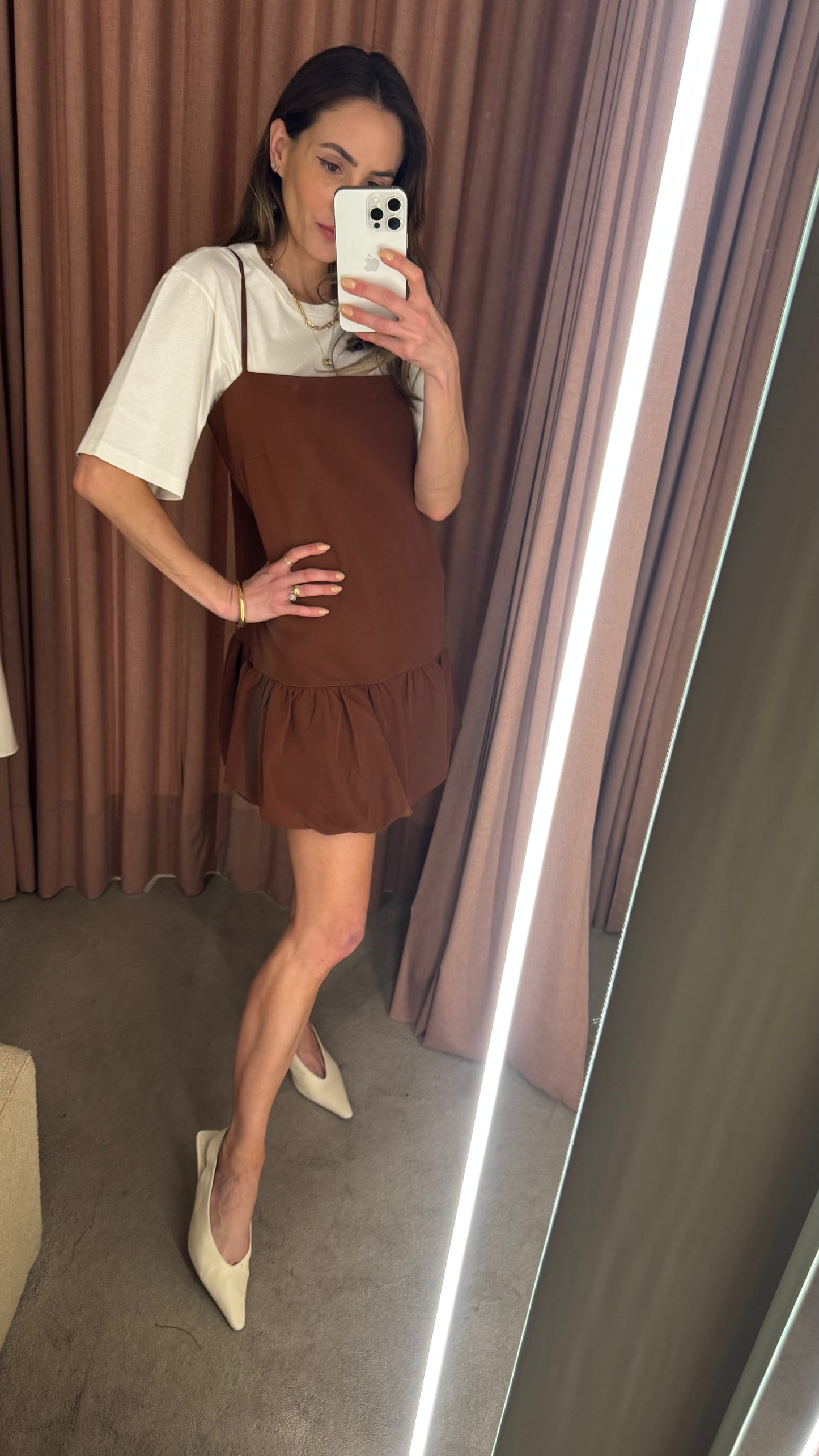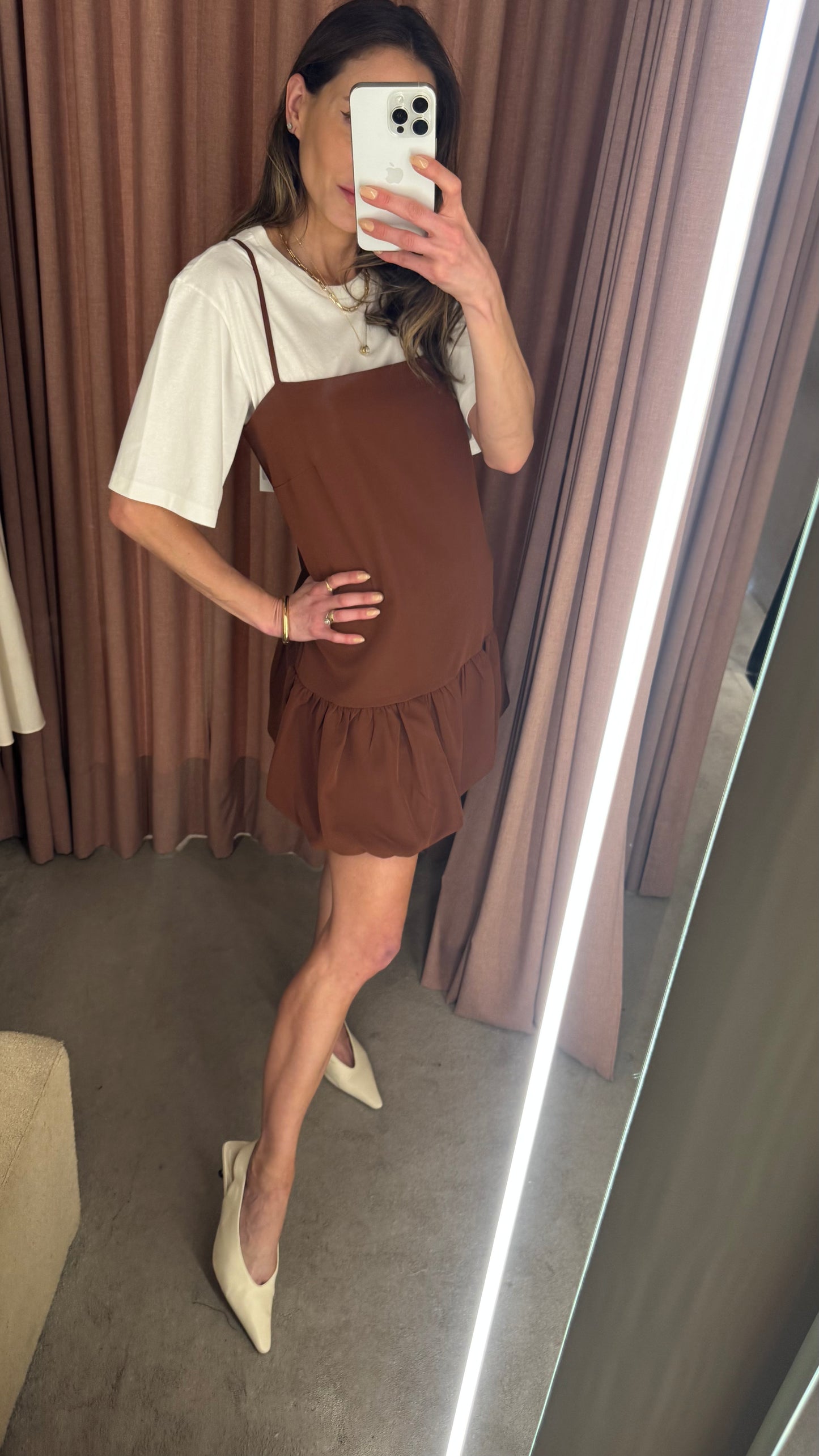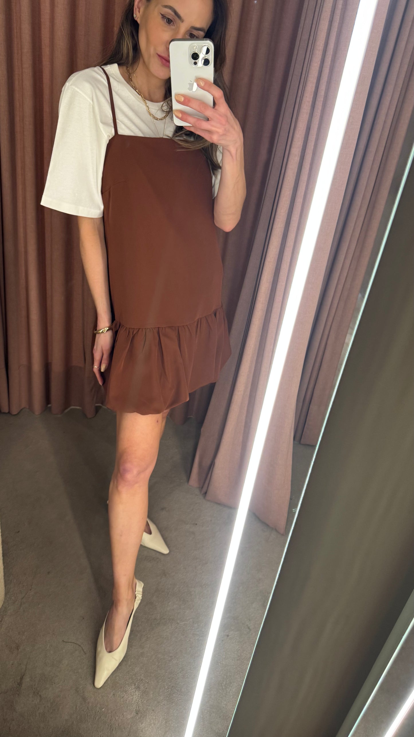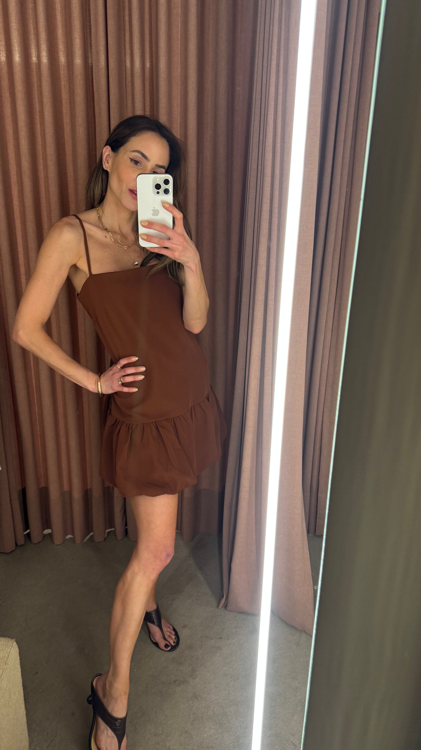Vestido curto em tom terroso sofisticado, com alças finas e decote reto que valoriza o colo com delicadeza. A modelagem balonê na barra adiciona volume sutil e movimento, criando um visual feminino e moderno. Ideal para produções que transitam do casual chic ao look noturno com poucos complementos. Uma peça versátil com personalidade e charme atemporal.