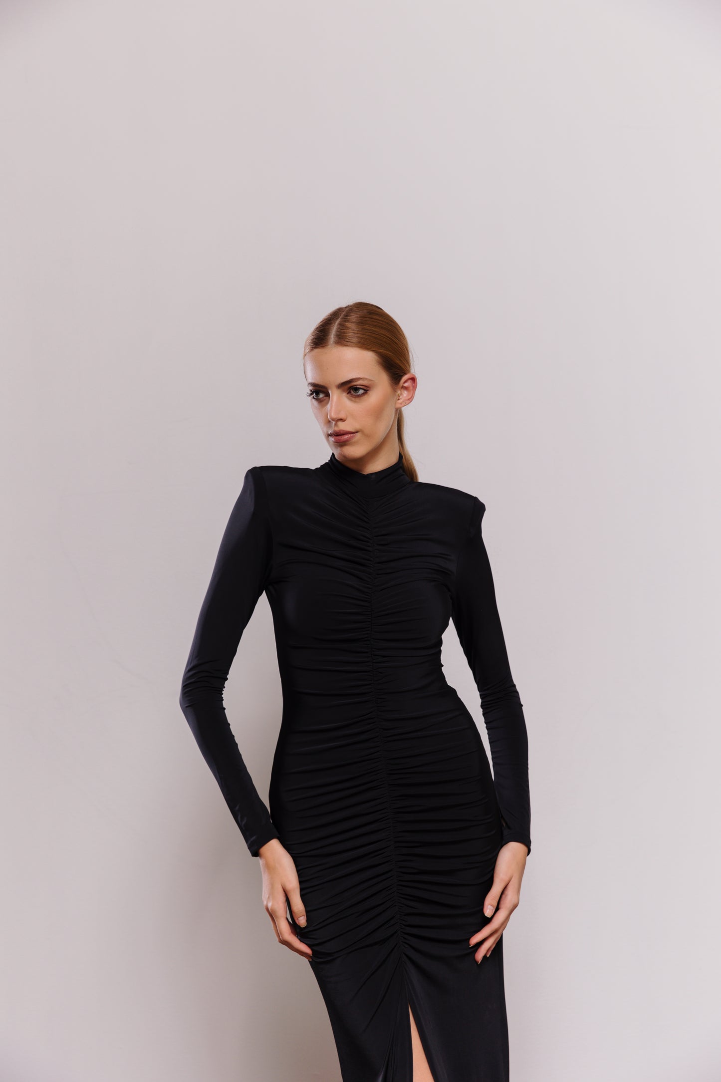 Diferencial da peça: O design é definido por um minucioso drapeado central que percorre toda a frente da peça, criando uma textura rica que valoriza as curvas de forma orgânica. As ombreiras marcadas trazem uma imposição moderna e arquitetônica, equilibrando perfeitamente com a fluidez da fenda profunda.
