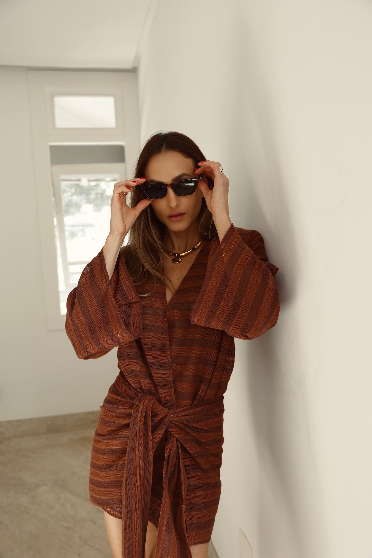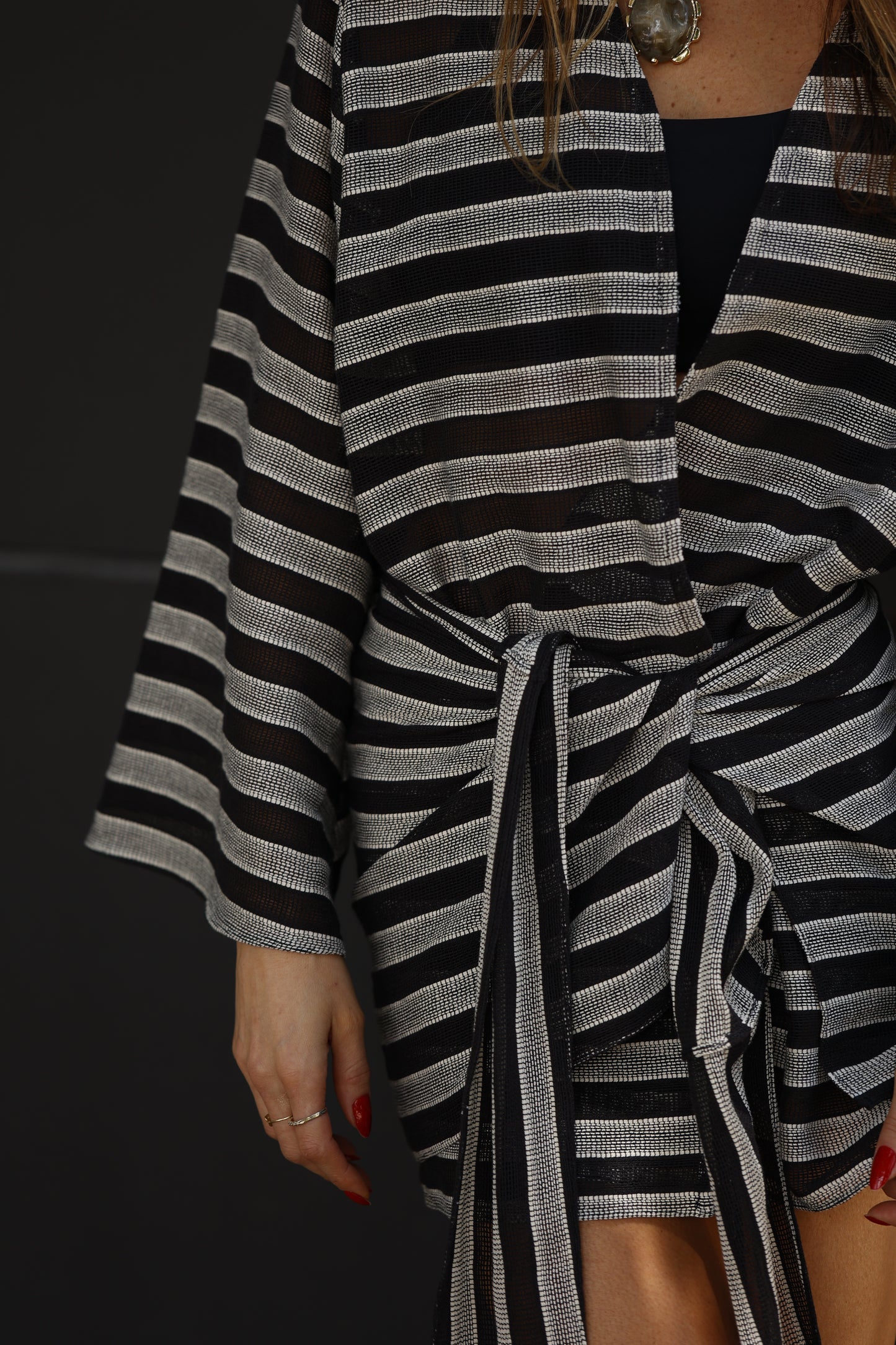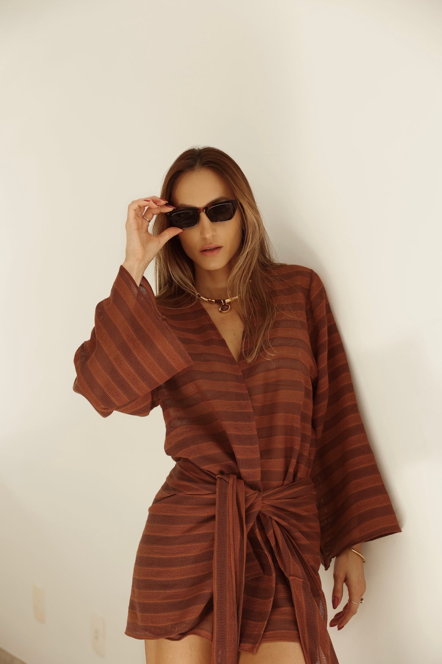 Kimono de corte reto com mangas amplas, combinado à pareô ajustável que valoriza o corpo com leveza.