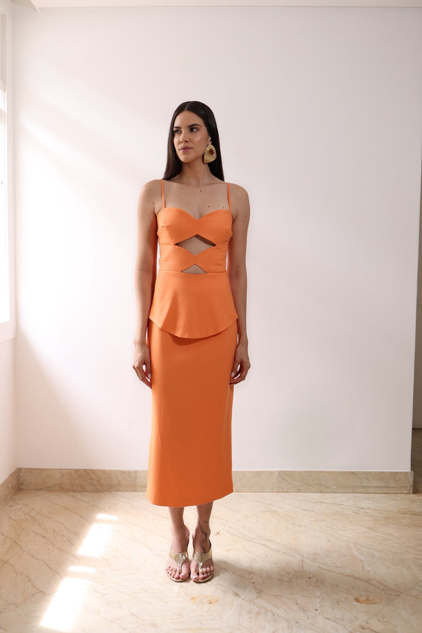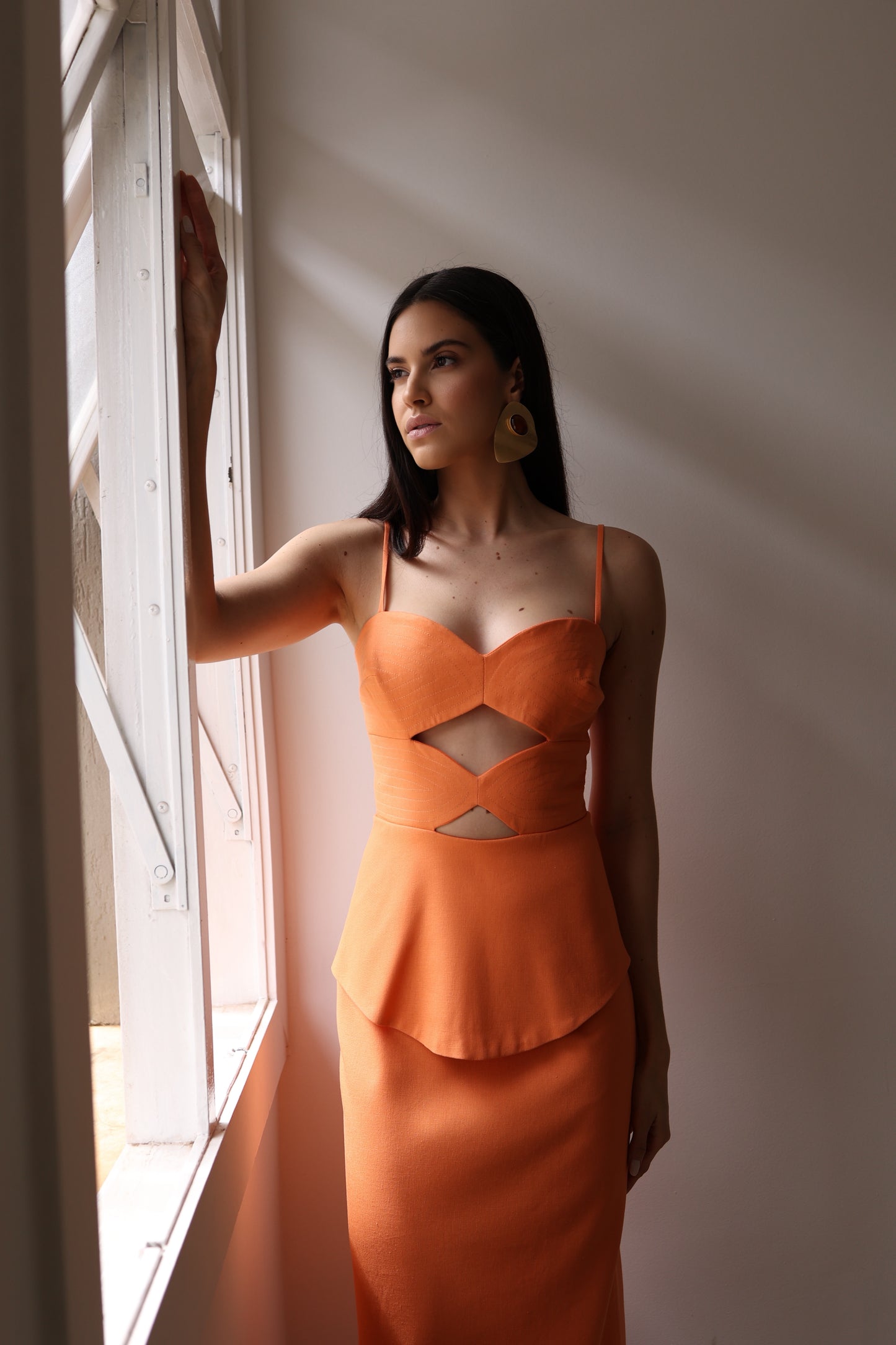 Vestido em tecido linho, com recortes estratégicos que valorizam a silhueta. Possui alças finas, detalhe peplum que traz feminilidade ao design, fenda posterior para maior conforto e zíper invisível nas costas. Uma peça elegante e marcante, ideal para produções especiais.