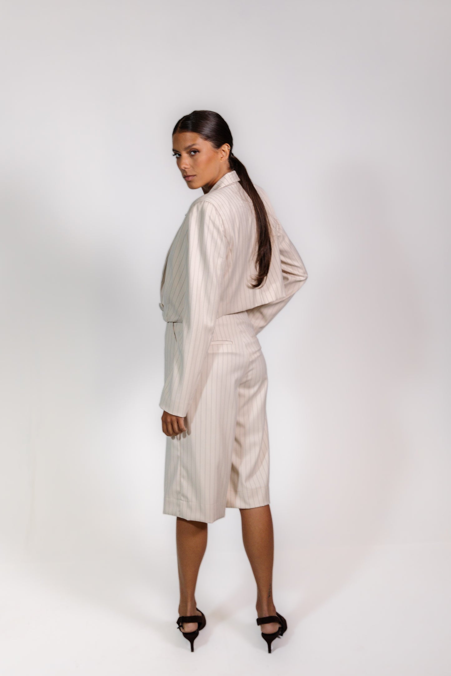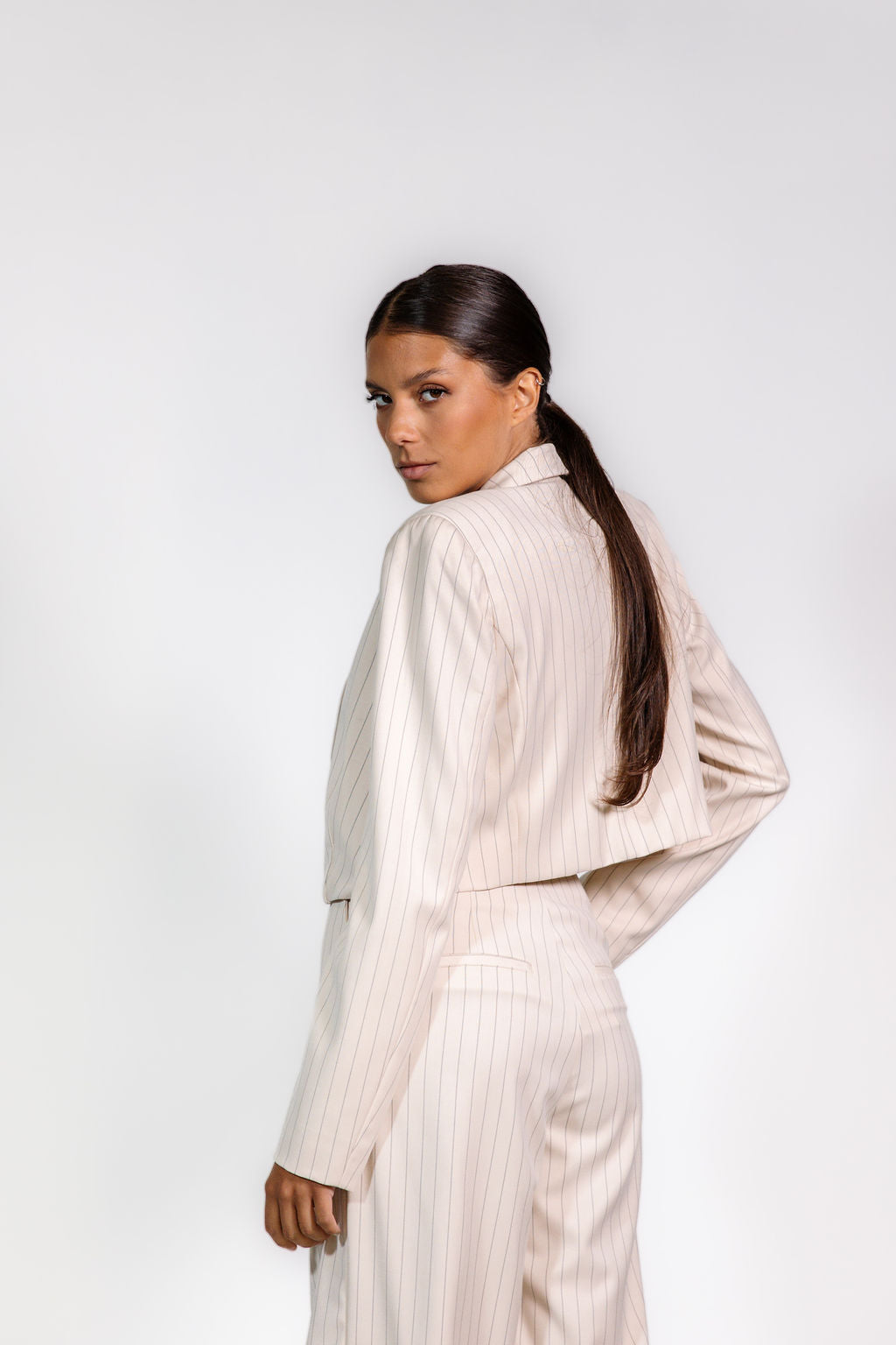 Alfaiataria repensada com leveza e precisão. O blazer cropped em listrado fino propõe uma silhueta moderna com apelo clássico. Com comprimento encurtado, abotoamento frontal com dois botões e mangas longas estruturadas, a peça equilibra proporções com elegância sutil. O tecido de listras delicadas reforça a sofisticação atemporal do tailoring, agora em uma versão atualizada e versátil — ideal para composições em camadas ou como protagonista em looks de presença discreta. Clássico com fôlego novo.