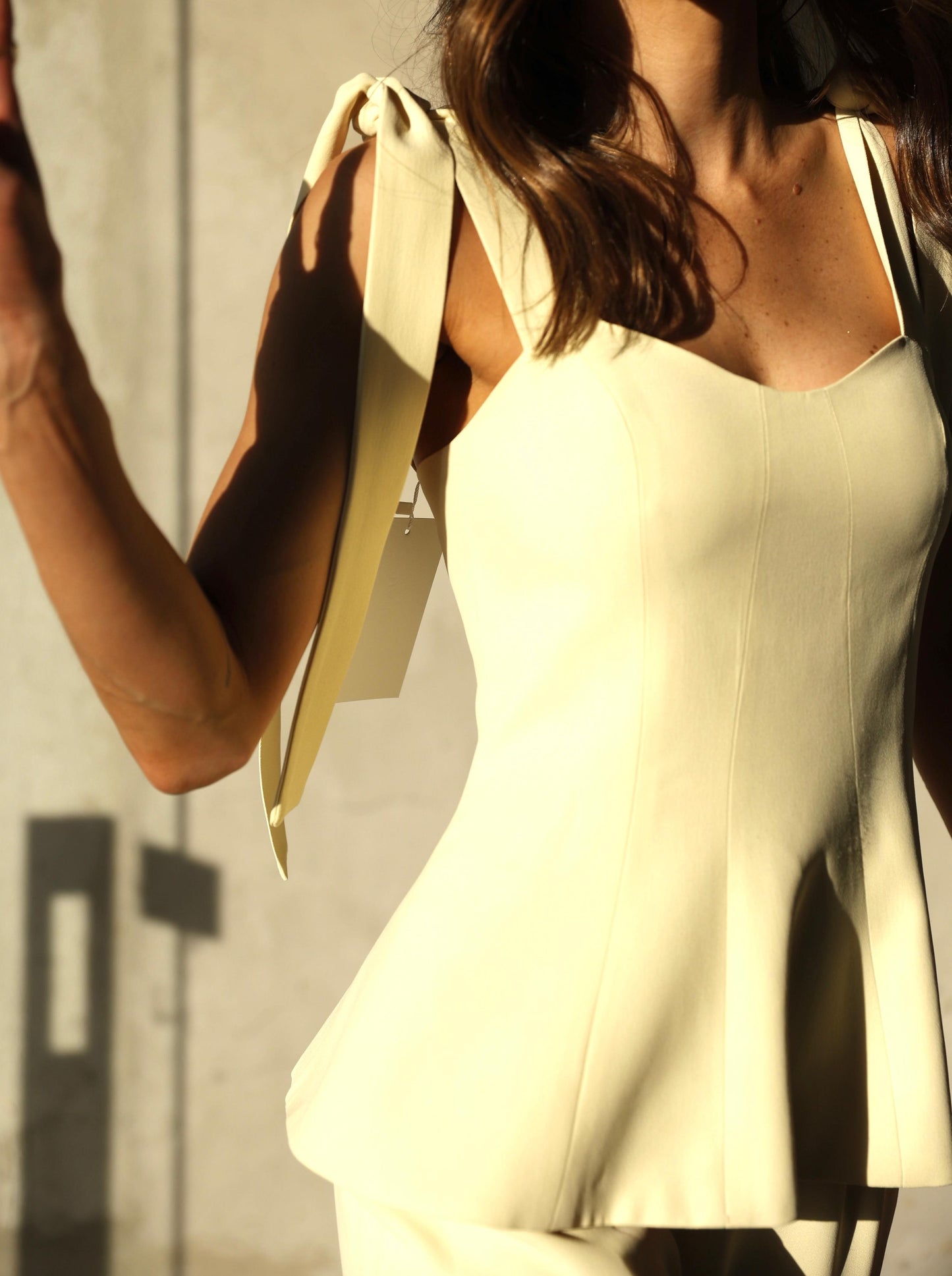 Sofisticação minimalista define aa blusa Bruna. Em tom sóbrio e elegante, é composto por alças largas de amarração e com recorte peplum garante caimento impecável e conforto absoluto. O tecido leve e fluido completa a proposta, sendo perfeito para dias mais quentes. Ideal para composições versáteis — vai do casual chic ao elegante com apenas a troca dos acessórios.