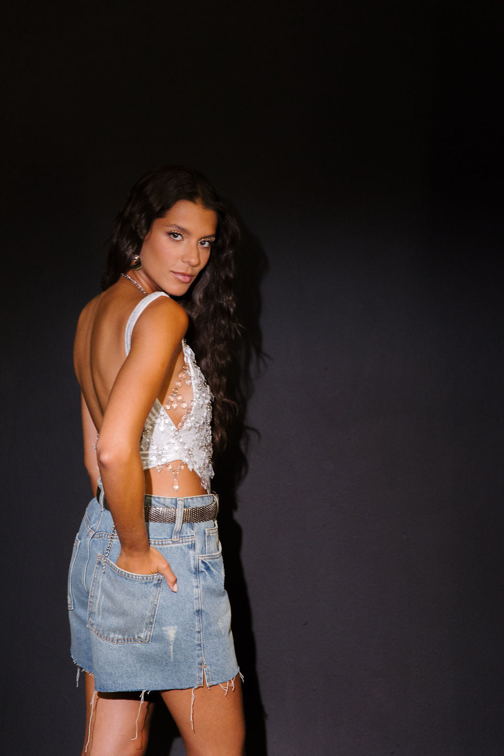 Blusa confeccionada em correntes delicadas, adornada com pedrarias em formato de gota que refletem a luz com elegância e sutileza. Sem franjas, o design valoriza a fluidez das correntes e o brilho refinado das pedras, criando uma peça moderna e sofisticada. Ideal para produções noturnas ou looks elegantes que pedem um toque de luxo discreto e contemporâneo.