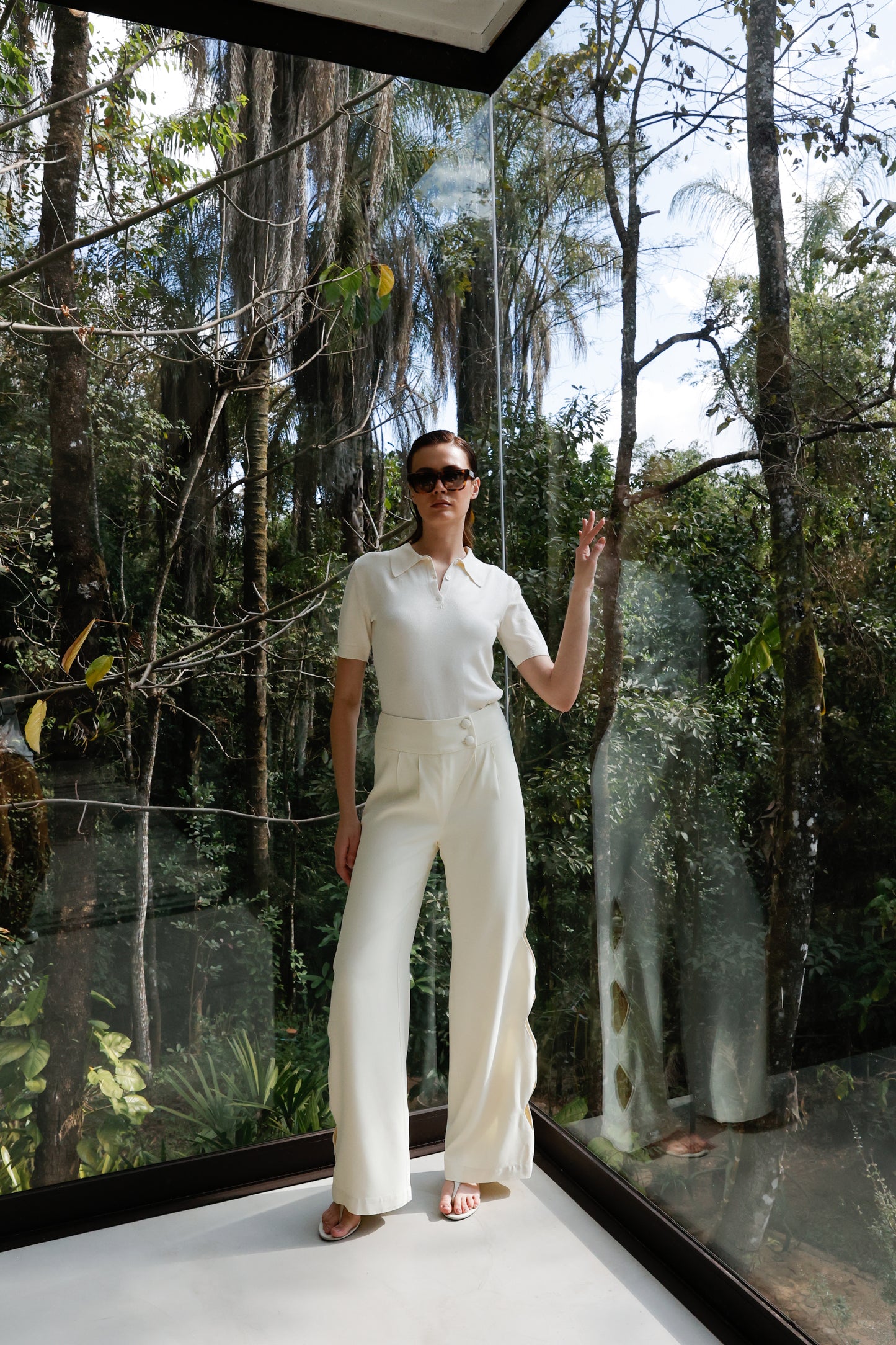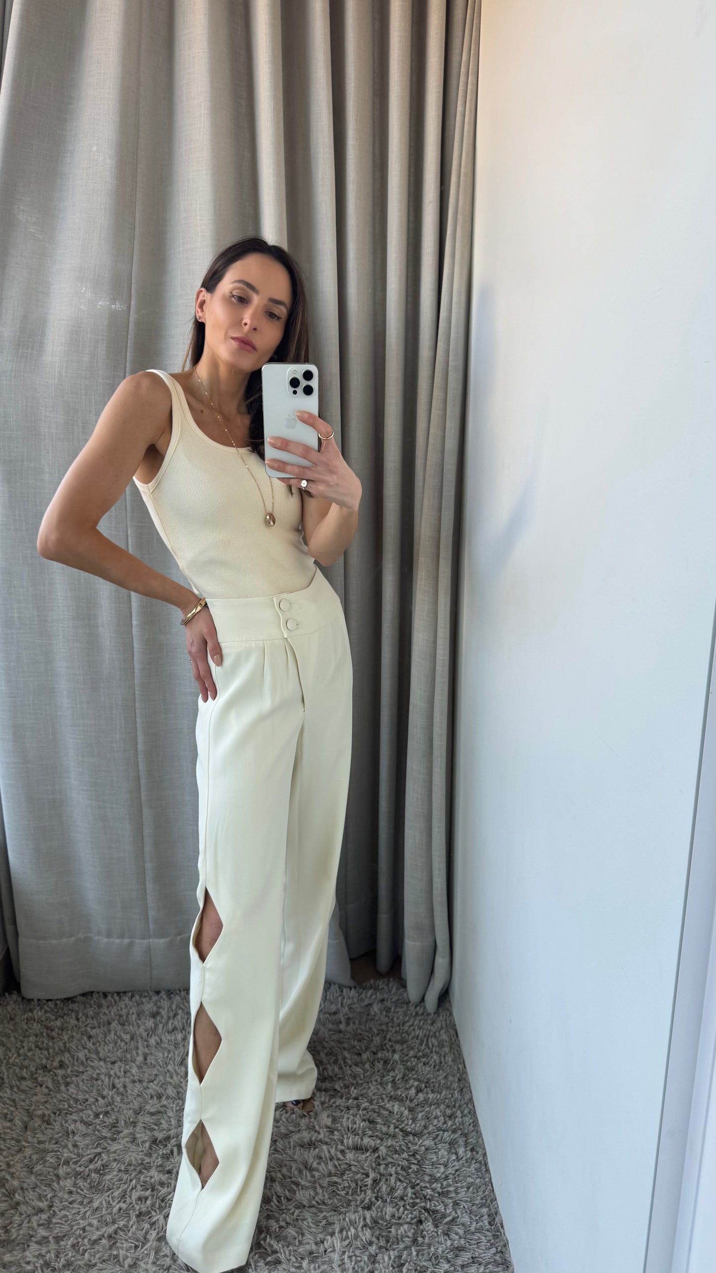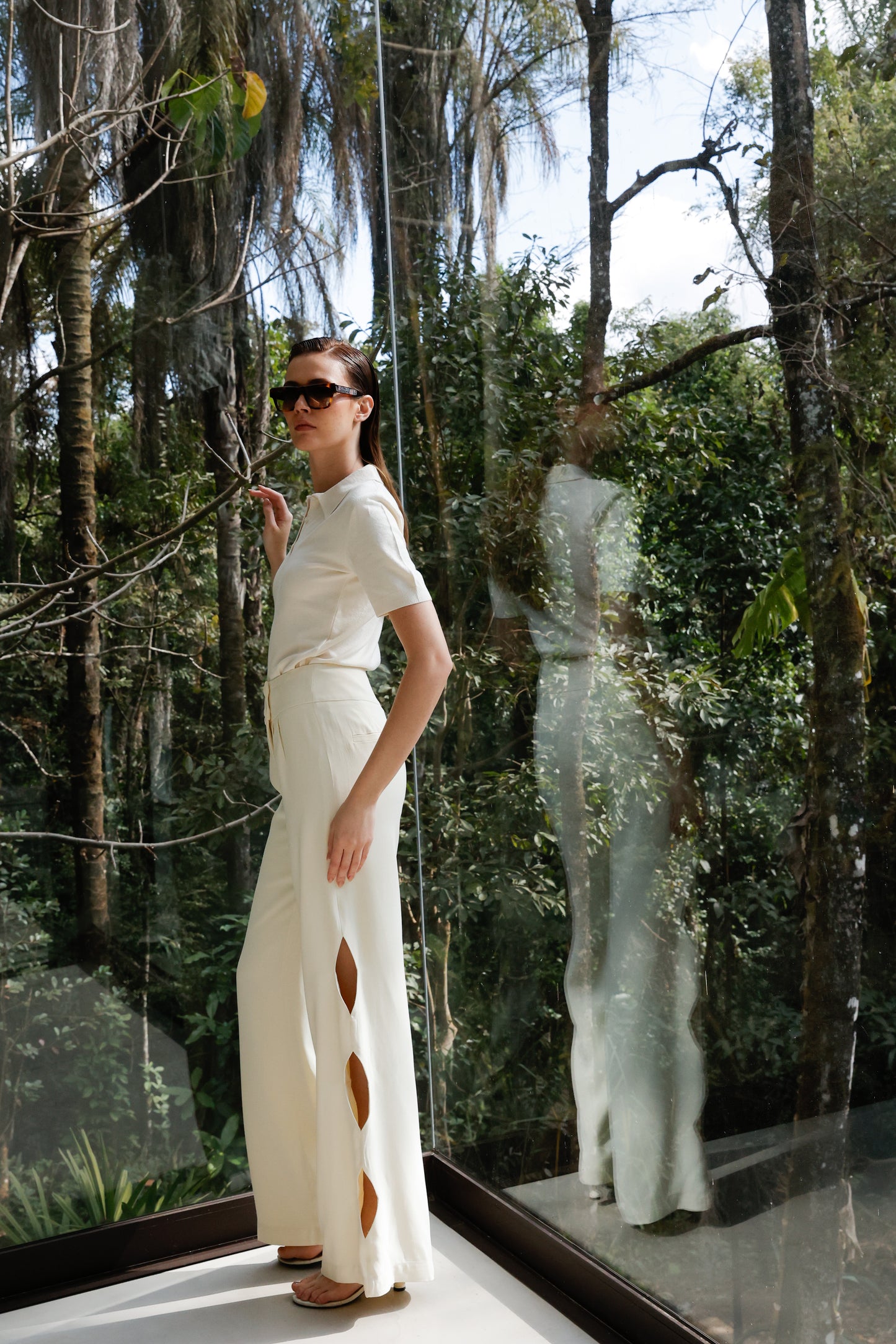 Com um shape reto impecável e cintura marcada, esta calça eleva o clássico da alfaiataria a um novo patamar. O grande diferencial fica por conta dos recortes geométricos laterais, que adicionam leveza visual e revelam a pele na medida certa, criando um contraste moderno e inusitado. Confeccionada em tecido encorpado com toque macio, a peça garante caimento perfeito e elegância sem esforço.