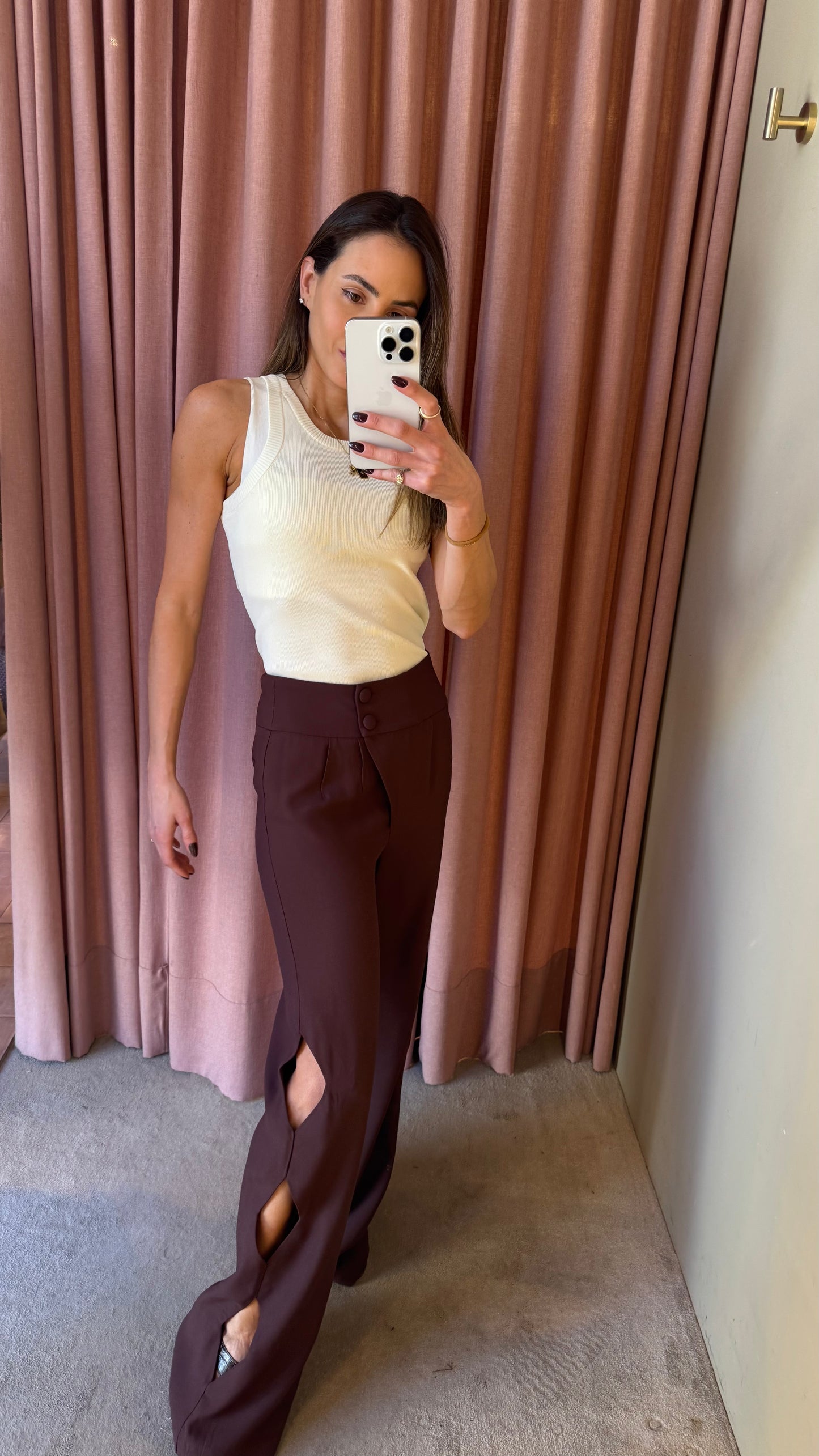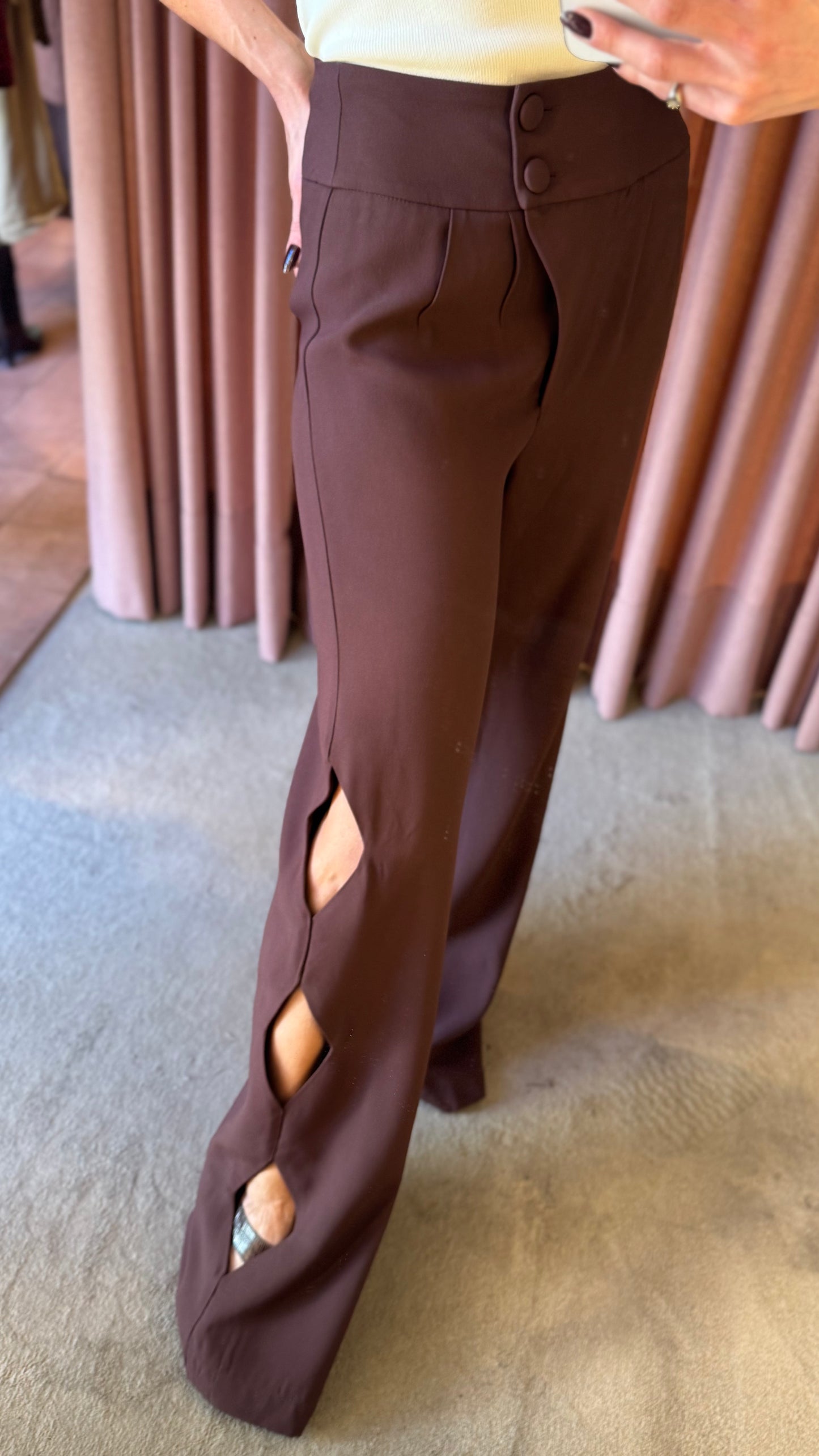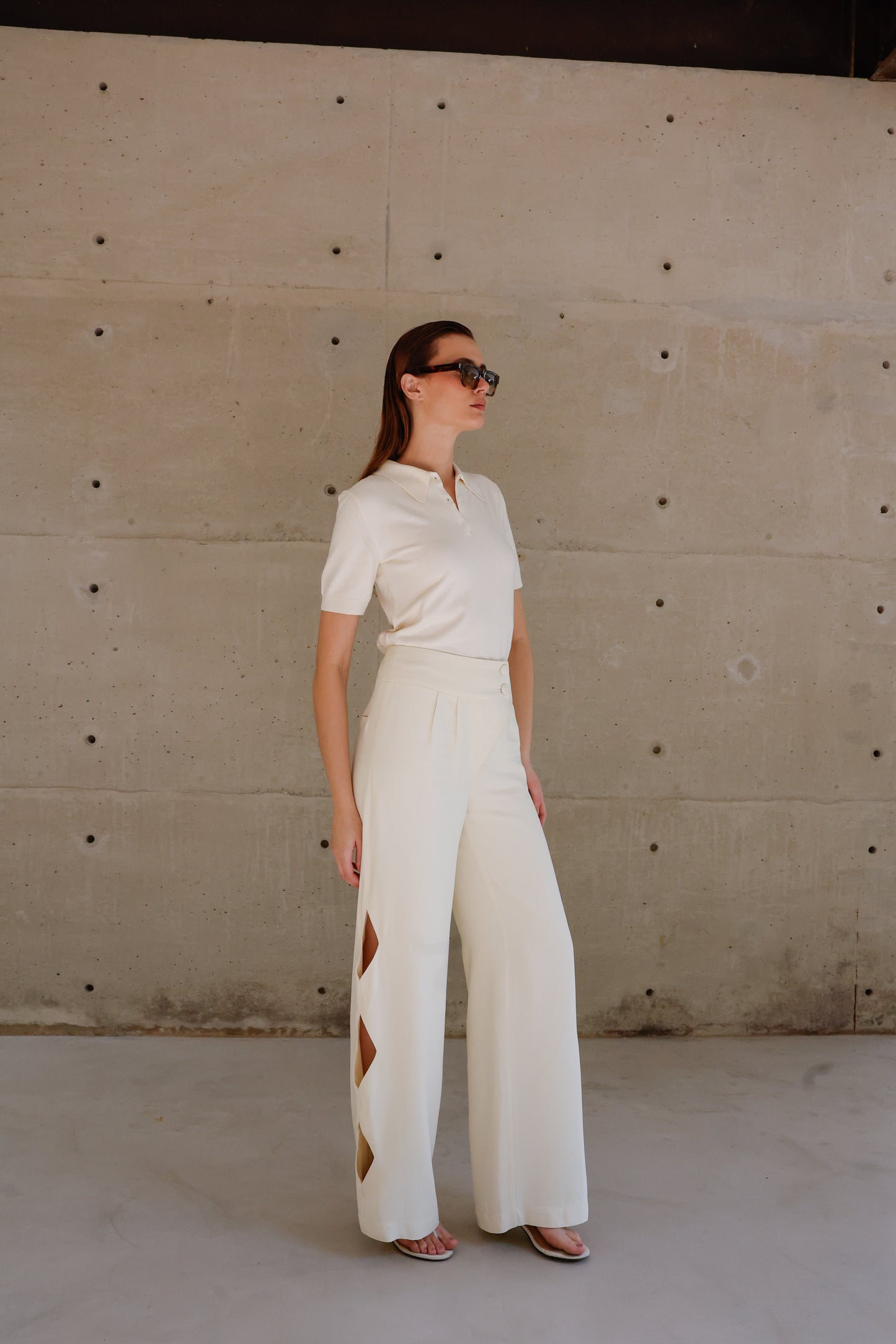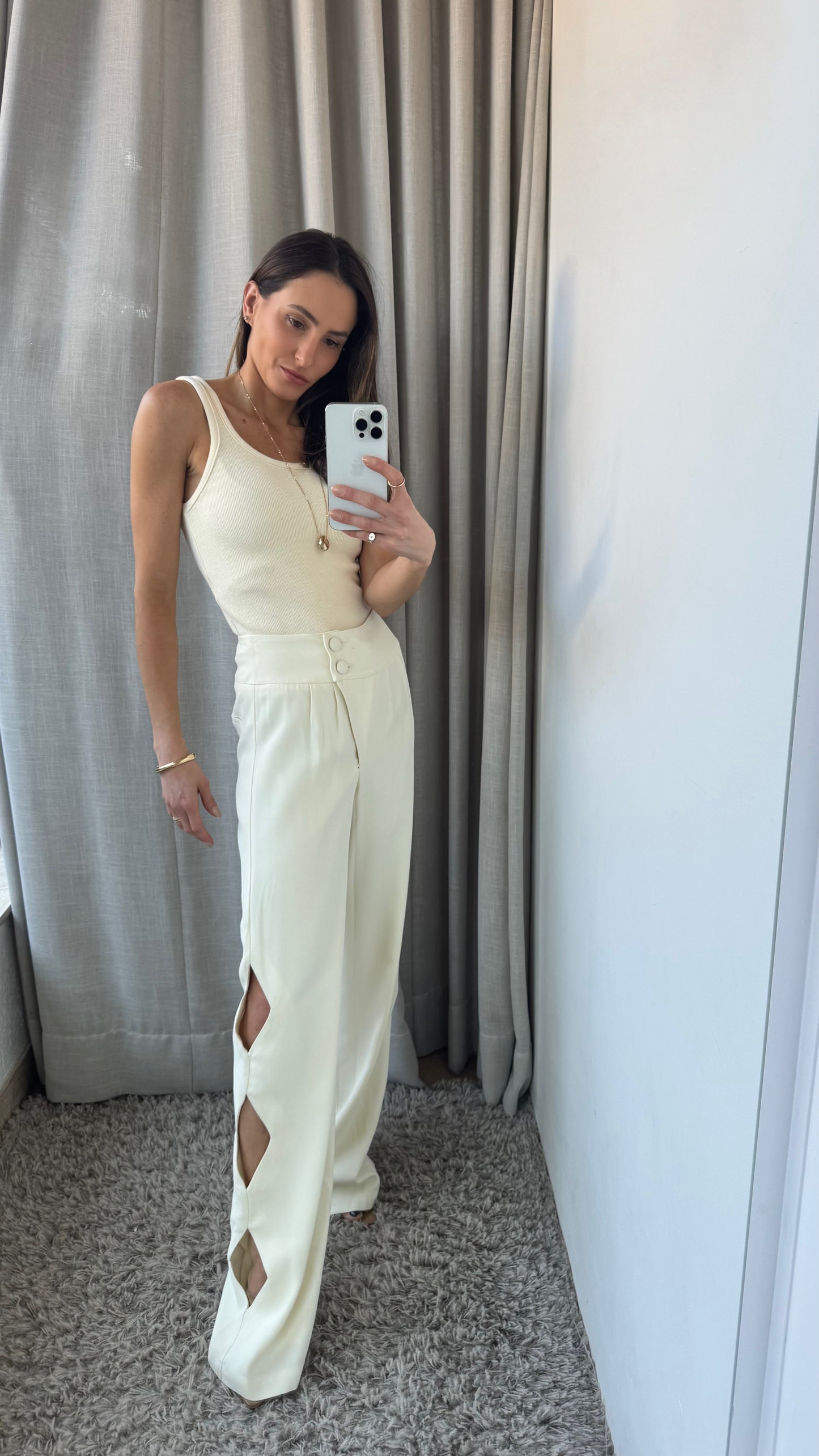 Com um shape reto impecável e cintura marcada, esta calça eleva o clássico da alfaiataria a um novo patamar. O grande diferencial fica por conta dos recortes geométricos laterais, que adicionam leveza visual e revelam a pele na medida certa, criando um contraste moderno e inusitado. Confeccionada em tecido encorpado com toque macio, a peça garante caimento perfeito e elegância sem esforço.